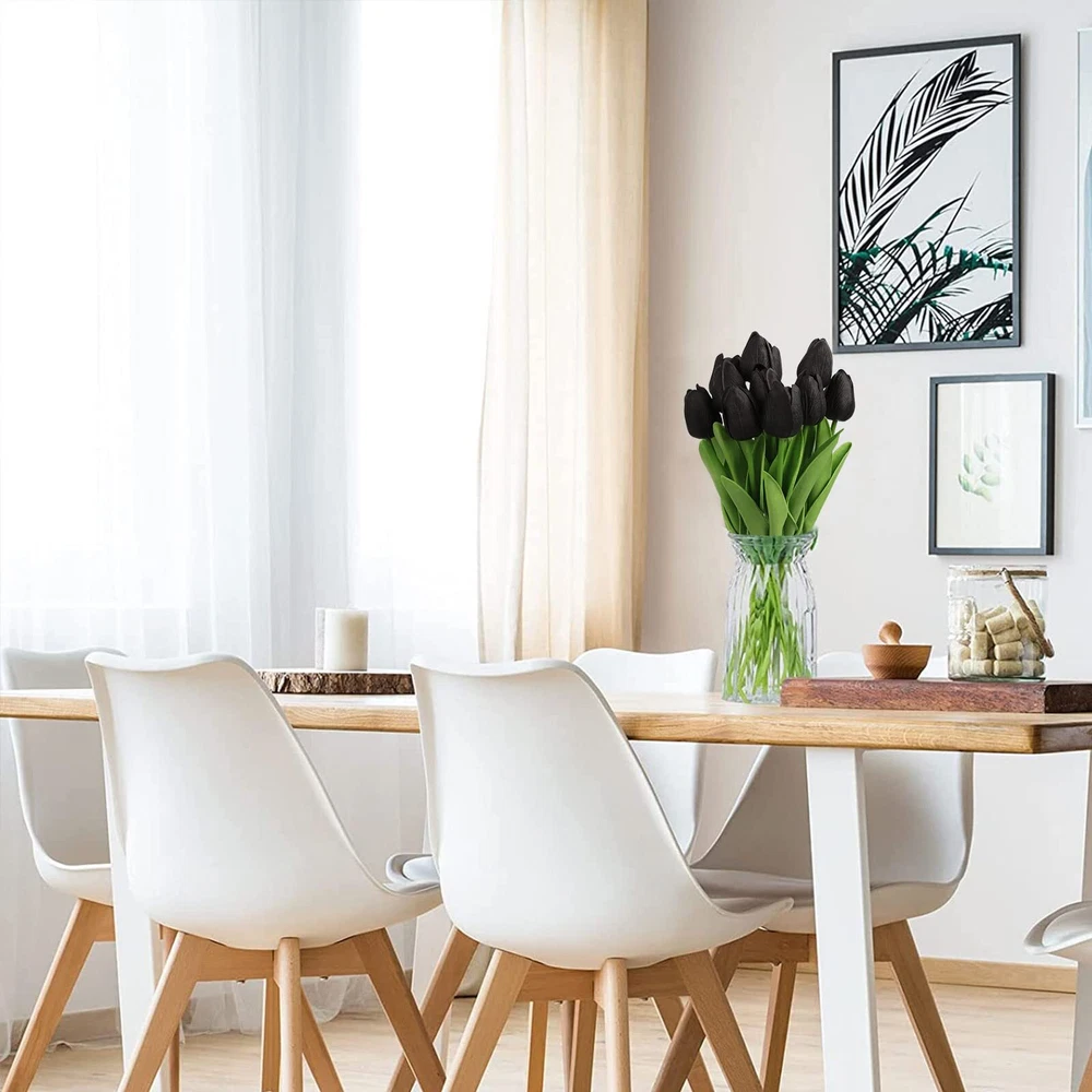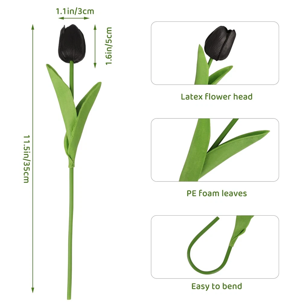 Realistic Appearance: Our artificial tulips are designed to look just like the real thing, with vivid colors and lifelike textures that will fool even the most discerning eye. Versatile Decor: With their elegant and timeless design, these black flowers are perfect for a wide range of decorating styles, from modern to classic. Use them to brighten up your home or office, or to add a pop of color to your outdoor space. Flexible Stem: Our beautiful tulips feature flexible stem that allows you to easily arrange and adjust them to suit your needs. Whether you want to create a tall centerpiece or a low-lying arrangement, these tulips can be easily customized to fit your vision. Low Maintenance: Unlike real tulips, these artificial flowers require no watering, pruning, or sunlight, making them a hassle-free choice for busy homeowners or those with allergies to real flowers. Well Made: We only use premium PU materials to create our flowers, ensuring that they will stand the test of time and maintain their beauty for years to come. From the realistic petals to the sturdy stem, every detail has been carefully crafted to create a premium product that you will be proud to display in your home.