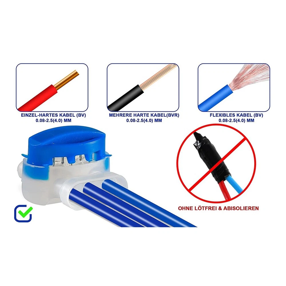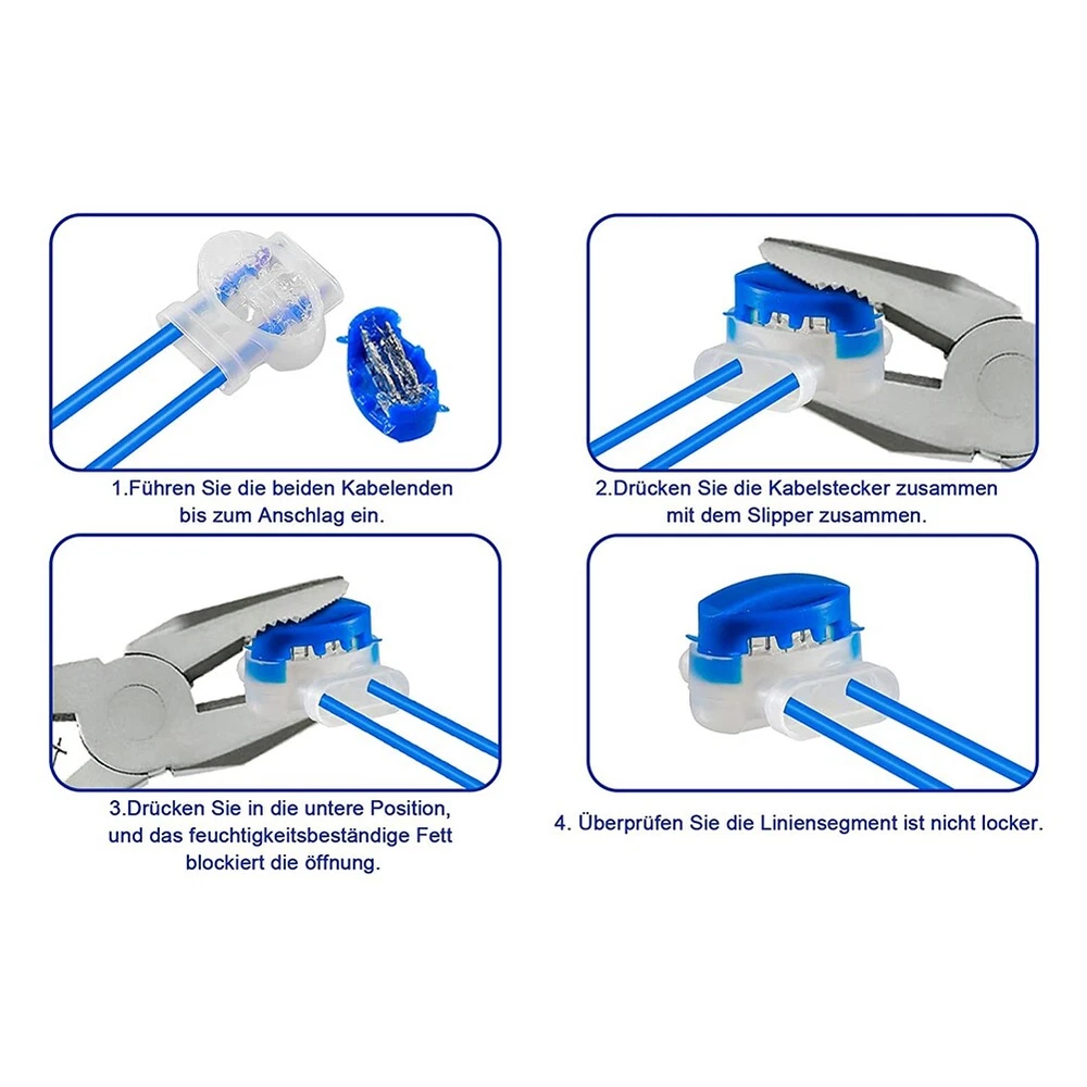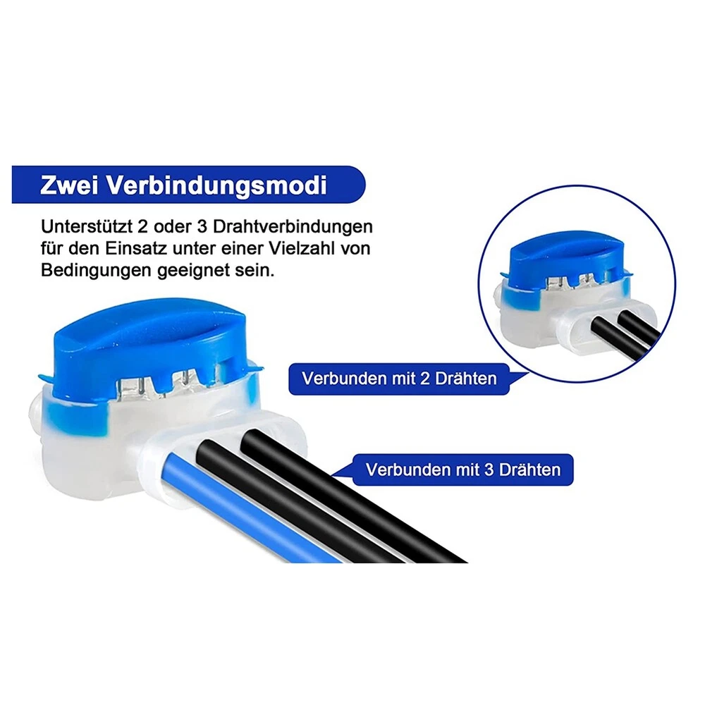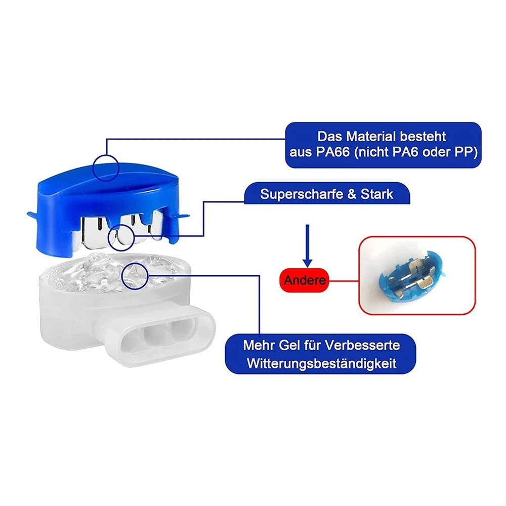 30PCS Cable Connectors for Robotic Lawnmowers, Connection Cable Wire5685 High-quality material: The cable connector set is filled with gel, which is flame-retardant, waterproof, and moisture-proof, which can form an airtight environment with higher and a firm connection. We've put more gel in the cable connector to further improve weather resistance. Practical Cable Connector: The cover is very strong, not easy to break, and has better insulation. With cable connectors, the cable ends of the boundary lines can be easily connected. It is an perfect spare parts accessory for mowing robots. EASY AND SAFE: No solderless and stripping required. Just plug in the wires and press down on the connector with pliers. The cable connector has 3 holes and supports 2 or 3 wire connections. Insert of the cable as far as it will go, then use the pliers to press down on the blue part to secure and connect the wire. Compatible with all mowing robots: The cable connector has excellent compatibility for 0.65mm to 1.63mm (22-14 AWG) wire diameter. Cable connectors fit all models of standard lawn robots, e.g. , , etc. Wide range of applications: not only suitable for lawn mower robots, but also as a clamp for outdoor cables and wires. Widely used in lighting, power supply and automobile wiring, household appliances and mechanical wire connections, etc. Colour:Blue Material:PP+PC+PB Package Contents: 30 * Wire connector