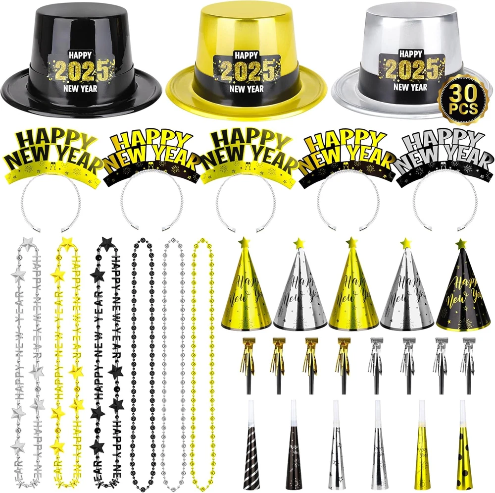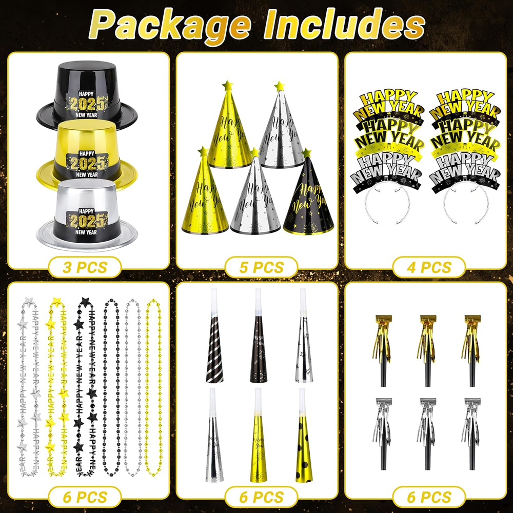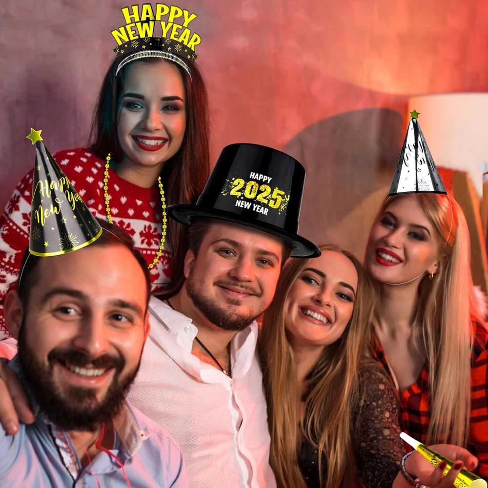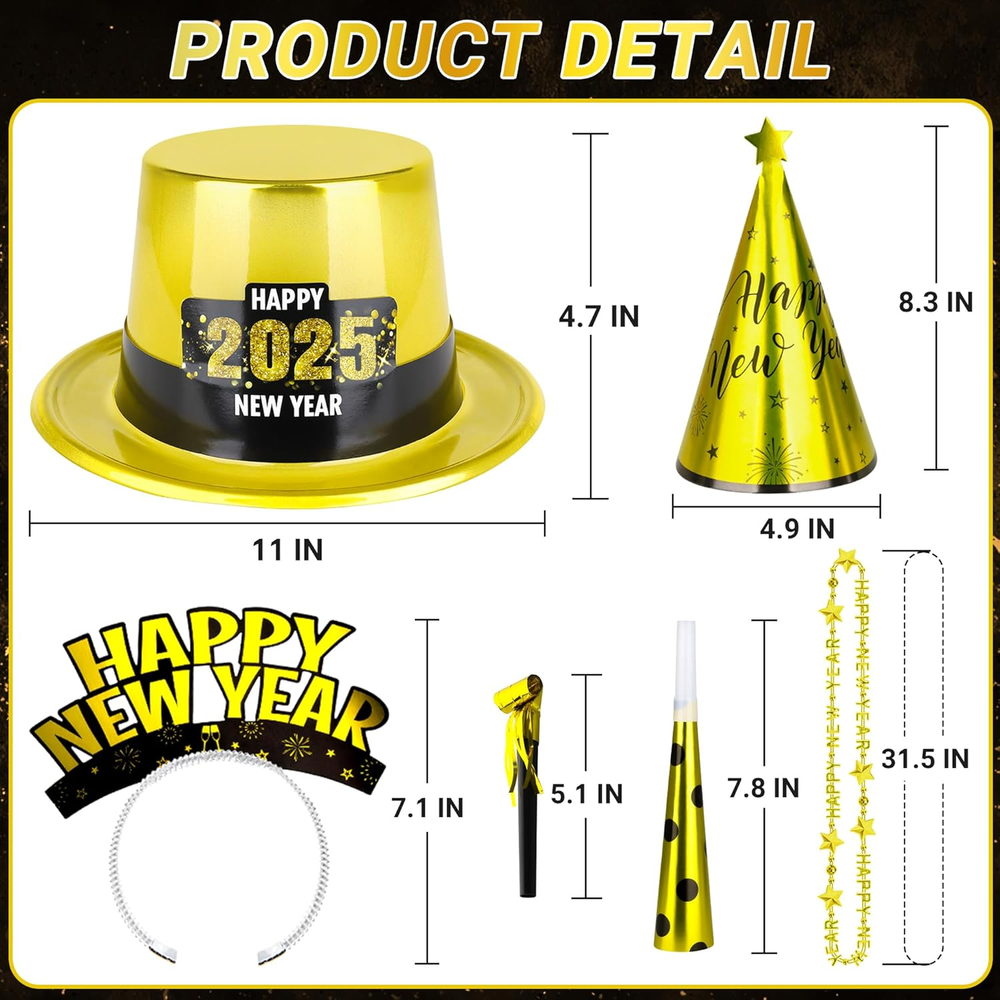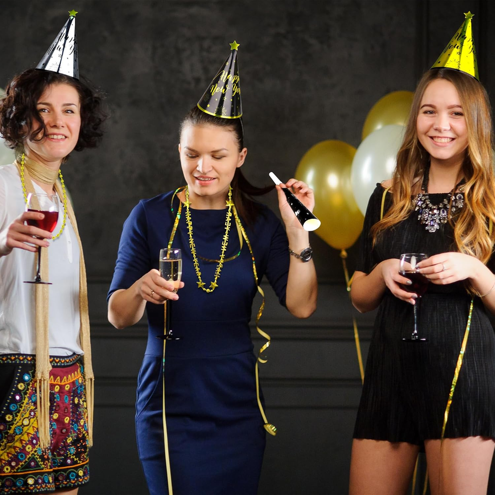 More Variety - You will have enough New Years Eve party supplies for 12 people for a total of 30pcs, including 3 hats, 6 tassel noise makers, 6 horns, 6 necklace, as well as tiaras and taper caps. Our set contains everything you need for your party. Superior Material - New Years party supplies are made of plastic and cardboard. These make the horn sturdy and crisper, and these can also make the hat more comfortable to use. Universal Size - The NYE party favors have universal sizes. The hat size is 11×4.7 inch, and the cone hat is 4.9×8.3 inch, both sizes are suitable for most people. The size of the noise maker is 1.4×7.8 inch, which is just right in your hand. Simple to Use - In order to keep the NYE hat working better, you will need to do a part of the assembly. Simply snap the edge of the cone hat into the card slot and tie the cord. Then you can use it. Wide Usage - Happy New Year party kit can be used on many occasions, not only for New Year's parties, but also for Christmas, birthdays, and various types of parties. It can also be paired with other party supplies. Product Description 1 NYE Party Favors Basics 2 NYE Party Favors Top Hat 3 NYE Party Favors Necklace New Years Eve Party Favors Add to Cart Add to Cart Add to Cart Add to Cart Add to Cart Add to Cart Add to Cart Price $29.99 $ 29 . 99 $44.99 $ 44 . 99 $79.99 $ 79 . 99 $27.99 $ 27 . 99 $39.99 $ 39 . 99 $24.99 $ 24 . 99 $39.99 $ 39 . 99 Quantity 48PCS 96PCS 200PCS 40PCS 60PCS 30PCS 100PCS Number 24 Guests 48 Guests 100 Guests 20 Guests 30 Guests 12 Guests 50 Guests Color Gold, Silver, Black Gold, Silver, Black Gold, Silver, Black Gold, Silver, Black Gold, Silver, Black Gold, Silver, Black Gold, Silver, Black Product Kinds 5 5 5 5 5 6 5 Hat Type Round Hat Round Hat Round Hat Top Hat Top Hat Round Hat Round Hat Hat Material Plastic Plastic Plastic Cardboard Cardboard Plastic Plastic Necklace Included ✘ ✘ ✘ ✘ ✘ ✔ ✘