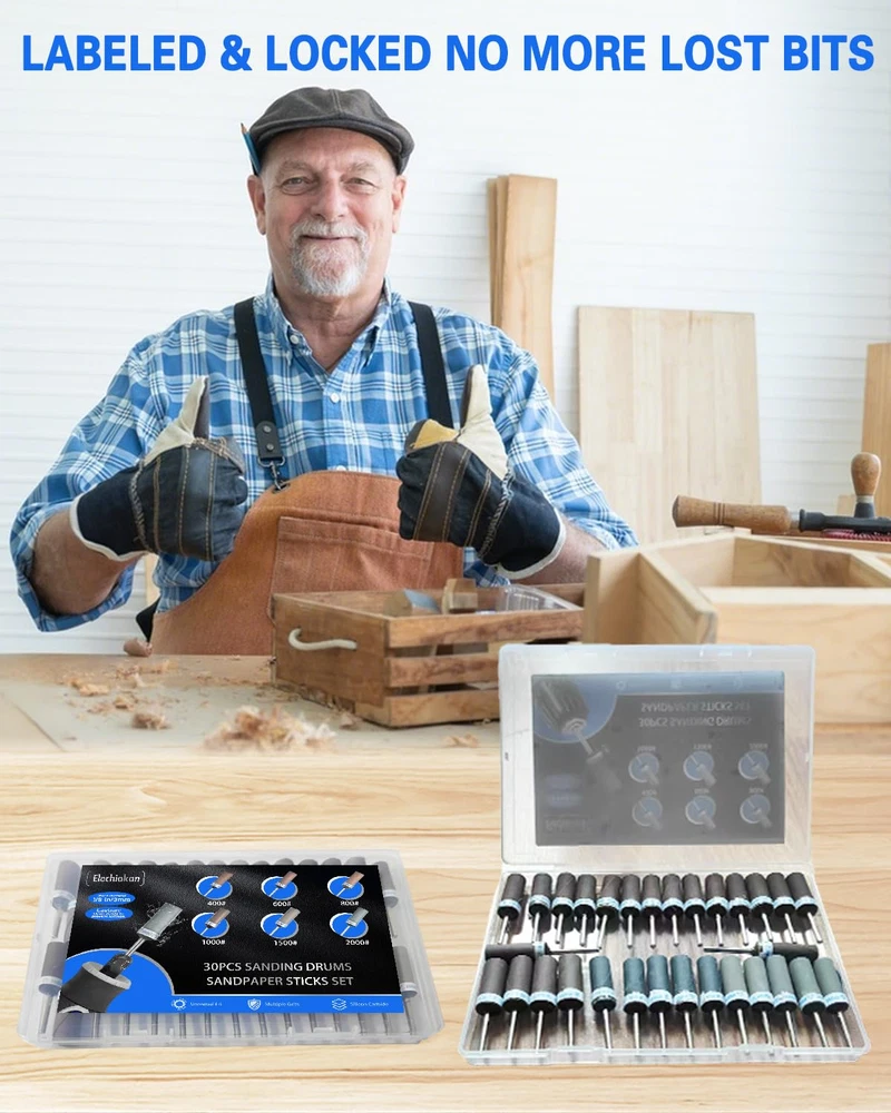 Scientifically-Optimized Grit Progression:30PCS sanding drums for dremel with 400/600/800/1000/1500/2000 grit (5PCS each), scientifically graded for 6-stage grit system. This research-backed grit progression handles every stage, from rough shaping to final finishing - delivering superior results Upgraded Adhesive Base: Tightly wound sanding bands with reinforced glue ensure longer lifespan. Simply peel off worn layers of sanding discs to reveal a fresh polishing surface, reducing the expense and waiting time of frequently replacing sanding heads Electric Sanding at Warp Speed: For dremel tool accessories fits all 1/8 inch shank rotary tools, like for Dremel 3000/4000, etc. Electric sanding is 10X faster than manual work! Just insert, tighten, and start sanding sticks for grinding plastic models plastic, stone, or metal effortlessly Wet and Dry Use – Safely polish wet surfaces like ceramics or dry sand wooden models, 400-2000 Grit From Rough to Mirror Finish! Perfect for DIY crafts, automotive repairs, and jewelry making Complete Grit Kit Goes Anywhere: Includes storage box and labels, easily sort and access for Dremel sanding drums, organized by grit. Compact design fits in toolboxes, take your sanding kit anywhere—workshop, job site, or on the go Product Description The video showcases the product in use. The video guides you through product setup. The video compares multiple products. The video shows the product being unpacked. What is the Kit Include? Merchant Video MAYBE THE ONE YOU’RE LOOKING FOR Add to Cart Add to Cart Add to Cart Add to Cart Add to Cart Add to Cart Add to Cart Customer Reviews 4.4 out of 5 stars 10 4.4 out of 5 stars 21 4.2 out of 5 stars 17 5.0 out of 5 stars 9 4.0 out of 5 stars 13 4.4 out of 5 stars 143 4.4 out of 5 stars 134 Price $20.99 $ 20 . 99 $17.99 $ 17 . 99 $11.67 $ 11 . 67 $29.99 $ 29 . 99 $16.99 $ 16 . 99 $17.99 $ 17 . 99 $15.97 $ 15 . 97 Package 30 PCS 10 PCS 60 PCS 136 PCS 294 PCS 268 PCS 140 PCS Shank Diameter 1/8 Inch 1/8 Inch 1/8 Inch 1/4 Inch 1/8 Inch 1/8 Inch 1/8 Inch Disc Diameter — — — 2 Inch 1 Inch 1 Inch — Component Silicon Carbide High-speed Steel Aluminum Oxide/Silicon Carbide Aluminum Oxide/Silicon Carbide Aluminum Oxide Silicon Carbide Wool Buffing Wheels Applications DIY crafts, jewelry making Wood, stone, ceramics, jade Deburring cut metal edges Remove rust, paint, and burrs Wood, rubber, leather, plastic Metal, resin wood, glass opals Hinges, edges, and corners