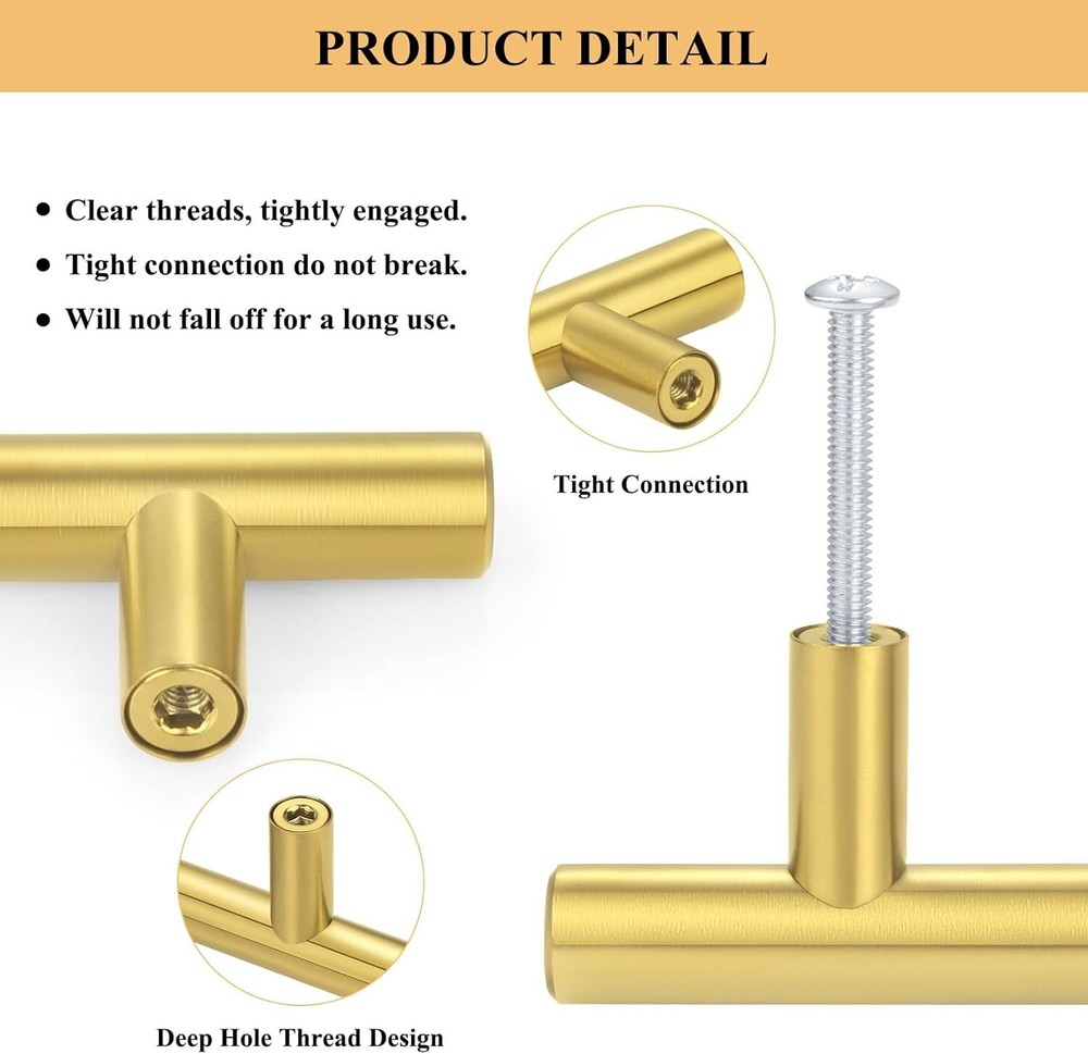 About this item PREMIUM MATERIAL: Plustool Gold Cabinet Handles are made of high-precision quality stainless steel with perfect brushed brass finish, which do not leave any fingerprint; The flat surface of dresser handles is smooth without losing texture, not easy to fade,rust,oxidation and easy to clean; Durable and strong, elegant addition to any home SAFE DESIGN OF ROUNDED EDGES: The modern euro round style pulls are designed of round body; Compared with the square handles, the round edges design is safer and prevents scratching, which makes the drawer pulls feel more comfortable in use; In addition,the pulls base adopts high-precision drilling technology, and the deep spiral design is much stronger MEASUREMENT: Hole Centers: 3 inch(76mm), Overall Length: 5 inch(127mm),Height: 1.2 inch(32mm),Diameter: 0.4 inch(12mm) You will receive 30PCS cabinet handles, each handle in the box is individually wrapped to avoid scratching during shipping TWO SIZES SCREWS: We offer 1" and 1.57" screws that help you to fit different thickness of the furniture; Matched with 4 screws( 2 x 1'' and 2 x 1.57'') per handle WIDELY COMPATIBLE: Suitable for different styles of cabinets, use these gold hardware to decorate your cabinets or update some old furniture,bring you a modern look; Very stylish and unique. Ideal for kitchen, bathroom, bedroom, cabinet, drawer, dresser, door, cupboard, wardrobe, closet; Smooth and clear stainless steel handles, great helper to pull out drawer soon and conveniently Shipping We offer FREE shipping on all orders! We ship within Three business days of payment, usually sooner. We use a selection of shipping services such as UPS, FedEx, USPS etc. We only ship to the lower 48 states, no APO/FPO addresses or PO Boxes allowed. Local pickups and combined shipping options are not provided at this time. Return You can return a product for up to 30 days from the date you purchased it. Any product you return must be in the same condition you received it and in the original packaging. Please keep the receipt. Payment We accept payment by any of the following methods: PayPal Please pay as soon as possible after winning an auction, as that will allow us to post your item to you sooner! Feedback Customer satisfaction is very important to us. If you have any problem with your order, please contact us and we will do our best to make you satisfied. Contact Us If you have any queries, please contact us via ebay. We usually respond within 24 hours on weekdays. Please visit our eBay store to check out other items for sale! Thank you for shopping at our store. Disclaimer We are working with different suppliers in USA to deliver the item to your doorstep. If you have any issues regarding the item, Feel free to ask.