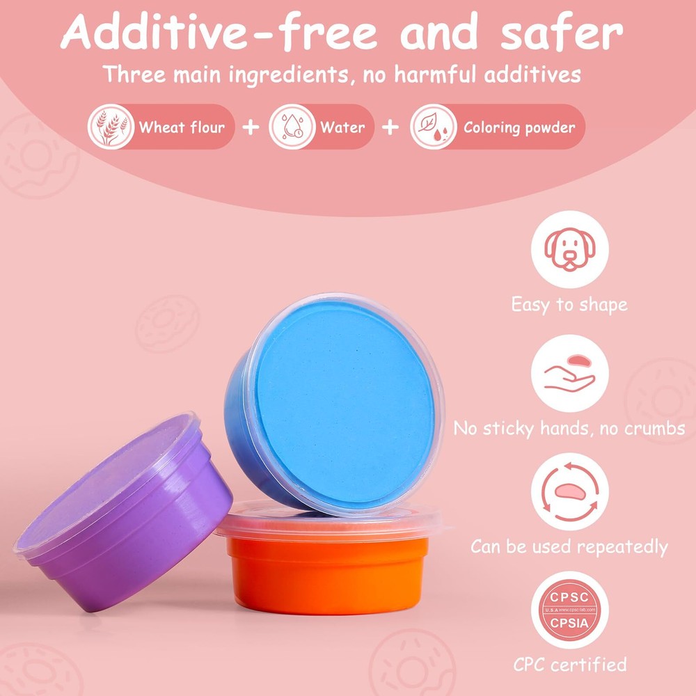 🍩UNIQUE DESIGN: Set includes 30 playdoughs (10 colors), 30 Valentine's Day cards (5 styles), 30 stickers, and 30 opp bags. The cards are in the style of a donut, where you put a round sticker on the round lid of the playdough, and then tuck the playdough into the hole in the middle of the donut, and the cards are fun with sweet puns about the donut or the playdough! 💖QUALITY & SAFETY: We use safe ultralight clay, sealed clay with long shelf life, not easy to stick, not easy to lose color, good tensile strength, not easy to collapse, not easy to crack, not easy to expand, strong molding force! 🍩Easy to Play and Have Fun:Playdough can improve children's hands-on ability, enrich children's imagination, strong molding power, can be pinched into any desired shape pattern, so that children in play to develop multiple potentials! 🎁The Perfect Gift:Perfect valentines day gifts for kids, class valentines, valentines exchange gift, Christmas Gifts, ,Birthday Gifts, Thanksgiving Gifts,school classroom prize and any Valentines occasions. 🎀Warm Tips:Please do not put the playdough into your mouth to avoid swallowing; put it into the plastic box to seal after each use, you can add 1-2 drops of water to prevent the clay from hardening. ❣️Tip: Card grammatical errors have been corrected, please buy with confidence!