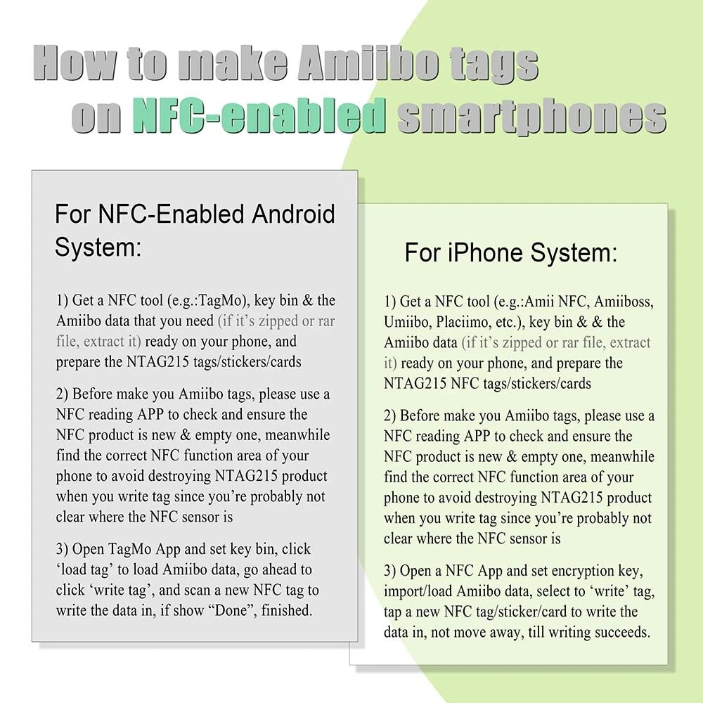 【Quantity】Includes 30pcs 25mm(1 inch) white NTAG215 NFC tags with adhesive back, Compatible with Nintendo Switch, Wii U and 3DS. Good choice as a gift. 【Safe Material】Using environmentally friendly material, NFC tag surface is smooth and shiny. The back adhesive is strong enough and easy to paste on surface of most items.(Note: not designed for use on metal surface). 【Installed with NTAG215 Chip】Enough storage space: 504 bytes of available NDEF memory, you can quickly write the information you want. NTAG215 chip has a read-write lock function so that it can be edited repeatedly or read-only. You can write, erase and rewrite easily (write endurance: >100,000 cycles). NOTE: If set as “read-only”, the chip can NOT be edited or reset any more. You can only edit Amiibo just once, and then the chip can not be repeatedly erased and rewrite. 【Scope Applications】Great for making Amiibo tags via NFC-enabled smartphones (Android OS 5.0 and above iOS 13 and above), Android support use TagMo app; iOS support use Placiibo/Amiibox/Tagmiibo app etc. Make sure to download a retail key bin file as well as the Amiibo files into the folder, that way the bin files will work. iOS users also can use “NFC Tools” app edit the NFC tags set up some siri shortcuts to quickly listen to music, connect to WiFi and more. 【Worry-free After-sales Service】If you have no idea how to use, we recommend: before your buying, watch related videos on Tik Toks/ YouTube OR Search “iPhone NFC tag” OR check r/amiibomb on Reddit for a guide on how to get started to see if they are suitable for you. For any reason the NFC tags that you received show error or damaged, doesn’t work, just contact us immediately for a free replacement!