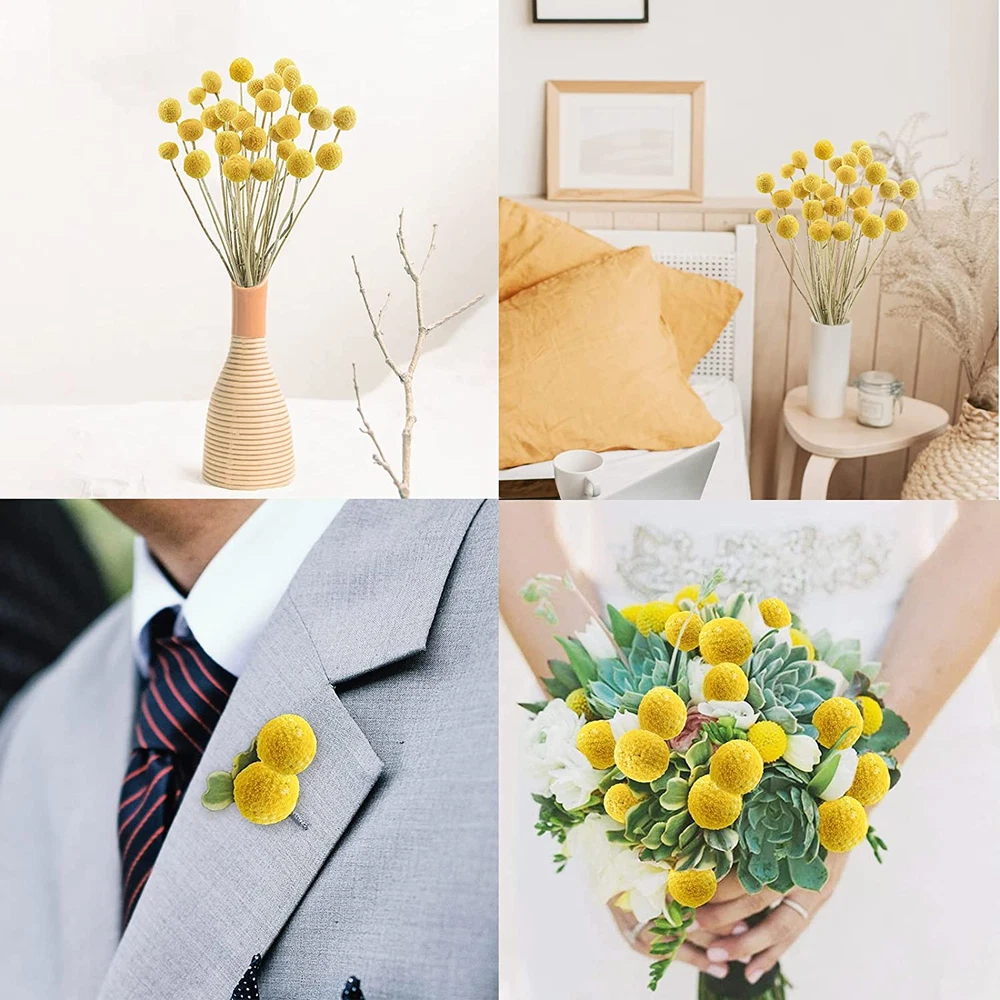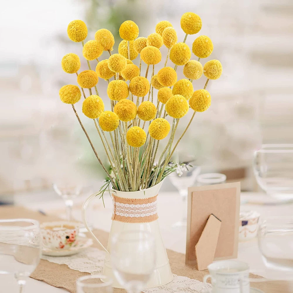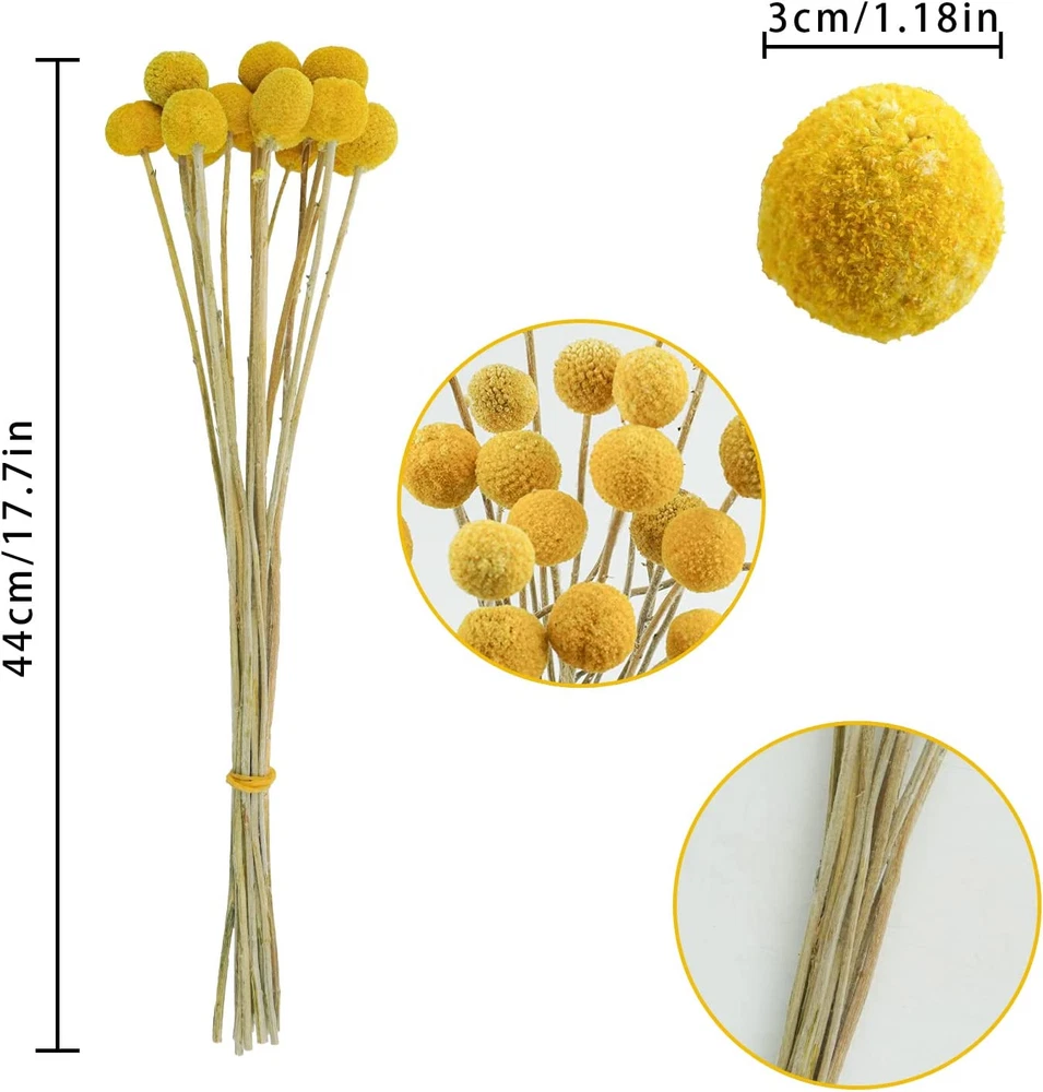 Package: Billy's ball is about 0.8-1.1in in diameter (you won't find as large as ours at this price in other store).You will receive 30pcs of gold billies balls flower; each craspedia billy balls is 16.5 inch/ 43cm long, suitable for a tall vase. These flowers are well-packaged, and you can fill them all in your retro style clay pot. If you want to fill more full, it is recommended that you buy multiple batches Times Yellow Flowers for floral arrangement: Dried Billy balls are known of their bright yellow and are a fun addition to your handmade floral arrangements. For vase fillers, Christmas Wreath, door wreath, chic Floral Arrangements, Wildflower bouquet, beach theme, placed around table, living room, woodland country decor, dining room decoration. Add whimsical color and texture Craspedia are versatile, meaning these blooms can be used in anything from boho to rustic arrangements. Perfect for giving shape and visual interest to your Floral Arrangements, Pair with blooms like dried lavender flowers, succulen, golden yellow roses, dahlia flowers Gifts from nature: Billy balls flower is a cute and budget-savvy flower that will give your wedding decor a twist. billy balls can be easily incorporated into your wedding boutonnieres, bouquet, Wedding Centerpieces, aisle, cake, and place cards. That’s fun Everlasting flower: As a kind of natural dried flowers, please put away from the damp place, otherwise It will be moldy, Dried Billy Buttons Flowers can be well preserved, you can put it on your desk, cabinet, dining table, bedroom, bright yellow will not fade, year after year to you Bring beauty to enjoy Why Choose us? Our billy balls are 100% as big as 25-30mm, and some of them even have 40mm in diameter. You can't find such quality at this price. By the way, since all of them are 100% natural, we can't guarantee the balls don't get mold during long-distance transportation. If you receive a ball that gets mold, please contact us, we would definitely give you a free return Product Description Uieke 30Pcs Natural Dried Flowers Craspedia Billy Balls Flowers 100% Natural About Size Our 30mm billy balls are 100% as big as 25-30mm, and some of them even have 40mm in diameter. You can't find such quality at this level. If you are looking for the big balls' heads, then 30mm is your optimal choice. If you want some mix sizes, then you can buy some 10mm and 25mm billy balls to make some more arrangements. About Moldy Problem and Smells the little white stuff on the billy balls are 100% natural since they are hand-picked directly from the soil. It's not moldy. You can use a cleaning brush and wipe it gently to remove the white stuff. About Quantity 30pcs in total; All billy balls are hand-picked by our farmers, sometimes there are manual mistakes and result in quantity missing. Don't worry. If you receive these balls less than 30pcs, please let us know. photos are 100% real Elements for Dried Flower Bouquets About smell 100% natural dried billy balls and the smell is natural. If you don't like the smell, just put it under direct sunshine for a few hours and the smell will disappear. About color problems Color: Natural yellow; The billy balls are harvested from the soil and dried in the sun, so it is natural that the balls have a little dirt and dust. In other words, they are intact and do not dye by chemical additives. About Fullness One bouquet is 30pcs for fullness, you can order a few more bouquets.