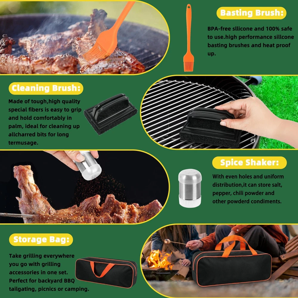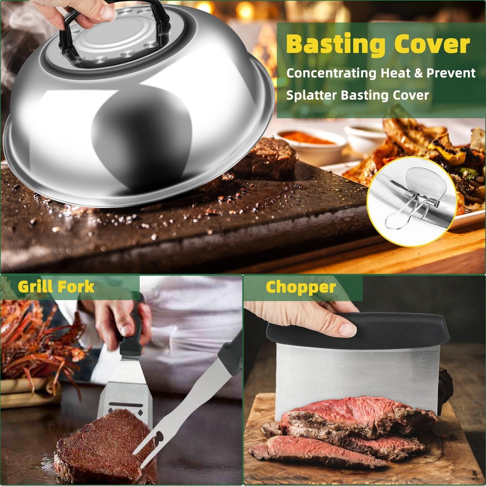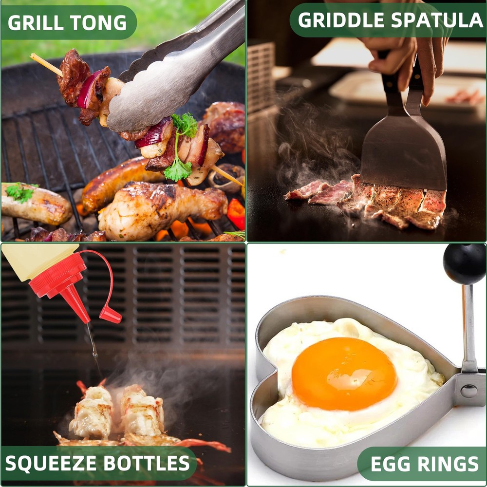 Versatile Griddle Tool Kit: This Everyday Essential Griddle Tool Kit includes multiple styles of griddle spatulas to easily handle different foods such as flipping, transferring, and cutting. The heavy-duty grill press is perfect for pressing large pieces of meat to create thick steaks or burgers. The slant edge scraper and chopper effectively handle dicing needs and grill cleaning. Egg rings and other BBQ tools ensure you perform well in barbecue cooking. Perfect 30pcs BBQ Accessories: This griddle accessories kit includes: Basting Cover, Burger Press, Long Spatula, Slotted Spatula, Grill Turner, Griddle Spatula, Scraper, Griddle Chopper, Grill Tongs, Grill Fork, 2 Basting Brush, 2 Squeeze Bottle, 4 Egg Rings, 2 Spice Shakers, 8 Hanging Hooks, Cleaning Brush, Carry Bag, gift box. Versatile Griddle Tool Kit: This Everyday Essential Griddle Tool Kit includes multiple styles of griddle spatulas to easily handle different foods such as flipping, transferring, and cutting. The heavy-duty grill press is perfect for pressing large pieces of meat to create thick steaks or burgers. The slant edge scraper and chopper effectively handle dicing needs and grill cleaning. Egg rings and other BBQ tools ensure you perform well in barbecue cooking. Superior Quality Stainless Steel: Our griddle accessories are crafted from high quality stainless steel, ensuring durability and safety for handling a variety of foods such as burgers, patties, and steaks. The sturdy and thick stainless steel construction resists deformation and breakage, making it an essential barbecue tool. Convenient Cleaning and Storage: This griddle tool kit is dishwasher safe and easy to wash by hand, saving you cleaning time. The large capacity durable portable carrying bag allows for easy storage and transport of the accessories, ensuring you can take them outdoors without worry of losing or dropping them. Perfect Gift Choice: Whether it's for Father's Day, Thanksgiving, or Christmas, this practical barbecue tools set is an ideal gift for cooking and barbecue enthusiasts. Responsive Customer Service: Our team is dedicated to providing excellent customer support. If you have any questions or concerns, feel free to contact us, and we will respond within 24 hours to help resolve any issues.