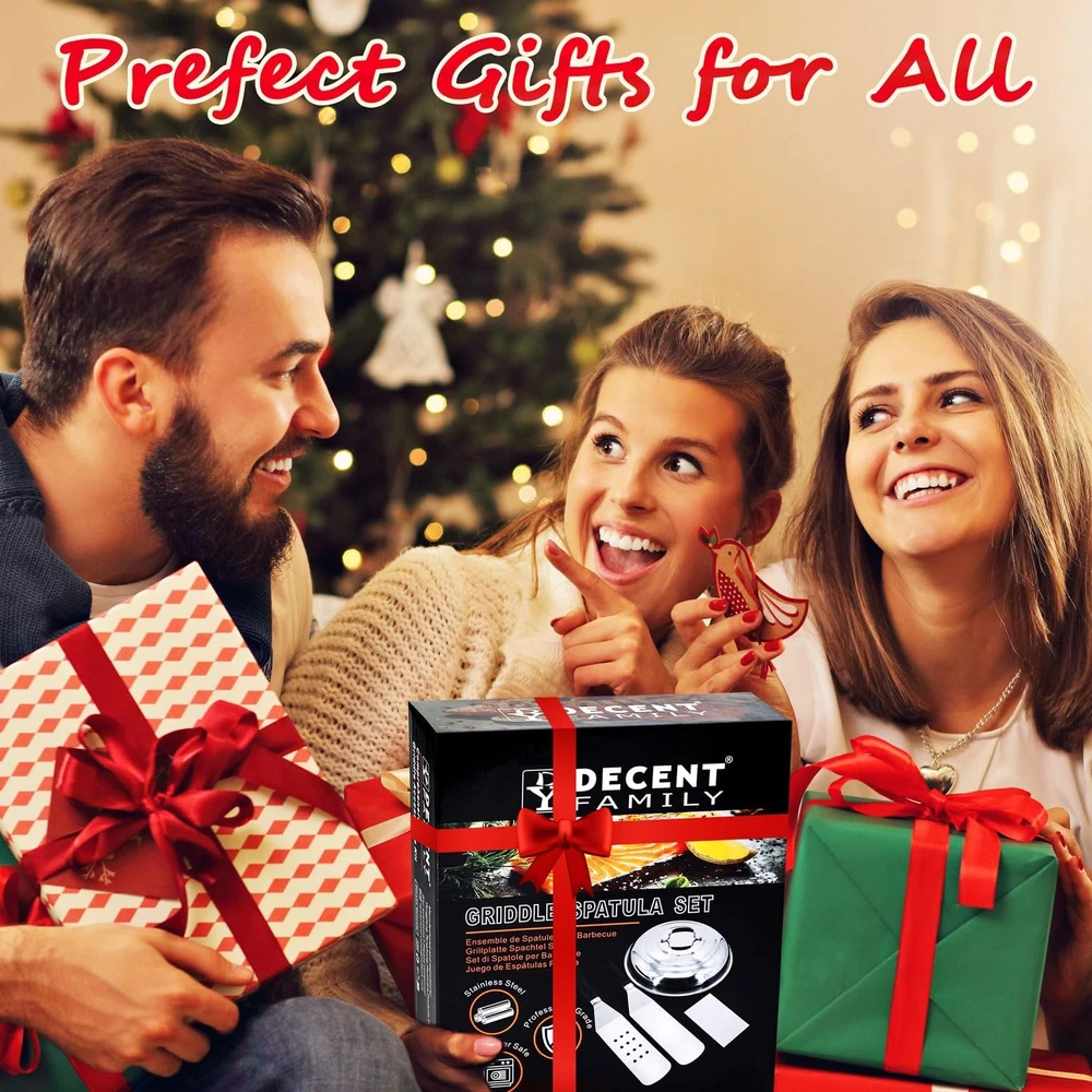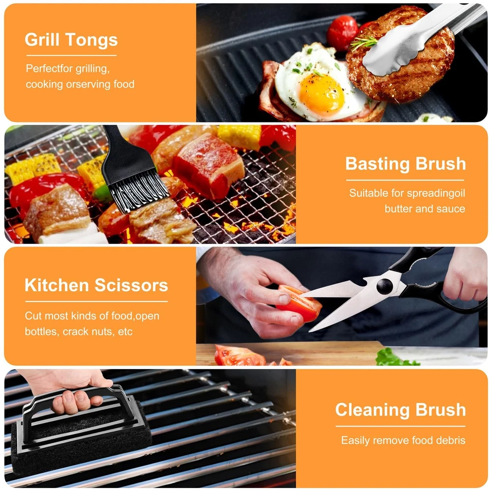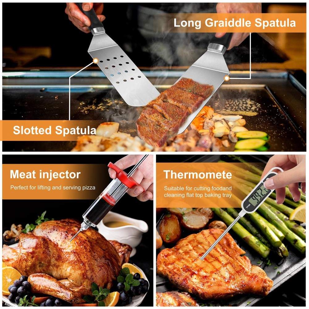 Multifunctional Griddle Cooking Tool Kit Serve freshly grilled food any time, anywhere, even indoors—with the 30 in 1 griddle tools set! Whether you’re firing up the grills for a cookout or gathering friends in your backyard to cook together, this versatile griddle kit has you covered. Professional Griddle Spatula Set A professional griddle accessories kit, including various grill tools that meet your different cooking needs like flipping burgers, pancakes, and all other grill or griddle applications, it will be a perfect addition to your kitchen, indoor party or outdoor barbecue. Easy to Clean & Dishwasher Safe All griddle tools are made of food grade stainless steel, they are easy to clean, and also can be put into the dishwasher for saving your time. Enjoy Cooking with Griddle Set Stainless Steel Construction Exquisite Workmanship Rust-Proof & Durable Heat Resistant Handle Dishwasher Safe Great Gift for Men Women Warn Tip: Please clean the griddle accessories before and after use and dry them for better maintenance. Premium Quality Stainless Steel Griddle Accessories made of thickened stainless steel, prevent easy deformation and ensure reliable quality for long-lasting durability. Robust Heat Resistant Handle The handles of grill accessories are made of heat resistant plastic to offer nonslip and comfortable grip, equipped with hanging hole for easy storage. Gifts Ideas for Men Women Our griddle set comes beautifully packed in a gift box, as a wonderful gift on Birthday, Father’s Day, Thanksgiving Day, Weeding Day, Christmas for families and friends. Must Have Griddle Spatulas Long and large spatulas with beveled edge are great for flipping meat, sausages and vegetables; And the burger spatula is suitable for moving burger patty. [ 30 IN 1 Functional Design Griddle Accessories Kit ] The griddle kit comes with solid/perforated griddle spatulas, steak flipper, pizza server, griddle chopper, 2 squeeze bottles, griddle scraper&cleaning pad, basting brush, tongs, fork, scissors, meat thermometer, 2 salt shakers, meat injector, basting cover, burger press, 10 hanging hooks and Storage bag. A professional griddle set makes it great for flipping burgers, pancakes, veggies and all other grill or griddle applications. [ Built to Last and Rust Resistant Griddle Tools ] Crafted with superior stainless steel and strong plastic handle, the griddle spatulas for flat top grills will help you conquer flat top grilling in your courtyard like a master. With exquisite workmanship, the texture of the griddle accessories are smooth yet sturdy, assuring you ages of fantastic service. Dishwasher safe to make griddle utensils easy to care for and maintain. [ Superior Performance flat top grill accessories Set ] The right hibachi grill accessories can help you improve your griddle skills and make your next meal more flavorful. Slotted grill spatula allows juices to drip cleanly away from food; Solid griddle scraper for reliable flipping, turning, and serving; Scraper features a sharpened edge to chop food and clear stuck-on particles from your griddle. Lockable tongs and pizza server for serving foods. [ Heavy Duty Basting Cover And Grill Press ] Both Melting Dome and bacon press are made of stainless steel and equipped with a heat resistant handle, constructed with heavy gauge steel, strong enough to resist deformation, rust-free for less hassle. Griddle basting cover is ideal for melting cheese, steaming fresh vegetables, or even just used to keep food warm. Burger press is easy to deal with bacon, burgers, beef and more. [ Everything You Need in The Griddle Tool Kit ] No Assembly Required! With the flat top griddle accessories set, you can expect superior performance as you rely on the griddle scraper tools to cook. Works great for making burgers, teppanyaki or breakfast pancakes on your electric, gas or countertop propane griddle. Packed in a canvas storage bag, the hibachi grill accessories set is not only easy to store, but also convenient to take to backyard park outdoor camping or daily using in kitchen. [ Perfect Gift Choice ] The griddle spatula set comes with nice packaging box. Great gift choice on every important life moments as birthday, anniversary and retirement, as well be the picked one of the Holiday Gift Planning for grand festivals, such as Mother's Day, Father's Day, Thanksgiving, Christmas.