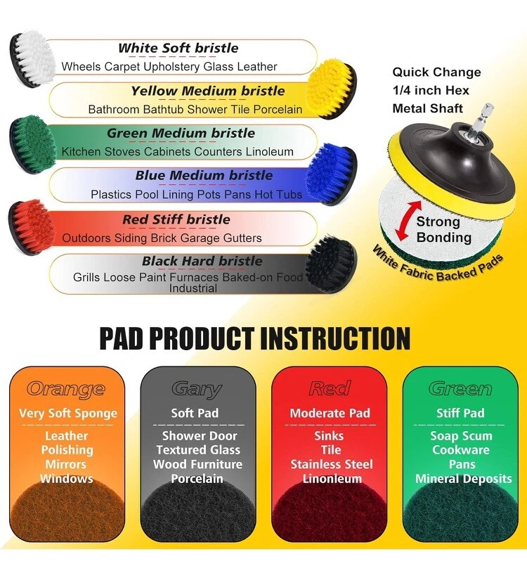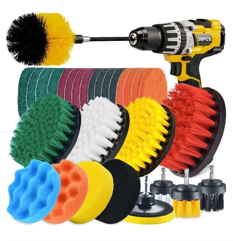 A perfect way to make every nook and cranny of your house or car absolutely spotless! Brush, Scouring Pads & Scrub Sponge. Includes: 8 Drill scrubber brushes, (DRILL IS NOT INCLUDED) 16 Scouring pads of different stiffness, 4 Scrub sponges, 1 piece corresponding scrubber connector, 1 piece Extended Reach Attachment