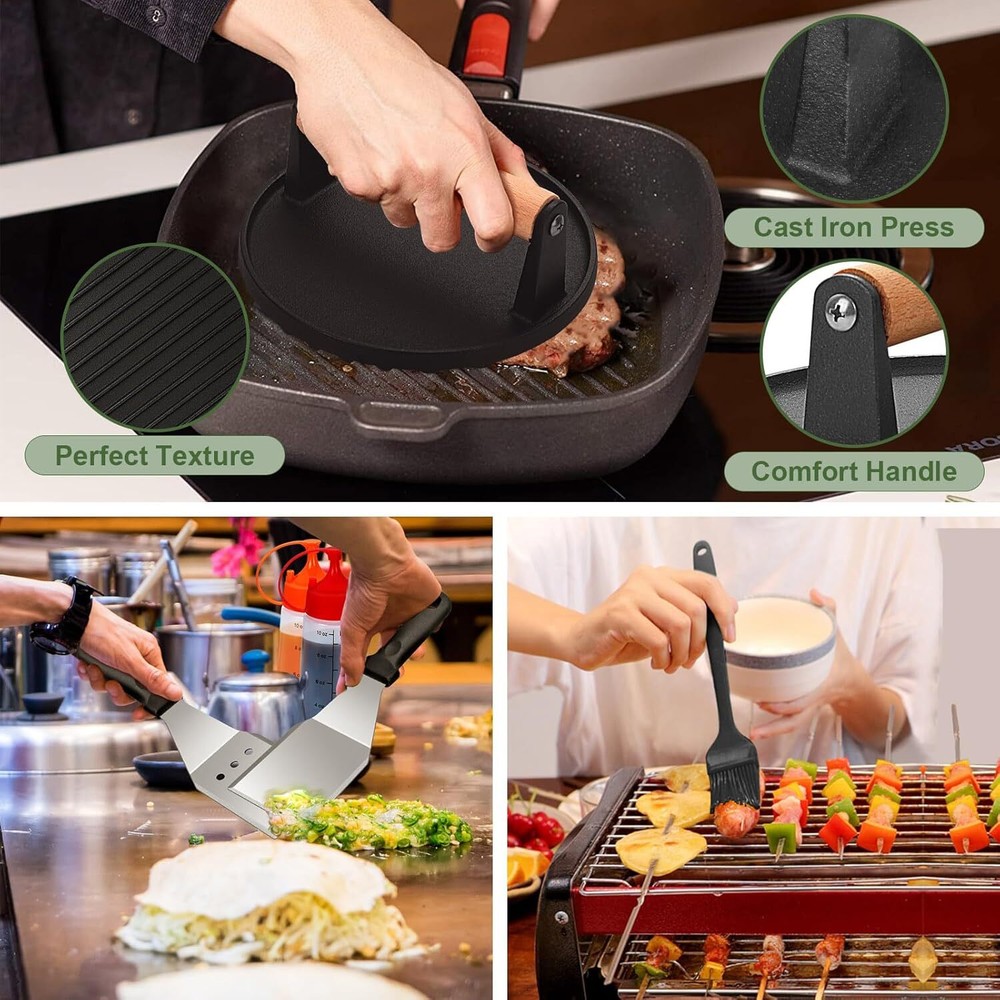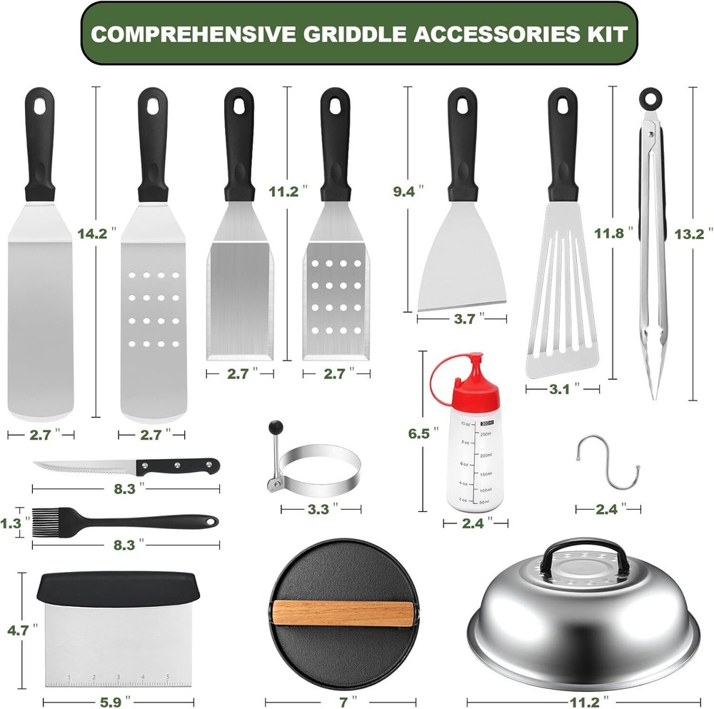 【Perfect 30pcs BBQ Accessories】This griddle accessories kit includes: 1* big Spatula, 1* small spatula, 1* big slotted spatula, 1* small slotted spatula, 1* slant edge scraper, 1* fish turner, 1* tongs, 1* cast iron griddle press, 2* squeeze bottles, 2* meat knife, 1* basting brush, 1* chopper, 4* egg rings, 9* hooks, 1* sauce brush, 1* basting cover, 1* storage bag, 1* gift box. 【Premium Stainless Steel】Compared with other stainless steel on the market, Our metal flat top grill is made of high quality stainless steel, heat-resistant and rust-proof, safer and more durable. So you can easy enjoy your grilling, camping or cooking without worry about your tools bending, breaking or rusting again, which is BPA free you can use it with confidence. 【Easy to Clean & Storage & Carry】Our griddle tool kit is dishwasher safe, or easily wash by hand with water and soap, so you can enjoy a delicious barbecue with your family without hassle. Each tool can be placed in an orderly manner and better protected in the compact storage bag. Convenient hangers are provided for easy storage and food grade grill tools are easily cleaned with warm, soapy water. Note: After washing the spatula and scraper, please make sure to dry them to avoid rust. 【Chef's Choice griddle accessories kit】This grill tools set with griddle scraper, spatulas and oil bottles helps you to grill as easily as a restaurant chef. Great for flipping burgers, pancakes, veggies, cutting bread,meat and sausage, scraper & chopper to dice food and scrape griddles clean. The Long Griddle Spatula can move large amounts of food quickly and accurately. Egg rings and pepper shakers to enhance your griddle cooking experience. 【Great Gift Choice】This practical barbecue tools set with beautifully designed gift box is ideal gift choice for Fathers Day, Thanksgiving or Christmas. It includes all the tools needed for yard, outdoor, and camping barbecues an ideal gift for friends, lovers, or family members who love cooking or barbecue and camping enthusiast.