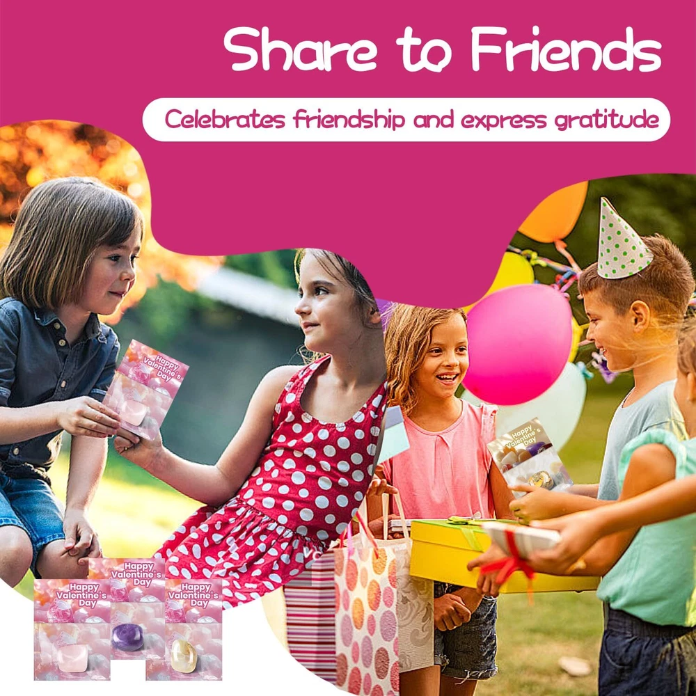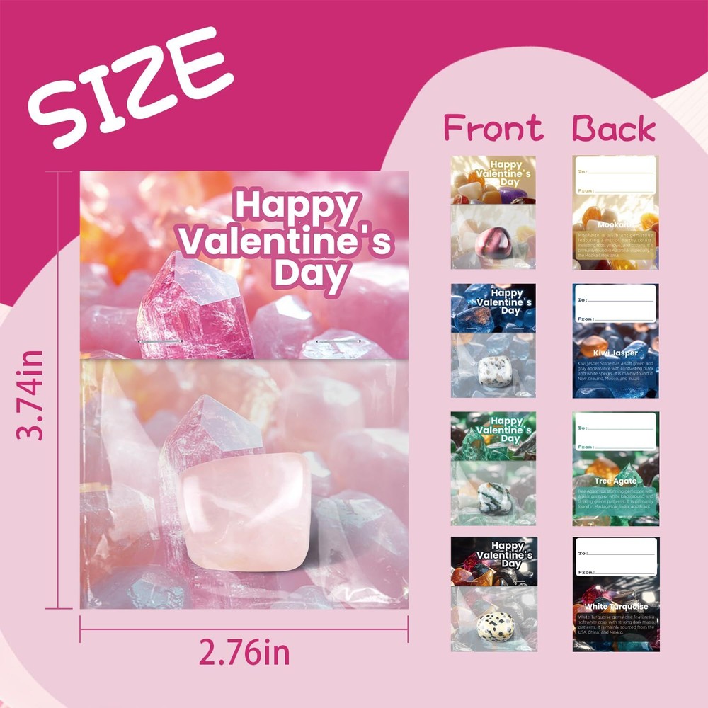 30 Pack Prefilled Valentines Day Gifts for Kids Pre-filled package includes 30 gemstones valentines cards with 15 unique styles Each card features a simple “Happy Valentine’s Day” on the front, while the back provides gemstone details and blessings, making it easy and enjoyable for kids to learn about rock crystal The gemstones are crafted from natural crystals, polished to perfection, and free from artificial dyes or additives, ensuring a safe and authentic experience Ideal for valentines classroom exchanges, sharing with friends and family, or collecting, these polished rock stones add a meaningful touch to valentine's day celebrations Perfect as class valentines day gifts for kids, this 30-pack combines heartfelt cards and natural gemstones to make celebrations extra special