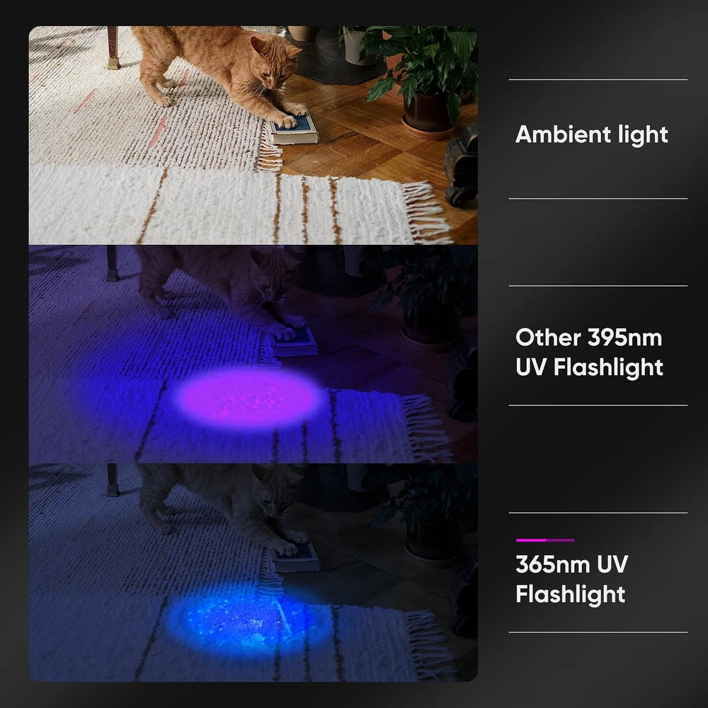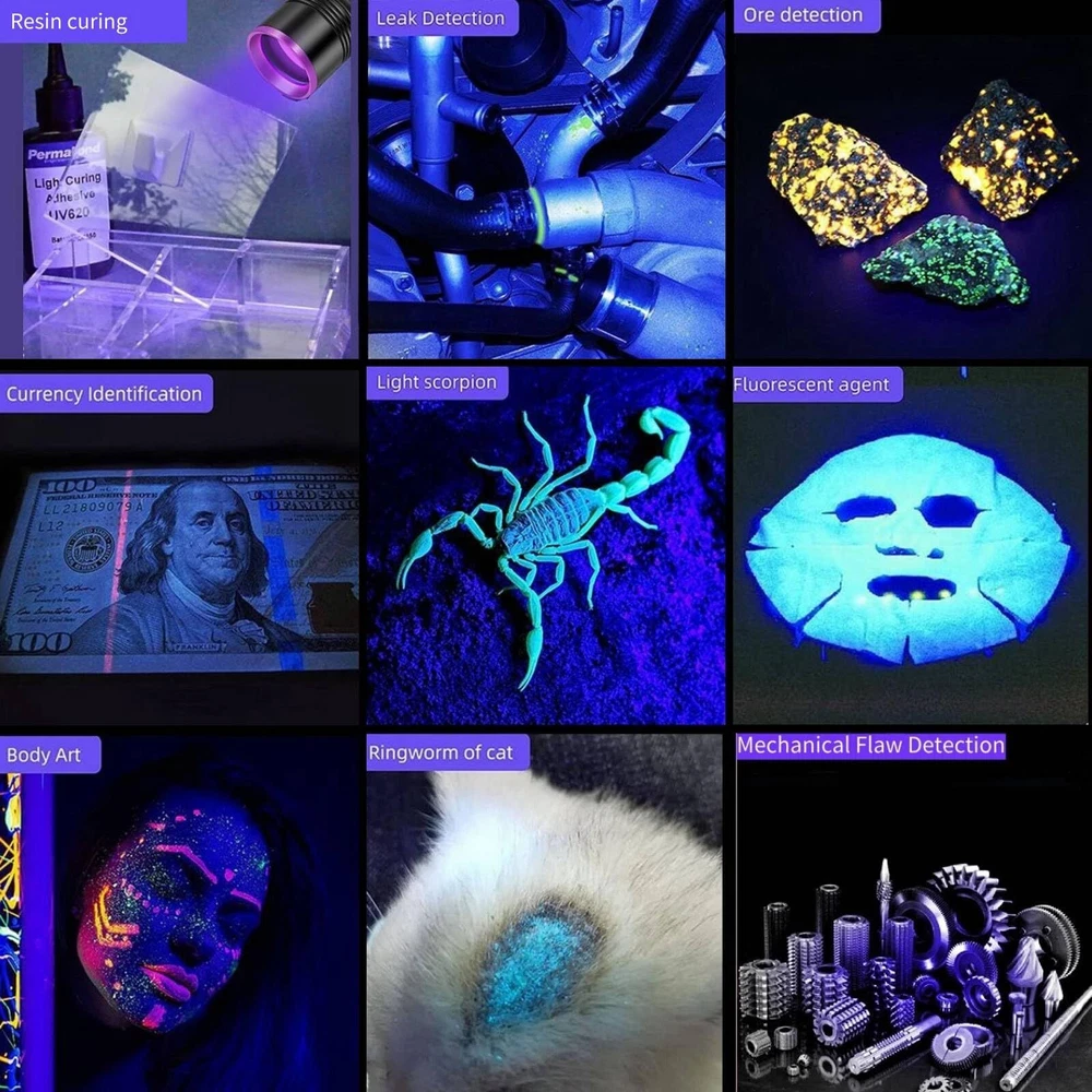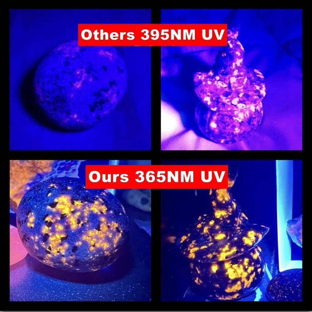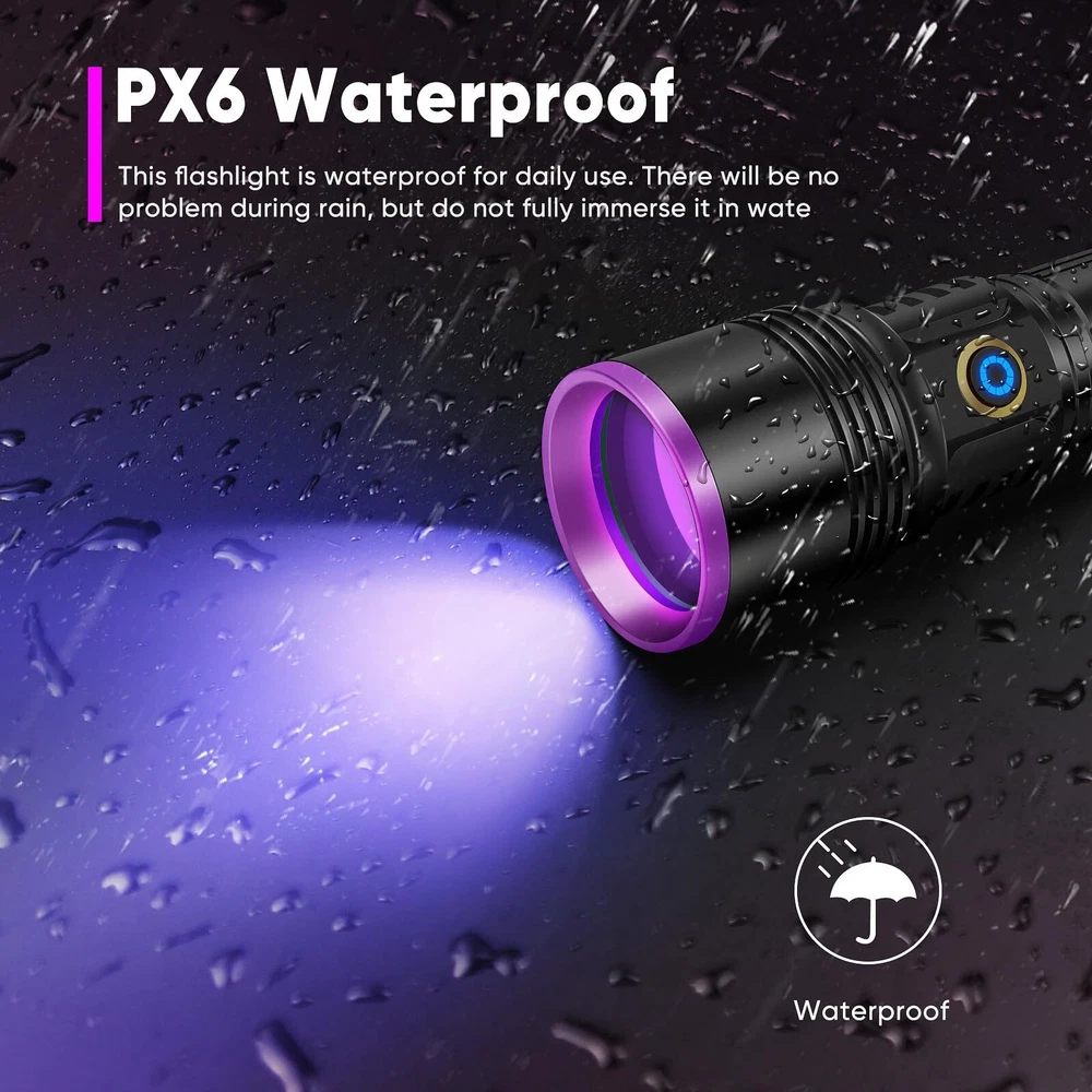 【UPGRADE UV LIGHT SOURCE】Professional ultraviolet flashlight. Uses 4-core 365NM UV LED source rather than the diode lamp, up to 30W output, providing a market-leading beam range of up to more than 30 feet in the dark. Very powerful, so you don't have to be close to the surface for something to fluoresce 【READY FOR ALL YOUR NEED】It's a needed multifunctional uv black light in your life. 1) Daily use: pet urine detection, ringworm, bed bugs, hotel, fluorescent checking; 2)Outdoor use: find scorpions, insects, minerals, blood tracking, rock hunting, like yooperlites, sodalite, firestone; 3)Professional use: resing curing, a/c leak detection, detecting counterfeit money, licenses, ID cards, jewelry, uranium glass, etc 【365NM UV FLASHLIGHT WITH BLACK FILTER LENS】Equipped with Multi layer filter optical lens, 99% Filter ambient light to make UV more pure. If you are unfamiliar with the differences in UV lights, the 365nm wavelength is the one you want to get maximum effect 【USB RECHARGEABLE FLASHLIGHT】The uv flashlight black light is powered by a large 3000mAh rechargeable that can be used for up to 4-6 hours. With a type-C USB input and output, this rechargeable flashlight can be easily charged and can also serve as a power bank for your devices. You can charge it and don’t have to replace batteries. (Red: Charging, Blue: Fully charged) 【POWERFUL ULTRAVIOLET LIGHT】Heavy duty - well made. Made of high-quality aluminum alloy, greatly enhanced its heat dissipation performance, will not burn even if used for a long time. This high-power 365 uv flash light has strong antioxidant capacity and can be used for more than three years, which is three times than ordinary UV flashlight
