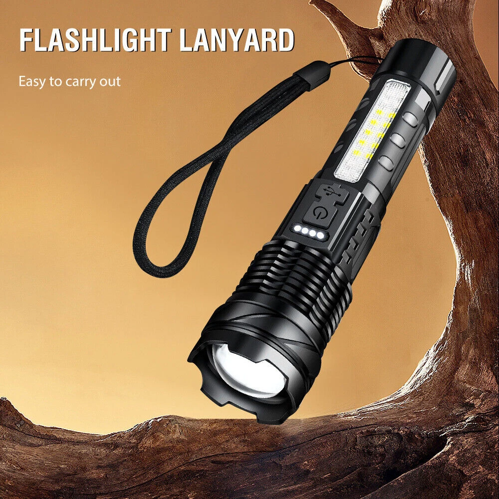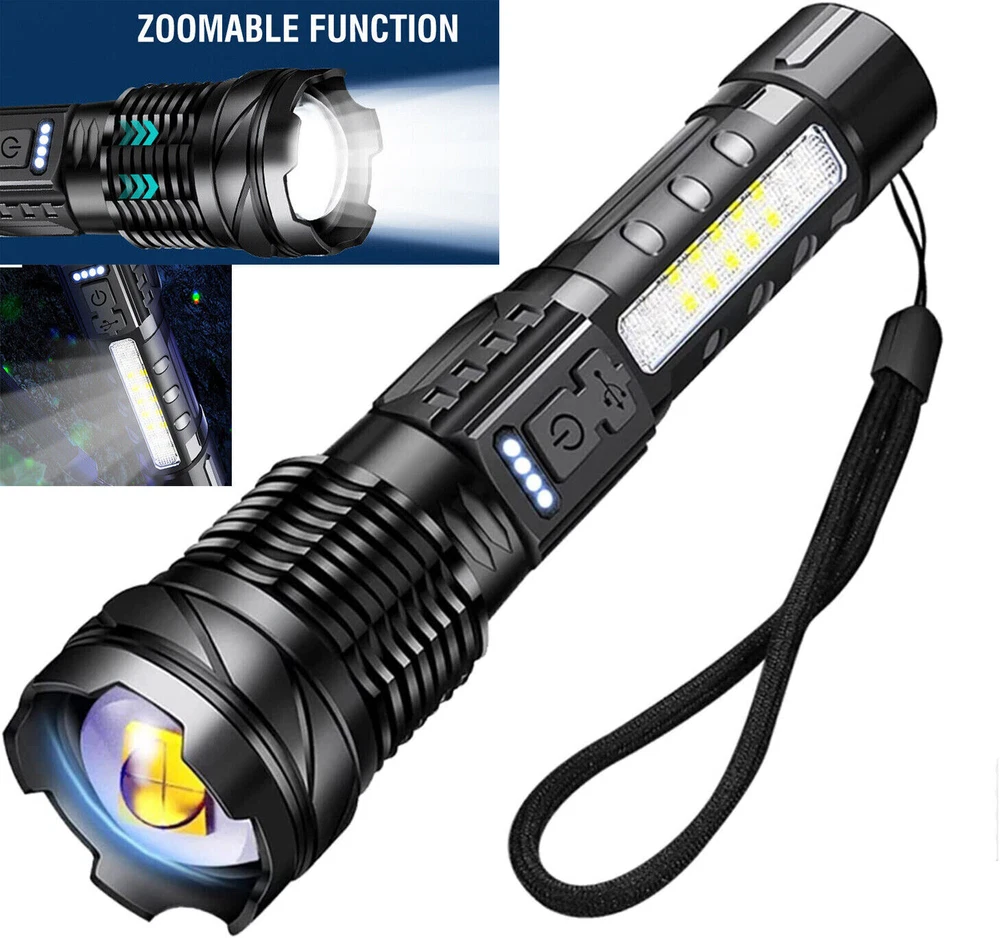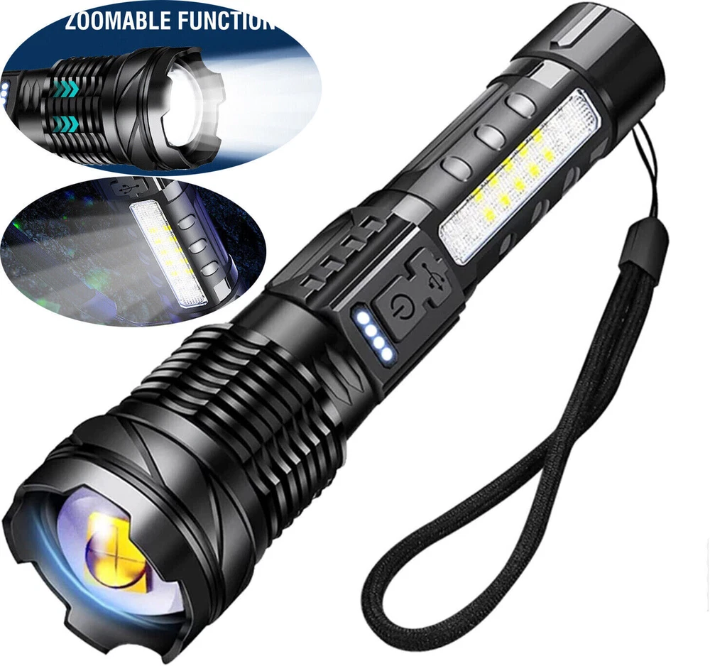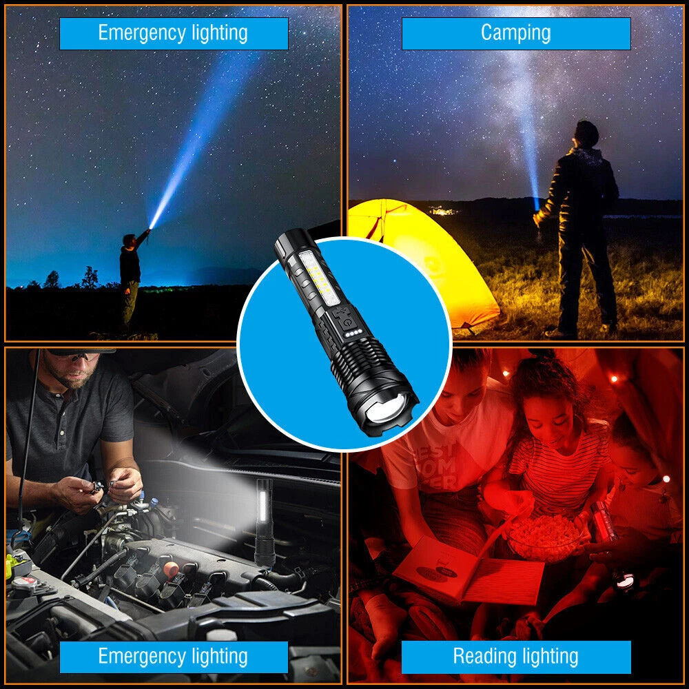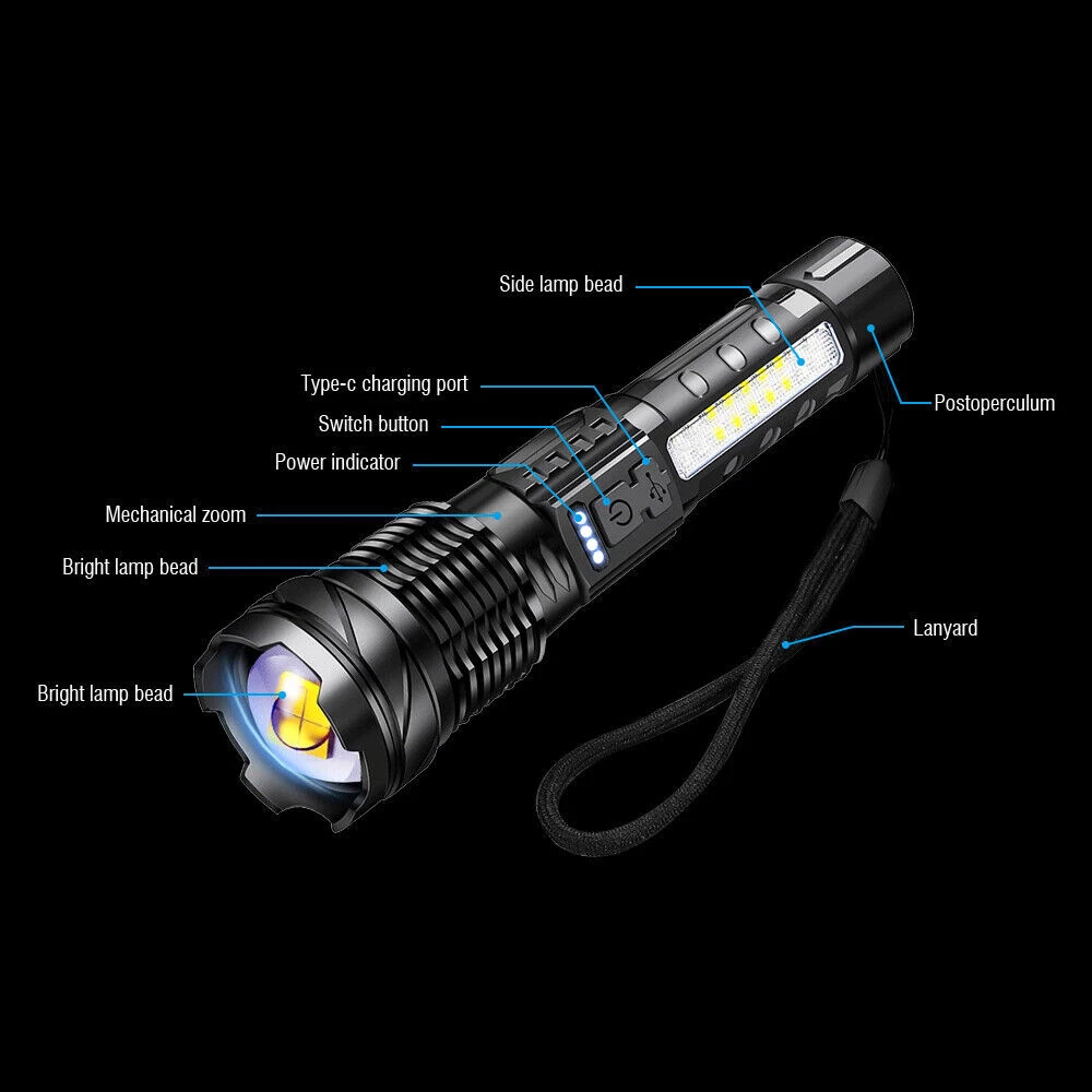 About this item 【Super Bright Flashlight】:The super bright handheld flashlight comes with 7 light modes, and COB light is designed on the side. Built-in 10 LEDs white light, 4 LEDs red light and 4 LEDs blue light, the front light can change 3 light modes and the COB side light can change 4 light modes. and very suitable for home, camping, hiking, outdoor or emergency situations. Etc 【Flashlight to Adjust Light Distance】: The head of the flashlight is zoomable and used to adjust the lighting distance. When the flashlight head is not extended, the lighting area is large and the lighting distance is approximately 3300 feet. When the flashlight head is extended, the lighting area becomes smaller, but the lighting distance is approximately 3900 feet. Can be used to view the status of areas further away. 【Power Display & 5-12 Hours Long Lasting Illumination】: The flashlight has a display on the side to show you how much power of the flashlight during using, the package includes a charging cable for you and the charging port is also designed with a waterproof rubber cover. The runtime of the flashlight is up to 12 hours in low work mode and 5-7 hours in a high work mode. 【Easy to Carry】: Led flashlight is equipped with lanyard and flashlight pouches, which can be hung on the side of the backpack or put into the backpack for easy carrying.flashlights also come with removable pocket clip ,Easily attach to your pocket , hat or belt. 【Waterproof for Heavy Rain Weather】: The Handheld flashlight is waterproof,this waterproof flashlight non-slip, shockproof, waterproof, rainproof, dustproof, can be used in camping, hiking and others Rain, snow or other outdoor emergency situations.
