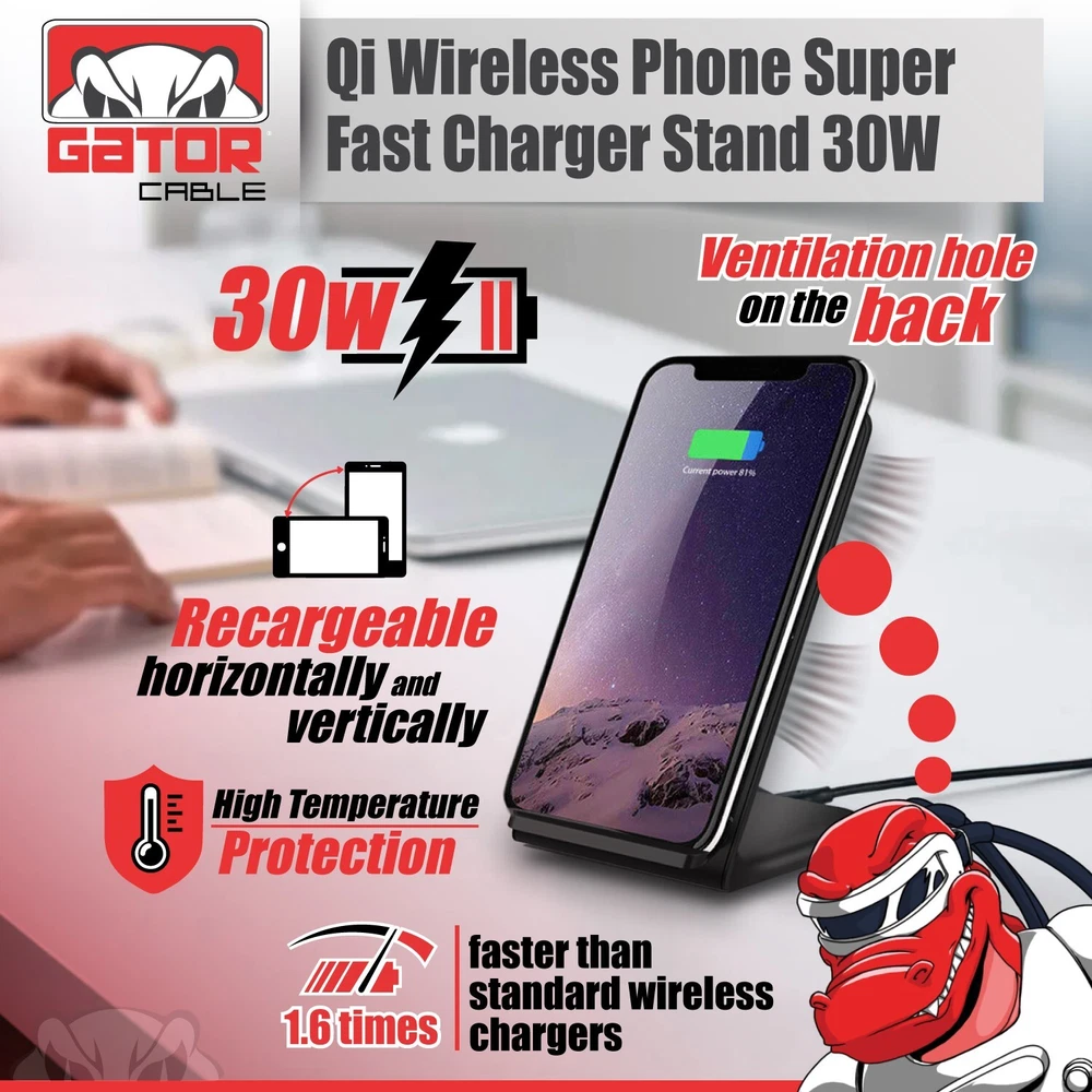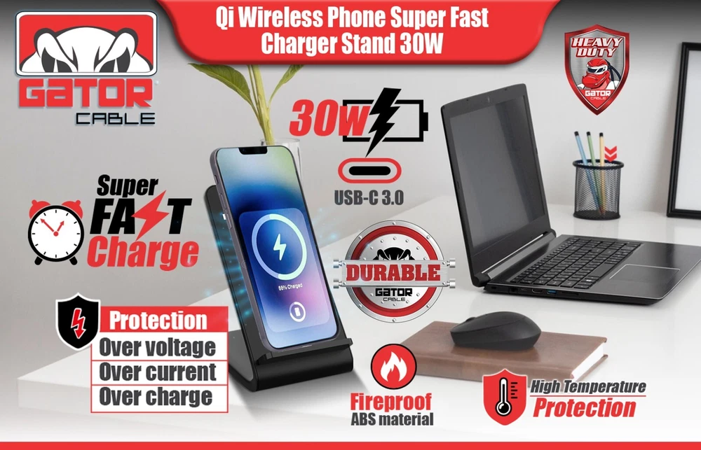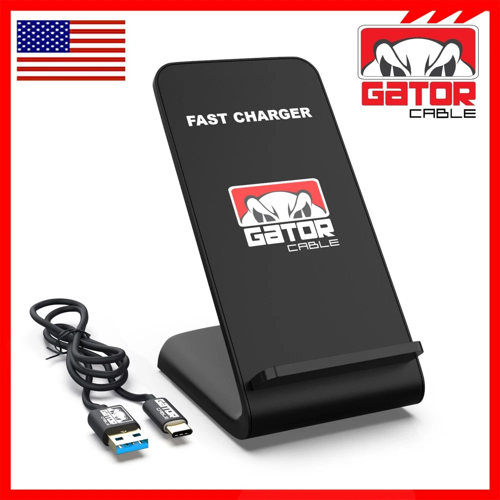 Gator Cable Qi Wireless 30W Super Fast Charger Stand/Dock USB-C 3.0 Charger Cable 3 FT Universal Compatibility with Qi Wireless Charger Phones With Two High Efficiency Transfer Charger Coils Charger Color: Black Specifications : Gator Cable Wireless 30W Super Fast Charger Stand Place a Qi-Enabled phone or device equipped with a Qi compatible cover on it. Features a power efficient idle mode to avoid overcharging and energy waste. Friendly LED indicator light to let you know when its charging. 2 high efficiency charger coils on charger. 30W Super Fast Wireless Charger Dock Input: 12V/3.0A Output: 30W Charger Dimensions: 4.6 in x 2.76 in x 3.6 in (H x W x D) Compatibility: Compatible with any Qi enabled phone or device. Compatible with: iPhone 8, 8 Plus, SE, X, XR, XS, XS Max 11, 11 Pro, 11 Pro Max, 12, 12 Pro, 12 Pro Max, 12 Mini 13, 13 Pro, 13 Pro Max, 13 Mini, 14, 14 Plus, 14 Pro, 14 Pro Max, 15, 15 Plus, 15 Pro, 15 Pro Max Samsung Galaxy S6, S7, S8, S9, S10, S20, S21, S22, S23, S24 Samsung Note 5, Note 8, Note 9, Note 10, Note 11 LG G2 G3 G4 G5 G6 G7 G8 G9 Moto Droid Turbo, Moto Droid Maxx/Droid Mini Nexus 4 5 6 7 8 Nokia Lumia 1020, 920, 928 HTC Droid DNA, HTC RZound Blackberry Z3 Pentax WG-III Camera Any and All Qi Compatible Devices or Equipment Included in Package: 1 x Gator Cable Qi Wireless Charging Stand 1 x USB-C 3.0 Cable 3FT We Offer The Lowest Prices On eBay for OPTIMUM Quality Cables + Free Shipping On All USA Orders! BUY 4 OR MORE GATOR CABLES, GET FREE U.S. PRIORITY MAIL SHIPPING! ALL ORDERS ARE SHIPPED OUT WITHIN 1 TO 8 HOURS! Strong-Rugged-Durable Heavy Duty Wireless Charger Stands/Pads and Cables Premium Quality Wireless Pads & Cables Ultimate Performance Great Value CLICK ON OUR eBay STORE