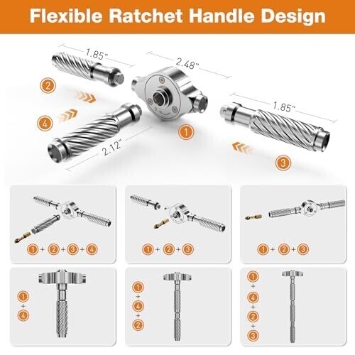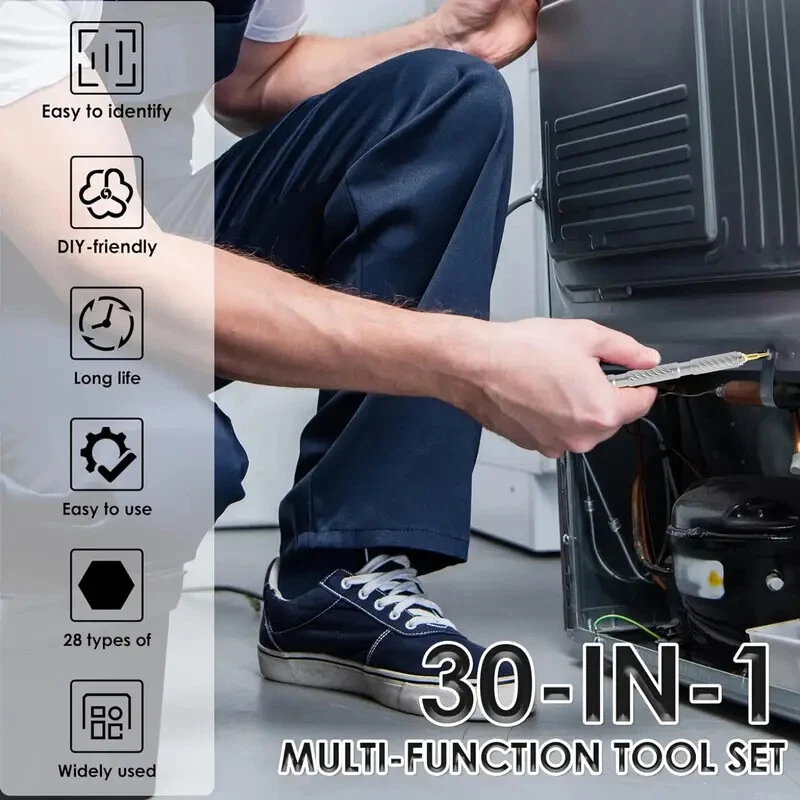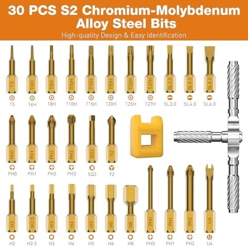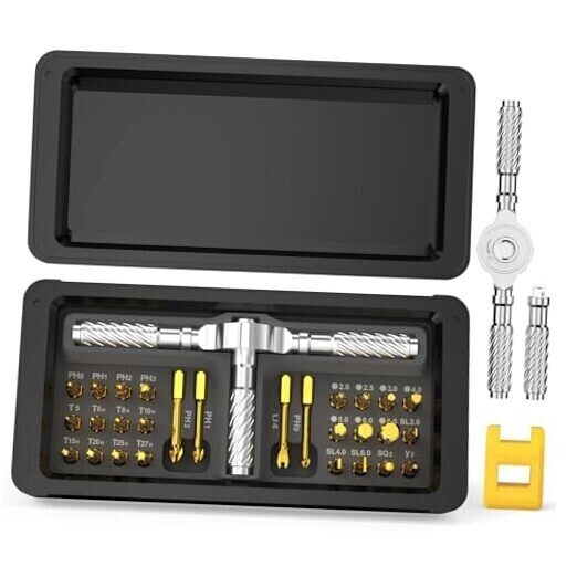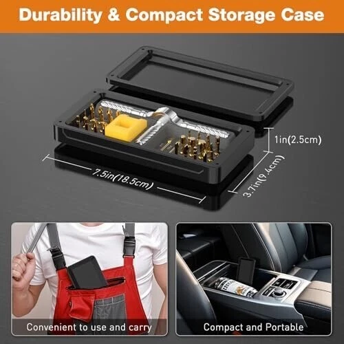 💯30-in-1 Magnetic Ratchet Screwdriver Set: This professional-grade ratchet screwdriver set comprises 28 high-precision steel bits, encompassing PH, SL, Torx, Hex, and U types.It also comes with a T-shaped handle and a yellow magnetic slot with magnetic properties. 🚀Durable & Portable: Housed in a reinforced ABS case with custom foam slots, this compact and travel-ready magnetic ratchet screwdriver set resists drops and corrosion. Each bit is clearly labeled for quick identification, allowing users to conveniently store the set in a backpack or glove compartment for emergency use. ⚡Ultra-Lightweight & Ergonomic Design: Screwdriver are constructed from durable S2 chrome molybdenum steel, the screwdriver offers exceptional strength and longevity. The T-shaped ratchet handle is crafted from lightweight aluminum alloy, weighing only half as much as a steel tool while maintaining twice the durability. Its ergonomic design and non-slip grip reduce wrist fatigue by up to 70%, making it suitable for extended use in applications such as computer repair, bicycle maintenance, or household appliance servicing. 🆙Advanced Ratcheting Mechanism: Equipped with a precision-engineered 58-tooth reversible ratchet mechanism and a 6.2° rotation angle, this multi-functional screwdriver set delivers 50N.m of torque for effortless tightening and loosening. The instant forward/reverse mode switching makes it an ideal choice for both professionals and DIY enthusiasts working in tight spaces. 🎁Ideal Gift for Tool Enthusiasts: From gadget repairs to automotive maintenance, this versatile ratchet screwdriver set serves as an excellent gift for engineers, hobbyists, or anyone passionate about tools. Its sleek black design combines functionality with aesthetics, making it a valuable addition to any toolbox. Product Description Previous page Next page 1 Magnetic Packaging 2 Prdoduct Size 3 6.2° Ratchet Design