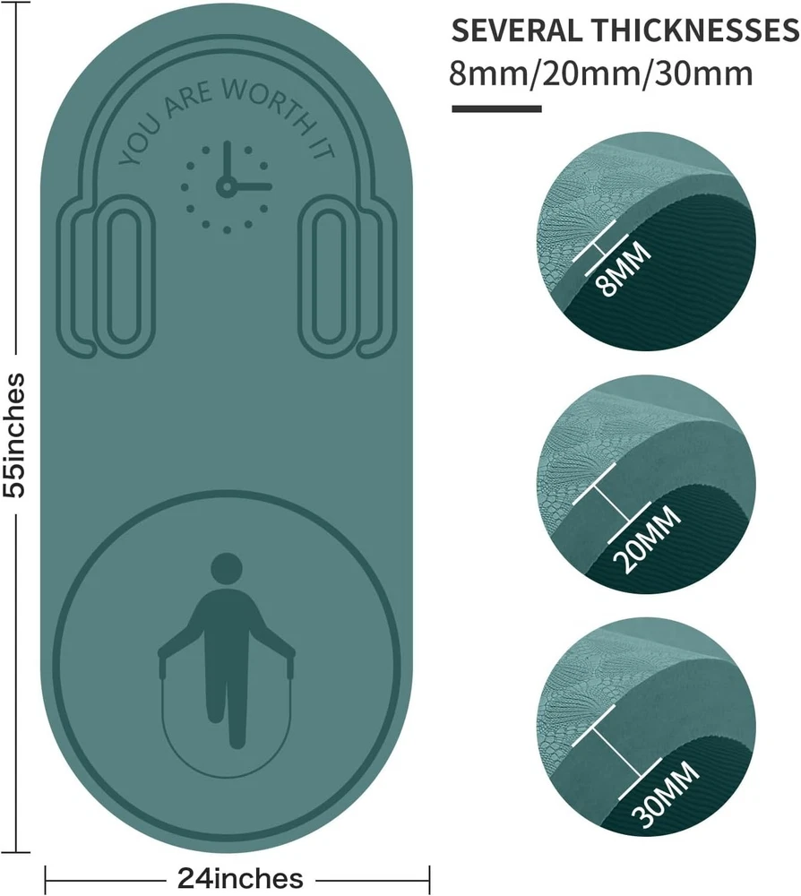 Size: 55" x 24" x 30mm (Thickness) Sport/Activity: Gym & Training, Yoga, Fitness, Jump Rope, Home Gym Color: Green Number of Items in Set: 1 Item Weight: Lightweight Material: PVC, Thermoplastic Elastomers (TPE), Non-slip Surface gtin13: Does not apply Department: Unisex Adults Product Dimensions: 55"l X 24"w X 16.92"th Item Diameter: Not applicable Type: Gym Mat Shape: Rectangular UPC: Does not apply Brand: Unbranded Product Care Instructions: Hand Wash Only Item Dimensions L X W X Thickness: 55"l X 24"w X 16.92"th Care Instructions: Hand wash only Features: Non-Slip, Thick Cushioning, Jump Rope Included, Carrying Bag Included, Easy to Clean, Lightweight, Grippy Surface