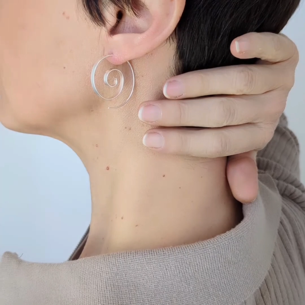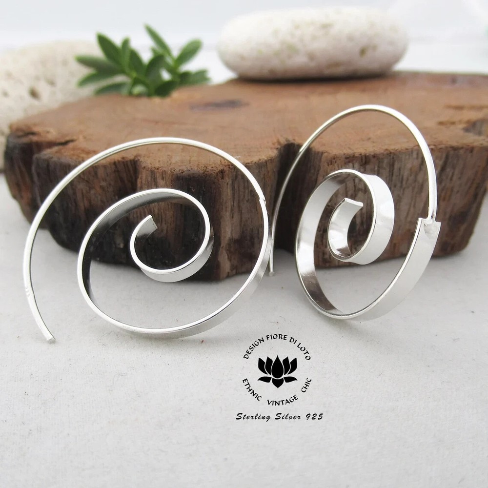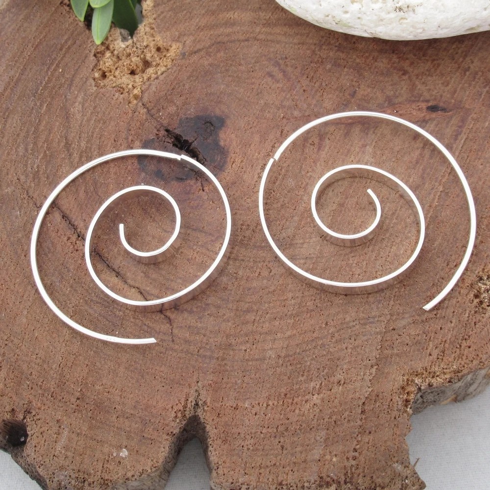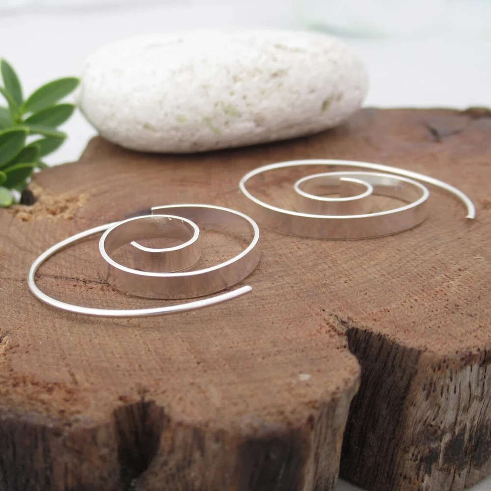 Open wire flat spiral threader earrings in sterling silver. Nickel FREE These large flat silver spiral earrings are on of our best selling earrings. Their tribal boho style makes them incredibly versatile for any occasion. They're also a great jewelry gift for your girlfriend, mom, friend, or anyone you want to show appreciation for. These Handmade 30mm hoop earrings are carefully made in 925 Sterling silver. Perfect simple spiral threader to wear every day with every outfit Buy them now! Dimensions: Diameter: 3cm Total weight approx: 3.9 grams. Delivery Information All items dispatched from the UK. Item will be carefully packaged in eco-packaging to safeguard it during delivery and our branded satin pouch ready as a gift. Standard Tracked 48 Shipping with Royal Mail or Yodel included FREE . Tracking number details will be sent after dispatch (which is usually within 1 working day of purchase. Weekends/festivities excluded). Faster shipping options also available for the UK. Worldwide shipping available with Royal Mail Tracked & Signed. Returns accepted within 14 days of receipt. At customers’ expense.