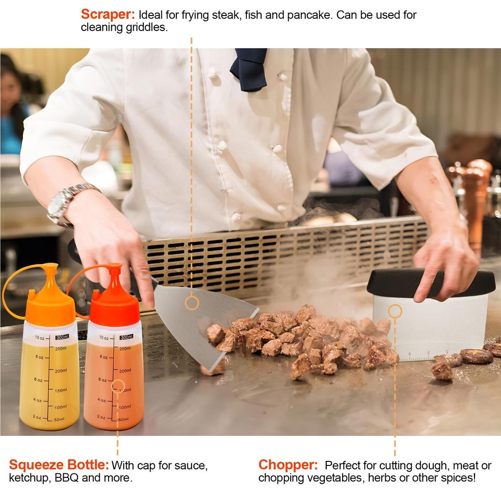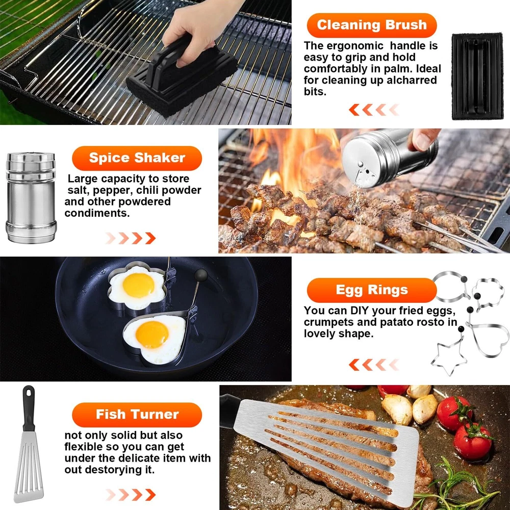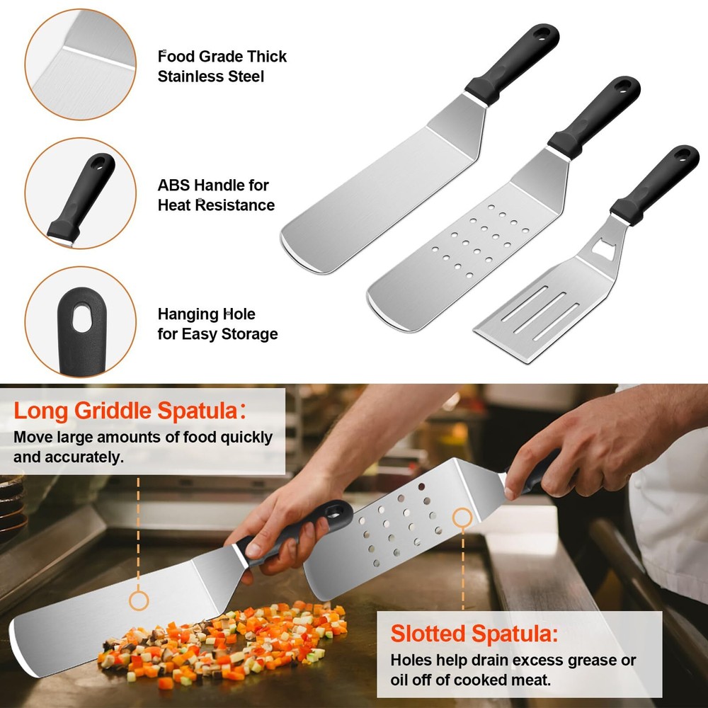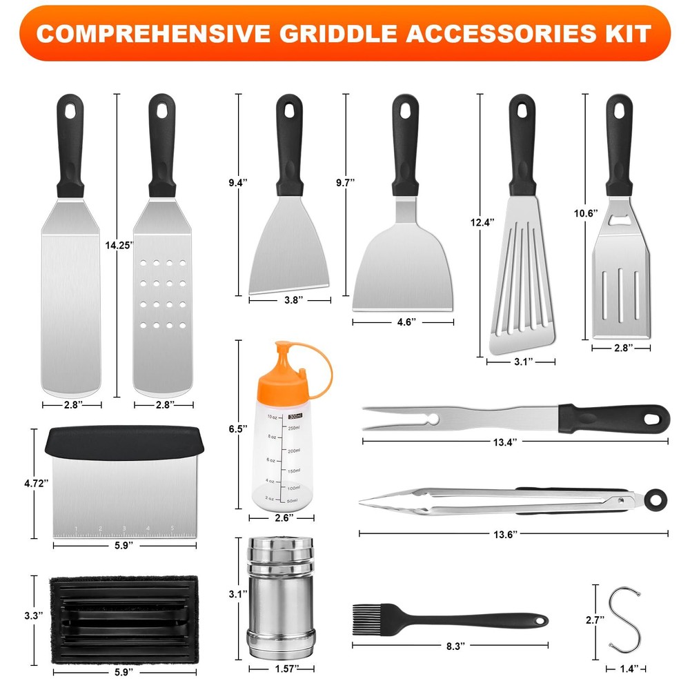 Griddle Accessories Kit, 30PCS Flat Top Grill Accessories Kit for Blackstone and Camp Chef, Stainless Steel Griddle Grill Tools with Enlarged Spatulas, Scraper, Tongs, Carrying Bag for Outdoor BBQ Super Value Griddle Accessories Kit: Our complete 30PCS Griddle Accessories Kit for Blackstone includes everything you need for outdoor or indoor grilling. It contains 1 Slotted Spatula, 1 Long Griddle Spatula, 1 3-Sided Bevel Spatula, 1 Scraper, 1 Chopper, 1 Burger Scraper, 1 Fork, 1 Grill Tongs, 1 Fish Turner, 1 Basting Brush, 2 Spice Shakers, 4 Egg Rings, 2 Squeeze Bottles, 1 Cleaning Brush, 1 Storage Bag, 10 Hooks. Premium Stainless Steel: Our grilling accessories set is made of high quality stainless steel ensure the griddle accessories compatible with Blackstone griddle, which is bpa free, rust proof and durable, you can use it with confidence, without worry about your tools bending or breaking. The heat-resistant ABS handles provide a comfortable grip, with hanging holes for easy storing. Furthermore, this metal flat top grill accessories are easy to clean and dishwasher safe. Chef's Choice Griddle Tools: Our grill tools set with griddle scraper, spatulas and oil bottles are necessary griddle tools for griddle chef. The Long Griddle Spatula can move large amounts of food quickly and accurately. Flattop grill flipper/turner with 3-sided bevel cutting edge, perfect for flipping burgers, pancakes, veggies, cutting bread, meat and sausage. Holes of the slotted spatula help drain excess grease or oil off of cooked meat. Extra BBQ Tools: Egg Ring can shape your eggs in different shapes that is more delicate; Cleaning Brush can help you remove stubborn stain after cooking.our spice shakers has larger capacity, it’s more convenient to use. Everything help you conquer flat top grilling like a master. Each tool can be placed orderly in the compact storage bag, it’s easy to store and convenient to take to backyard park outdoor camping or daily using in kitchen. The Practicality Tool You Need: Our barbecue tools include all the tools needed for yard, outdoor, and camping barbecues. It is a good helper to help you explore the food journey. griddle accessories kit is a professional indoor and outdoor BBQ grill tools set created for cooking enthusiasts and chefs. Take a break on your garden, lawn or any outdoor from your busy life with Blackstone Griddle Accessories Kit. The complete 30pcs griddle grill tools could meet all your needs for barbecue griddle cooking, help you conquer flat top grilling like a master. PRODUCT FEATURES: 【Thick & Solid Stainless Steel】Rust-free, durable and strong enough to resist deformation. The heat resistant ABS handles provide a comfortable grip, with hanging holes for easy storing. 【Different Spatula Set】 Multi-purpose griddle spatulas meet all your BBQ grilling needs. 【Easy to Carry Storage Bag】The custom canvas carrying bag is much convenient for you to carry when you have a picnic or camping. 【Easy to Clean & Dishwasher Safe】All tools are easy to clean, and also can be put into the dishwasher, saving your time. PACKAGE INCLUDES: 2 Oversized Griddle Spatulas 1 Regular-size Grill Flippers/Turners 1 Fish Turner & 1 Burger Turner 1 Chopper & 1 Slant Edge Scraper 1 Griddle Tongs (13.6inch) & 1 Grill fork 2 Leak-free Squeeze Bottles 4 Egg Rings & 2 Spice Shakers 1 Basting Brush & 1 Soft Cleaning Brush 10 Stainless Steel Hooks 1 Sturdy Storage Bag WARM TIPS Please clean these tools immediately after use, and wipe off the surface moisture with a dry cloth for long-term use. SHIPPING Domestic Buyers - We ship within 3 business days of payment, usually sooner - We offer FREE shipping on all orders! - We only ship to the lower 48 states, no APO/FPO addresses or PO Boxes allowed - We have confidence in our products, but if you are not fully satisfied please contact us within 30 days of purchase and you will get full refund. International buyers – please note: Import duties, taxes, and charges aren't included in the item price or postage cost. These charges are the buyer's responsibility. - Please check with your country's customs office to determine what these additional costs will be prior to bidding or buying. Return Policy - This product comes with 30-Days Money Back Guarantee. - If you receive an item and it doesn't work properly or you don't like it because of any reason at all, - we have a 100% refund/return policy. We will ship you a new item or refund your money for the full sale amount. - For all returned products, buyers MUST contact us for the returning address. * Order Cancellation Policy ** You can return a product for up to 30 days from the date you purchased it. 1. The seller reserves the right to cancel the special case only due to eBay cancellation fee. 2. The decision of seller is the final. 3. The seller will respond to the cancellation request within 2 business days. Please wait for the result of cancellation. 4. In case the cancellation is not completed by some reasons, the buyer can follow the options below to get the refund. 4.1 The buyer can reject the item when it arrives. 4.2 The buyer can send the item back to the seller within 30 days If the buyer receives item (USA Shipment ONLY). The seller will provide the FREE return label to the buyer when the buyer opens " Return Item" case on eBay by using the reason as "Change my mind" ONLY. 5. When buyer has placed the order. The order will be processed and completed by automatic warehouse system within 5 minutes. In case that buyer sends the cancellation request after 5 minutes of placing the order, the request will be rejected. **Sending direct message to cancel the order is not allowed for every case.* Return Policy For the return case - If buyer would like to return the items for refund or replacement, please CONTACT SELLER to receive the free return label from seller. The refund or replacement will be processed with the tracking number of return label which is provided by seller onl