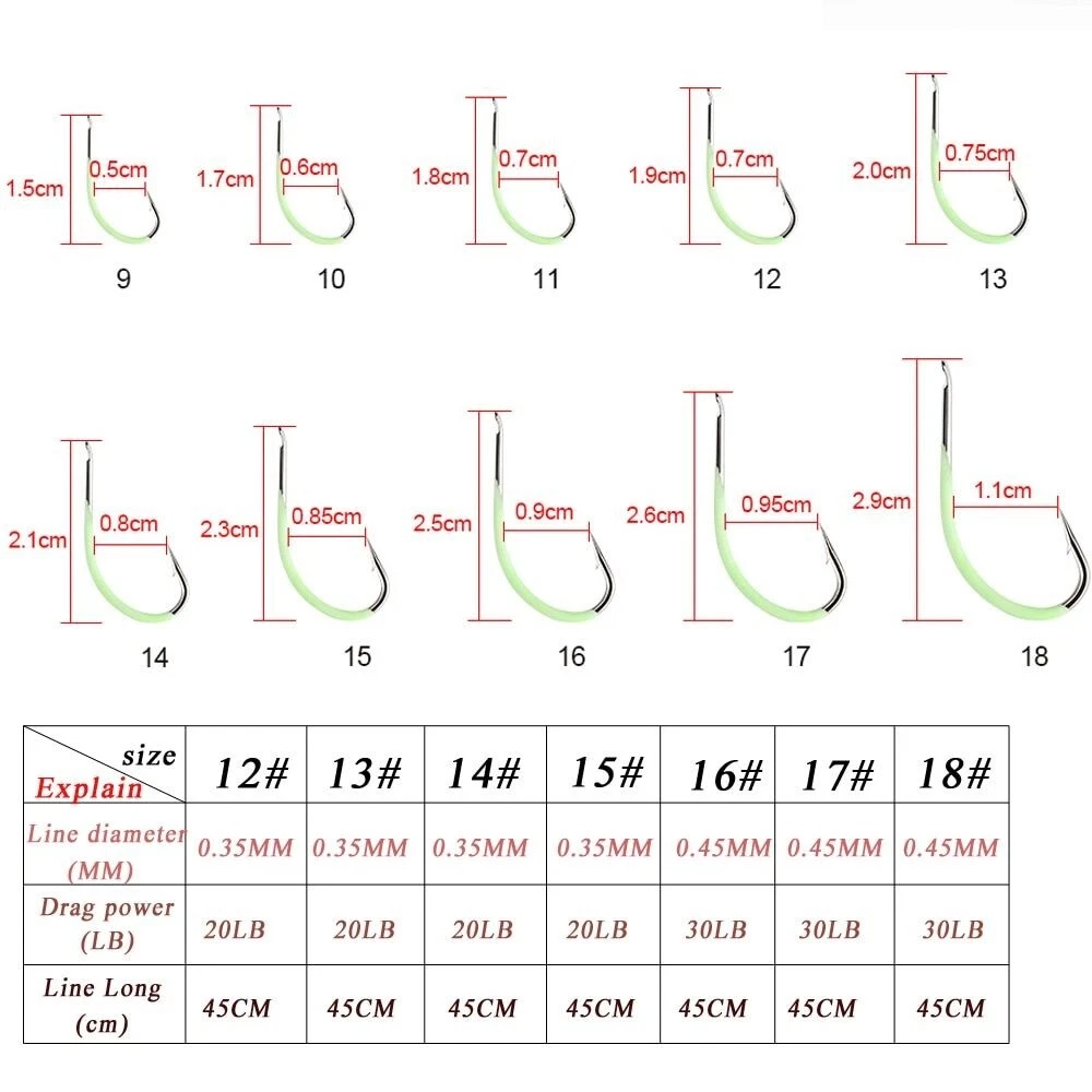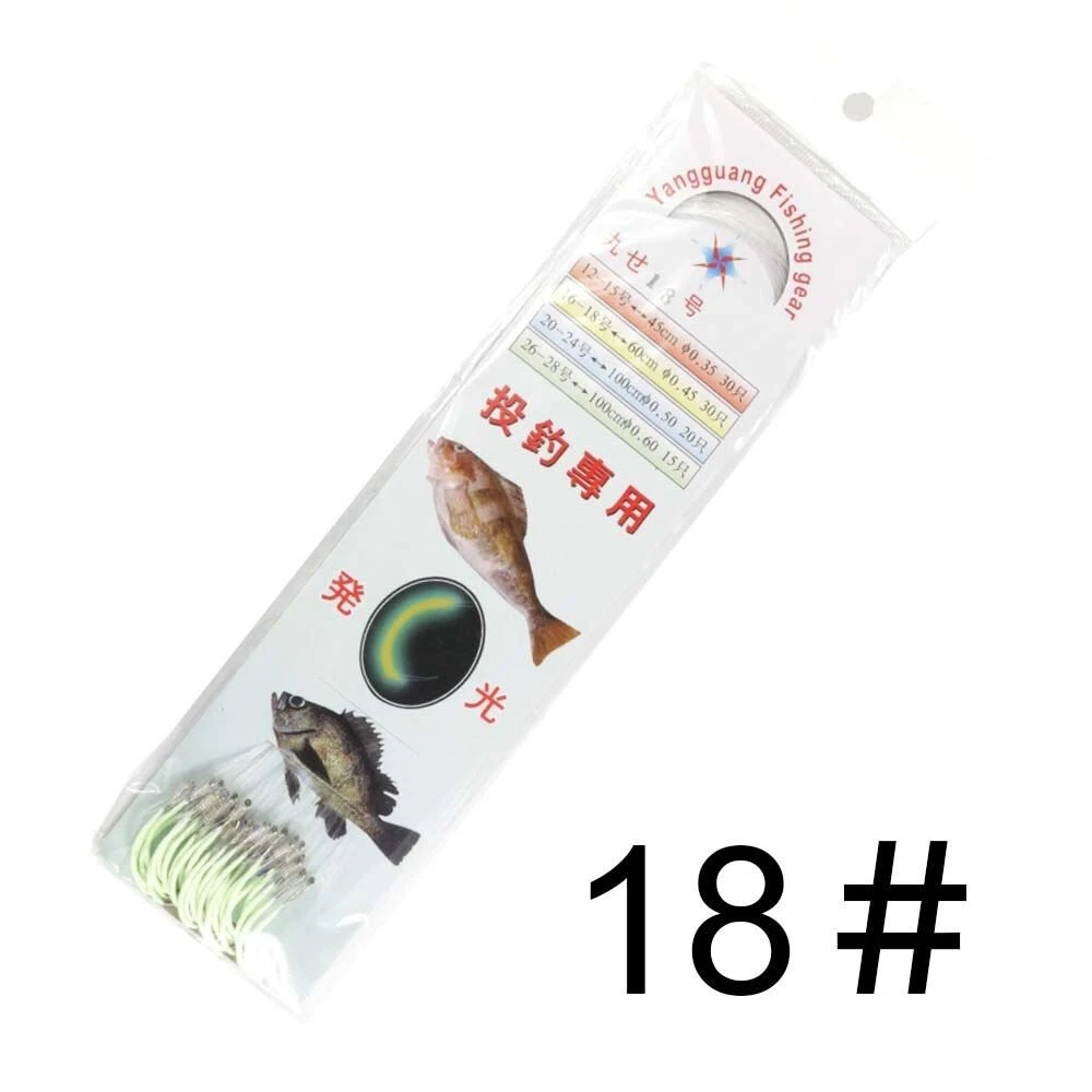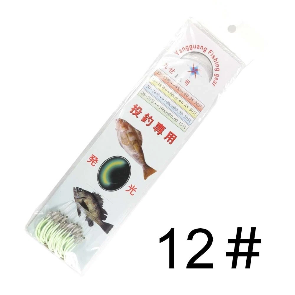 eBay 30pcs/sets Luminous Fishing Hook With Line Features: 100% brand new and high quality. Suitable for a variety of occasions, fishing a variety of fish. Barbed design, fish is not easy to run. Luminous glow attracts fish attention. Reasonable hook design, easy to bait, fish is easier to hook. Specifications: Material: High carbon steel Size: 12#, 13#, 14#, 15#, 16#, 17#, 18# Color: Luminous Quantity: 30 pcs/bag Package Included: 30 x Fishing Hooks *** If you have any questions feel free to contact us. ***