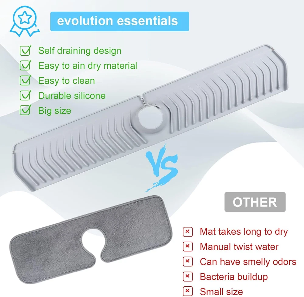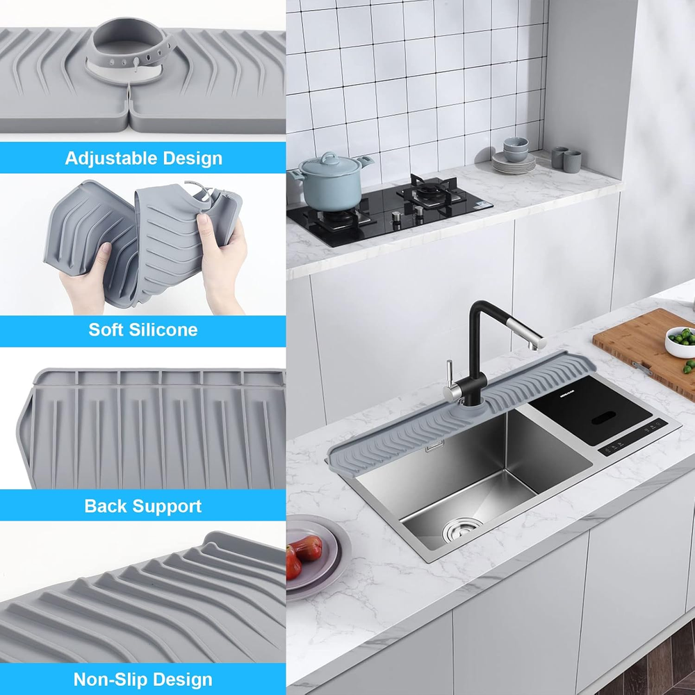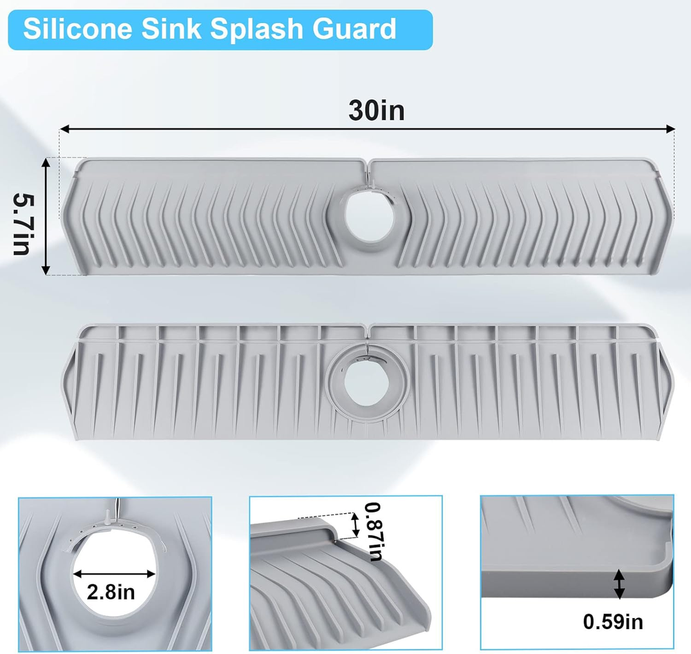 【Sink Splash Guard】The sink of silicone faucet splash guard is made of 100 % organic silicon. It is soft and reliable and can be reused and durable. 【Keep the Countertop Dry】 The silicon faucet mat is a new design for the splash of the faucet. This is a way to avoid labor to upgrade your kitchen sink! This means without wet, or any waters next to the faucet. 【Longer Product Size】30 "X 5.7" kitchen sink protective cover is larger than other kitchen sinks. The diameter of the middle hole can be adjusted, suitable for 2.8 inch water dragon pipes. It is easy to be suitable for the kitchen sink, the bottom of the bathroom or toilet to keep it clean and dry. 【Sink Faucet Organizer】In addition to becoming a good silicone faucet drip -type catcher tray, it may also be a good rest area for brushes, sponges, keep the sink counters neat and clean. 【Keep Locked】We use the lock design so that it can always be kept in place and not easy to move, which helps you keep the kitchen sink dry. Product Description