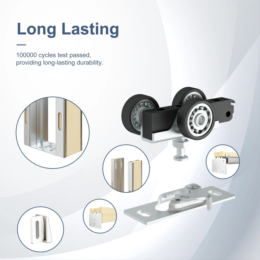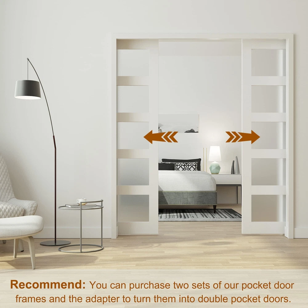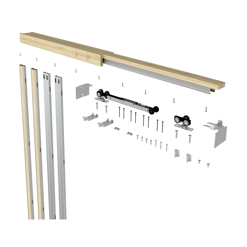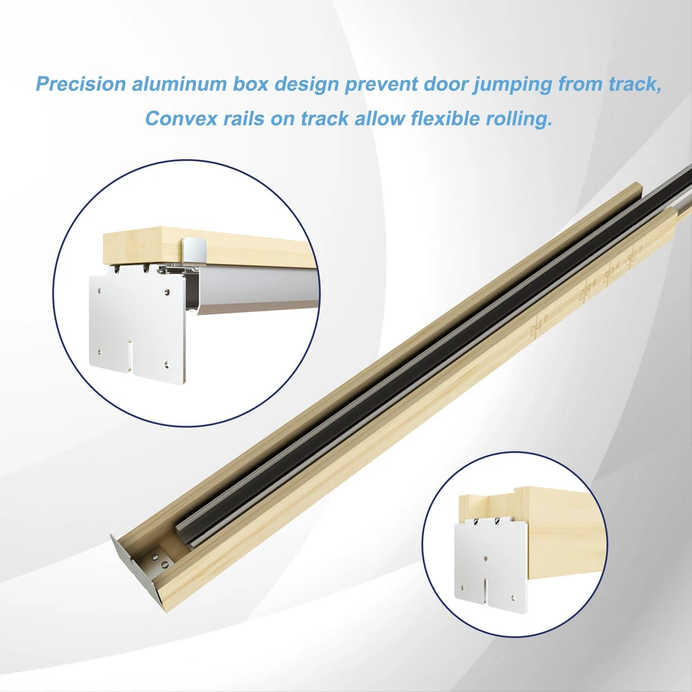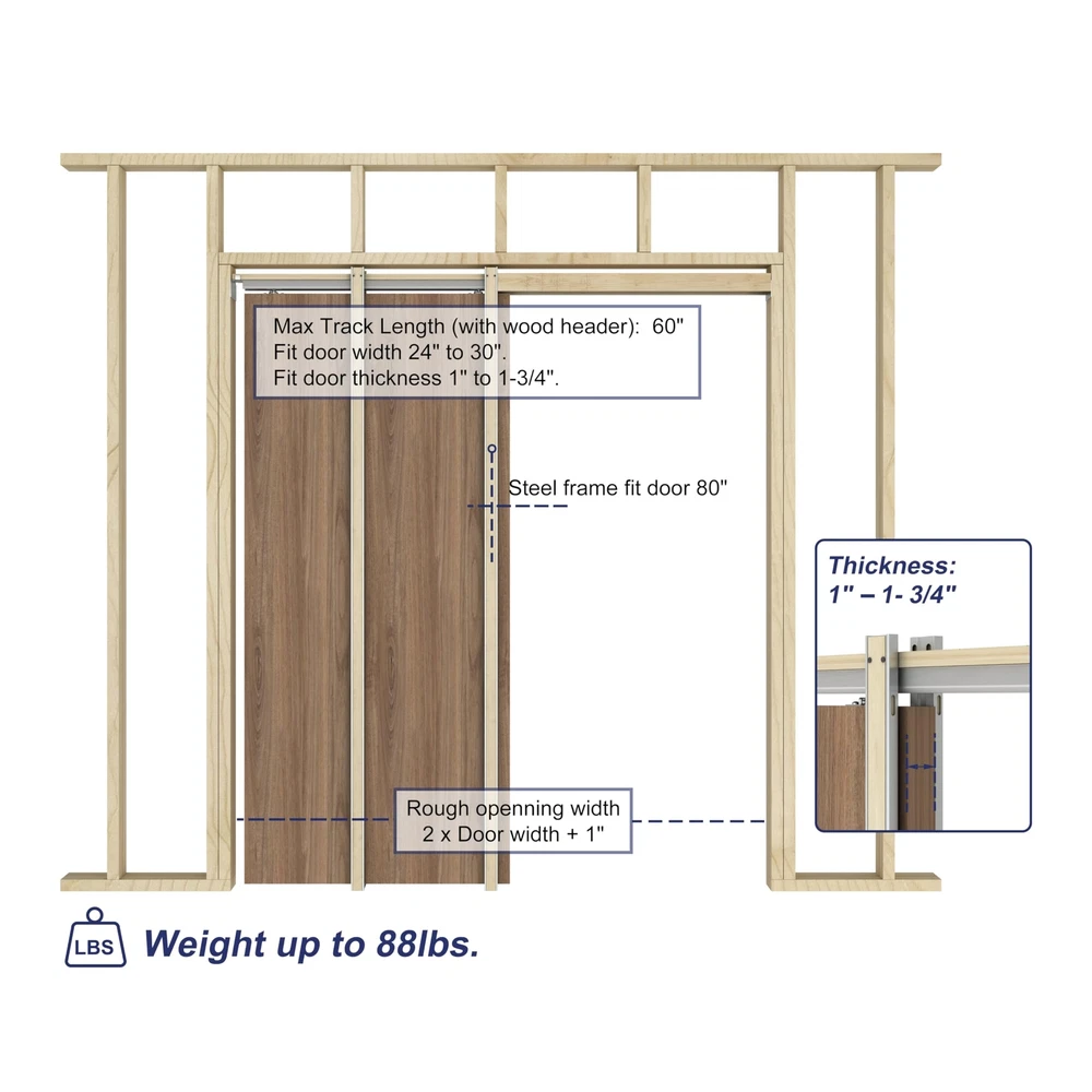 Superior High Quality: The pocket door frame kit includes strong complete galvanized steel track, durable steel reinforced wood studs, two-way soft-close mechanism and super smooth hanger, giving you high quality assurance. Durable and Sturdy: The pocket door kit passed 100000 cycles test. You can use the pocket door kit more than 10 years. It is a cost-effective choice! Excellent Structure and Design: Precision extruded aluminum box track of the pocket door kit ensures door will not jump from track. Clever design allows you to replace parts directly after the pocket door kit is installed without removing the drywall. One side of the studs is wood, and you can nail into the wood side if you need to. Dimension: The pocket door frame kit is suitable for door width 24"-30", door height 80" and door thickness 1"-1.75". The track and studs can be cut. Soft-close mechanism designed for doors weighing up to 88 lbs. Package Includes: 4 square uprights, 1 aluminum track with wood slot, 1 double sided soft closes, 2 hangers with mounting plates, 2 column bases, 2 door guides, 2 soft close triggers, necessary srews and detailed instructions. Quality Service: We are reliable and qualified manufacturer. Professional engineer team is dedicated to the pocket door kit. Professional customer service team help you solve all problems in time. We are always devoted to customer satisfaction!