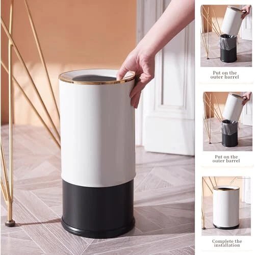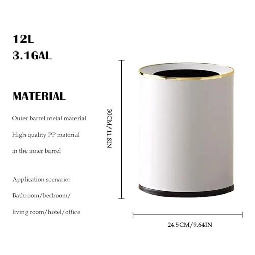 Menu 1. We require immediate payment. 2. We currently accept payment via eBay managed payments only. 3. Once payment is cleared, we will dispatch your shipment within 1-3 business days. Please refer to the "Shipping" tab for more information regarding shipping speed to your destination. 3.1 GAL Metal Trash Bin, Modern Bathroom Garbage Can, White and Gold Trash Can for Bathroom,Bedroom,Living Room,Hotel,Office (12L-White) Product description 【Circular design】 : This garbage can is simple and generous, suitable for placing in a variety of environments, whether it is home, office or public places, you can blend in. 【Double barrel design】: This trash can can effectively isolate garbage odor and keep indoor air fresh. 【Material】: The outer layer of this garbage can is made of metal material, which is strong and durable, and the inner layer is made of high-quality PP material, which has good impact resistance and aging resistance to ensure the service life of the garbage can. 【Phnom Penh design】: The mouth of the trash can has a phnom penh design, which improves the overall texture of the product and makes it a fashionable household item. 【Application scenario】 : Suitable for home, office, hotel and other places, convenient for users to discard garbage, keep the environment clean. PLEASE MESSAGE US IF YOU HAVE ANY OTHER QUESTIONS, AND MANY THANKS FOR READING ALL OF THIS. Copyright ©#. All Rights Reserved.