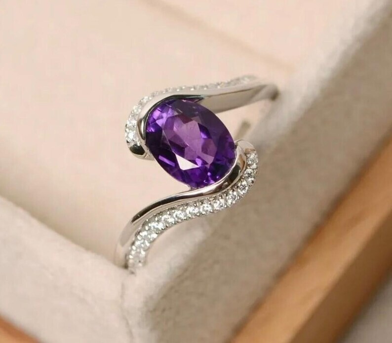 This elegant bypass promise ring features a 3.10Ct oval simulated Amethyst stone set in 14k white gold plated sterling silver. The ring is designed with a solitaire style and a bypass band, creating a unique and stylish look. The main stone color is purple, with a main stone width of 10 mm and a length of 12 mm. It is adjustable to fit all ring sizes and can be personalized as per the buyer's requirements. This handmade ring is nickel-free and engraved, making it a perfect choice for occasions like engagements, anniversaries, birthdays, and more.