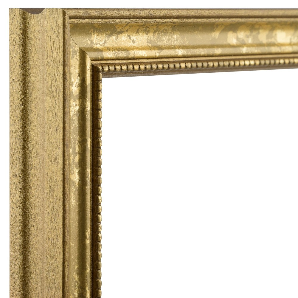 Ornate style; decorative gold facing; darker gold sidewall with beading and wood finish Frame includes: glass, rigid black backing and pre-attached stamped hanging hardware Frame holds a 11 inch by 17 inch photo/print (viewable area is slightly smaller) Frame moulding is 0.75 inches wide; real poplar; solid wood Made in the U.S.A.
