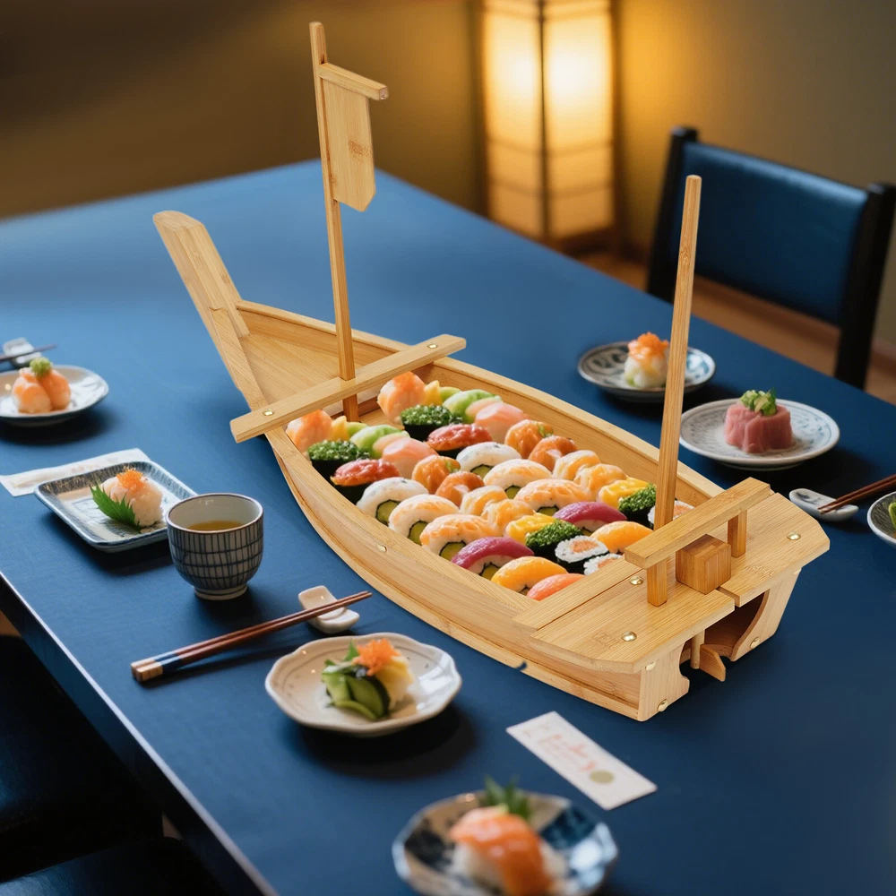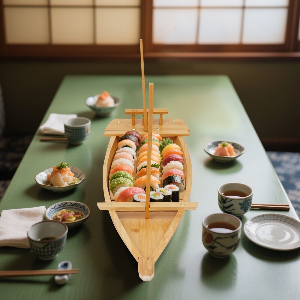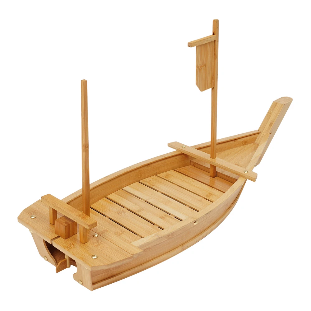 Specifications Material: Bamboo, Metal Color: Log Color Process: Varnish Assembly Required: Yes Shape: Boat Tray Type: Serving Tray Is Dishwasher Safe: No Inner Size(L*W): 40*23cm/15.7*9.1in Product Size(L*W): 80*27cm/31.5*10.6in Package Size: 82*30*22cm/32.28*11.81*8.66in Gross Weight: 1.8kg/3.97 lbs Net Weight: 1.71kg/3.77 lbs Package Included 1* Sushi Serving Tray 31.5 in Large Size Boat-shaped Sushi Serving Tray Bamboo Sushi Boat Serving Tray Description Every delicious dish loses its charm without an outstanding serving vessel. With this elegant sushi serving tray, you can fully enjoy your favorite sushi or other delicacies! Not only is it practical, but also visually appealing, enhancing your dining experience with joy. It's also a great way to impress your guests, making it an ideal choice for both sushi restaurants and home use. Key Features Selected Material: This product is made of high-class bamboo with a varnish process, which is safe, eco-friendly, wear-resistant , and reusable, ensuring a long service life. Spacious Capacity: With inner dimensions of 15.7*9.1 inches, this product offers ample space to display sushi, sashimi, fruits, vegetables, side dishes, and more, showcasing your culinary creations. Creative Appearance: Its unique boat shape and elegant log color will impress your dinner guests and easily blend into various tableware styles, adding a touch of sophistication and taste to your dinner. Visual Feast: The boat cabin can hold dry ice (not included). After placing the dry ice, add a little water to create a smoky, fairytale-like effect. This not only delights your taste buds but also offers a feast for the eyes. Auspicious Symbolism: The boat symbolizes smooth sailing, peace, and good fortune, bringing you extra luck with its positive meaning. Easy to Clean: The simple structure and detachable design make cleaning convenient, saving time and effort. Ideal Gift: Practical and aesthetically pleasing, this product adds a sense of ceremony to the evening banquet , making it an ideal gift for festivals, weddings, anniversaries, and housewarming parties. Excellent After-Sales Service: We aim to provide quality products and services. If you have any problems, please feel free to contact us . We will reply to you and solve the problem for you as soon as possible. Details Rounded Corner: This design effectively avoids accidental bumps, combines aesthetics and safety, and enhances the practicality and user experience of the product. Metal Rivets: Reinforced with multiple rivets, the product prevents water leakage effectively. The high-class rivets are sturdy and durable. Application This product is suitable for business or personal parties, buffets, holiday events, dinners, receptions, hotels, and sus hi restaurants. It is great for storing and displaying sushi, dumplings, sashimi, desserts, and other foods. Specifications Material: Bamboo, Metal Color: Log Color Process : Varnish Assembly Required: Yes Shape: Boat Tray Type: Serving Tray Is Dishwasher Safe: No Inner Size(L*W) : 40*23cm/15.7*9.1in Product Size(L*W): 80*27cm/31.5*10.6in Package Size: 82*30*22cm/ 32.28*11.81*8.66in Gross Weight: 1.8kg/ 3.97 lbs Net Weight: 1.71kg/ 3.77 lbs Package Included 1* Sus hi Serving Tray Notes Please check the product size before ordering to make sure it fits your needs. Please note that this product should only be hand-washed and not dishwasher-safe! You can apply mineral oil (not included) when cleaning to maintain its appearance. Please do not soak it in water. Because heat makes bamboo expand and cold makes it contract, so do not expose it to sunlight or cold. If the sushi boat is heavy in oil after serving meat, you can use a tiny amount of detergent with hot water (not included) to scrub it. If there is a fishy smell or other odor, please use lemon with coarse salt (not included) to clean it. Please don’t put the raw food and cooked food together, avoid food bacteria cross-breeding. Please do not steam or grill it. Please allow the slight color difference caused by the shooting light and 1-3cm error due to manual measurement, and make sure you do not mind before you order. Payment Delivery details Terms of sales About us Contact us Payment We accept ebay payment 。 Fees such as import duties, taxes are not included in the item price or shipping costs. These charges are the buyer's responsibility. Delivery details Shipping: 2-9 working days to: USA Terms of sales We maintain high standards of excellence and strive for hundred percent customer satisfaction. Feedback is very important to us. We hope that you contact us immediately before you give neutral or negative feedback, so that we can address your concerns. It is impossible to address issues if we do not know about them! About us Your satis faction is our ultimate goal. We work hard to earn your trust and future business. Our certified technicians have tested each item before shipping. The unit comes with 1 year limited warranty on all manufacturing defects. a) If you receive a defective item, you may return it or ask for a discount. Please contact us within 14 days after you receive the package. b) What you returned must be intact and in its original packaging as re? u. Customer is responsible for shipping costs of the returned item. c) We will cover the cost of shipping back t with the shipping rate indicated in the registration page. We will send you a new unit or refund the full payment you paid. Thank you. Contact us Business Hour Business Hour: Monday To Friday: 8:30 AM to 5:00 PM (Beijing China time) Due to time zones, our reply to your questions may not be immediately. But within above working time, we will reply your email within 24 hours. If it's non-workdays, please kindly be patient and wait till Monday. Please contact us with ebay message. Please feel free to contact us if you have any questions. Monday To Friday: 8:30 AM to 5:00 PM (Beijing China time) Due to time zones, our reply to your questions may not