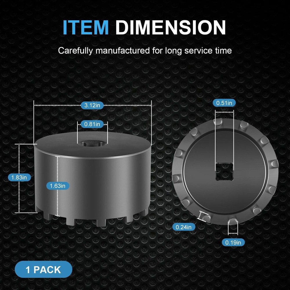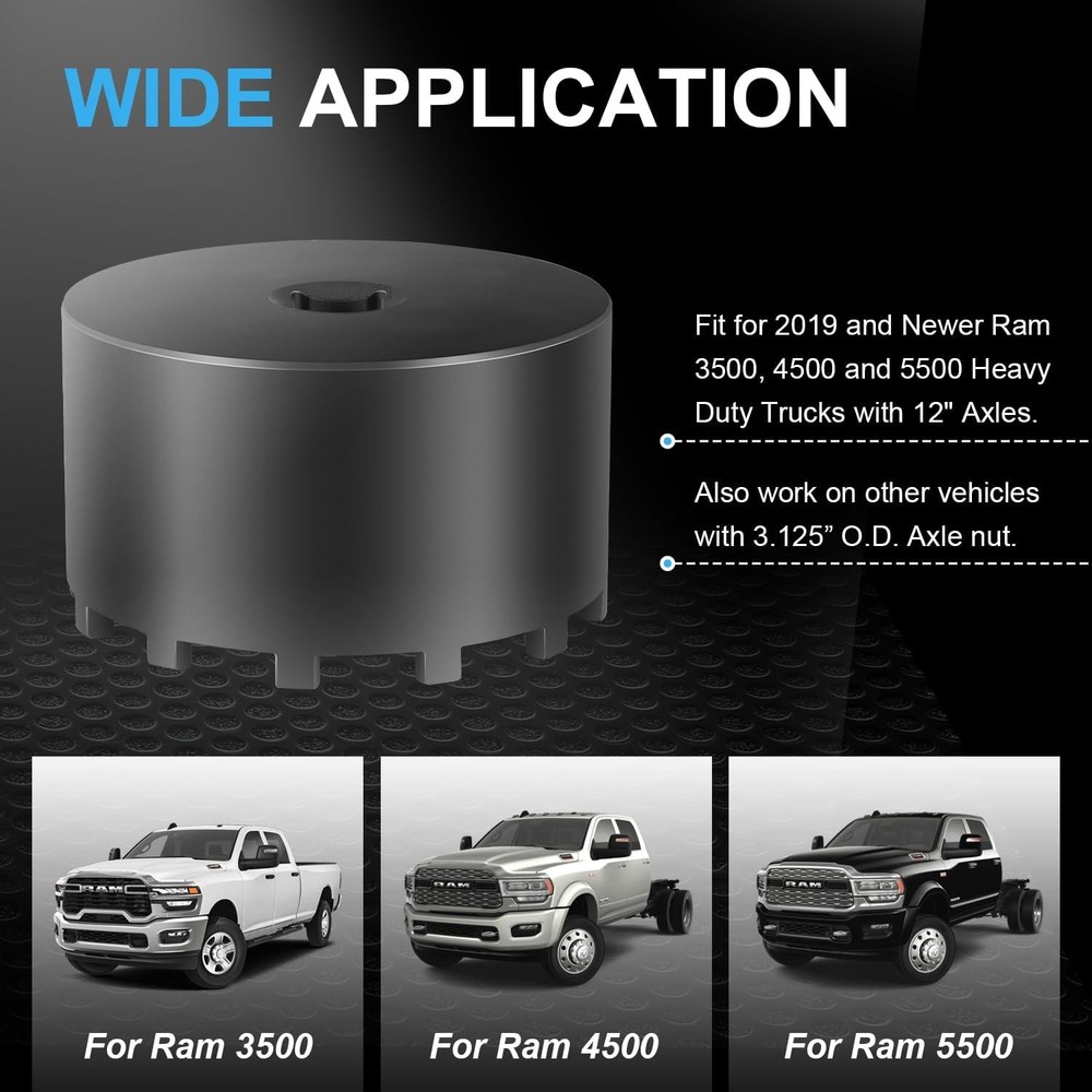 31520 12-Pin Axle Nut Socket, 1/2" Drive for Dodge-Ram 3500 4500 5500 2019-Newer 【Wide Application】 Fit for 2019 and Newer Ram 3500, 4500 and 5500 Heavy Duty Trucks with 12" Axles. Also work on other vehicles with 3.125” O.D. Axle nut. 【Feature】 The circular nut is engaged by the 12 pin socket for removal and installation. 1/2” Drive. 【Installation】 Easy to Operate. No special tools needed. 1) Align the 12 pins of the socket with the corresponding holes on the axle nut. 2) Securely attach the socket to a 1/2” drive ratchet or wrench. 3) Apply appropriate torque to remove or install the axle nut. 【Superior Material】 Made of high quality steel with heat treatment for high strength, can withstand heavy-duty use in harsh environment. The black coating on the surface provides rust and corrosion resistance, prolonging service life of the wrench. 【Satisfaction Guarantee】 If you're not satisfied with the product, simply return it for a refund in 30 days. We support 30-day refund for return and 12-month warranty. Product Description 1. All Payments must be Confirmed (Shipping and billing addresses must match) Payment is required within 7 days from the date of the auction ending. 2. We accept PayPal, MasterCard, Visa, American Express, Discover and etc payment. 1. Orders will be ship out within 1 business days via USPS, Or UPS . (Orders from Saturdays, Sundays or holidays will process on next business day and will be ship within 24 hours. ) 2. All of the items are shipped from our Warehouse in USA.It will take about 3 to 5 business days to you. 3. Any defective items received can be replaced or refunded. Please contact us with the item number, eBay ID and defect description. 1. 100% Satisfaction Guarantee: If you're not 100% satisfied with our items, simply return it for a full refund in 60 days (Items must be in new condition and in original package). Kindly please feel free to contact us before return. 2. Return or Replacements: Support 12 months' Warranty. All product will be tested in 100% before delivery. If the item is was damaged in transit, kindly please contact us for a replacement or refund (Excluding contrived damage or misuse). Any question, please don’t hesitate to let us know. We try our best to reply to your emails as soon as possible, due to high volume of daily incoming emails, we may not be able to reply your emails immediately. Please allow 24 hours for us to response. your understanding and patience is much appreciated!