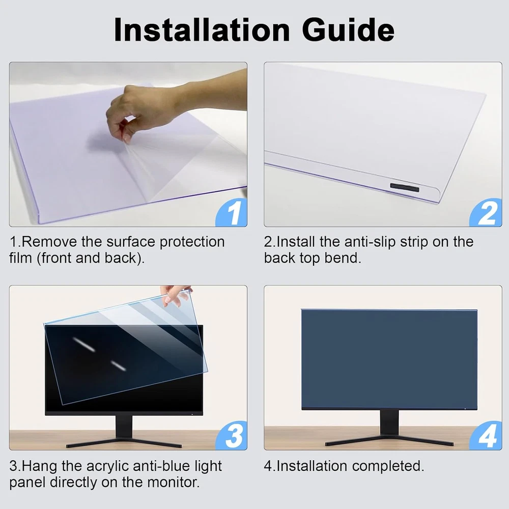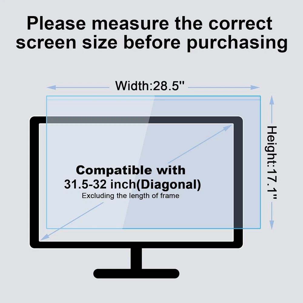 Screen Eye Protection: Note it's NOT anti glare! BSPROTE 32 inch computer screen protector for eyes blocks up to 99% of UV light from reaching your eyes and 75% of harmful blue light in the range of 380nm-495nm, reduce eye strain and prevent vision loss. Perfect for PC workers, programmer and gamer. Compatible Models: Just measure only your screen display diagonal without the plastic frame. Blue Light Blocking Screen Protector Panel specially design For 31.5-32 inch Diagonal LCD,LED, OLED QLED 4K HDTV & Computer Monitor (Product dimensions: W 28.5 inch / Height: 17.1 inch). NOT compatible with Curved Monitors. HD Not Anti-Glare: In order to retain the original full color of the screen, this blue light computer screen protector 32 inch uses of light transmittance of up to 98% of the material, high-definition restoration of the screen display, not reducing screen brightness, no chromatic aberration, double vision and grid, no dizziness. So please note it's not anti glare and reflection. Easy to Use and Remove: No tools are needed, just peel off the protective film on the surface of the computer blue light blocking screen panel (front and back) and hang it directly on the monitor. The black anti-slip strip can prevent unwanted sliding after stuck it to the top of the panel. You can also remove panel or use it again at any time. Touch screen does not work after installation. All-Round Protection: 32 inch blue light screen for monitor made of high quality and scratch resistant Acrylic, can effectively prevent accidental impacts and scratches in daily life, reducing the possibility of screen damage and providing extra security for your computer. It also effectively prevents the screen from dust and fingerprints, keeping it clean! Lifetime Replacement Policy: If there is any damage to the monitor blue light filter when you receive it or use it, please let us know first and we will resend you a brand new one - it works all the time. Product description High Definition Maintains the original color of the screen without changing the picture quality. Anti Scratch 9H hardness to avoid daily scratch. Protect monitors anytime. 1 High Definition 2 Anti Scratch