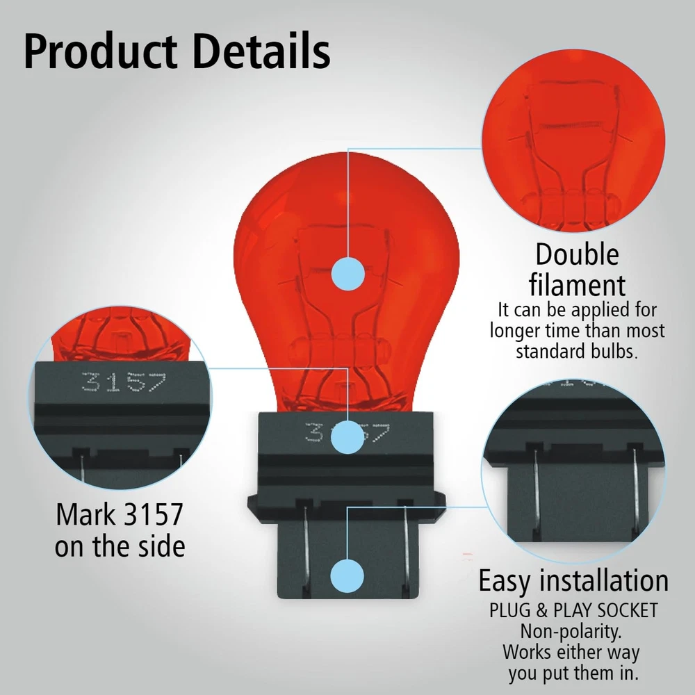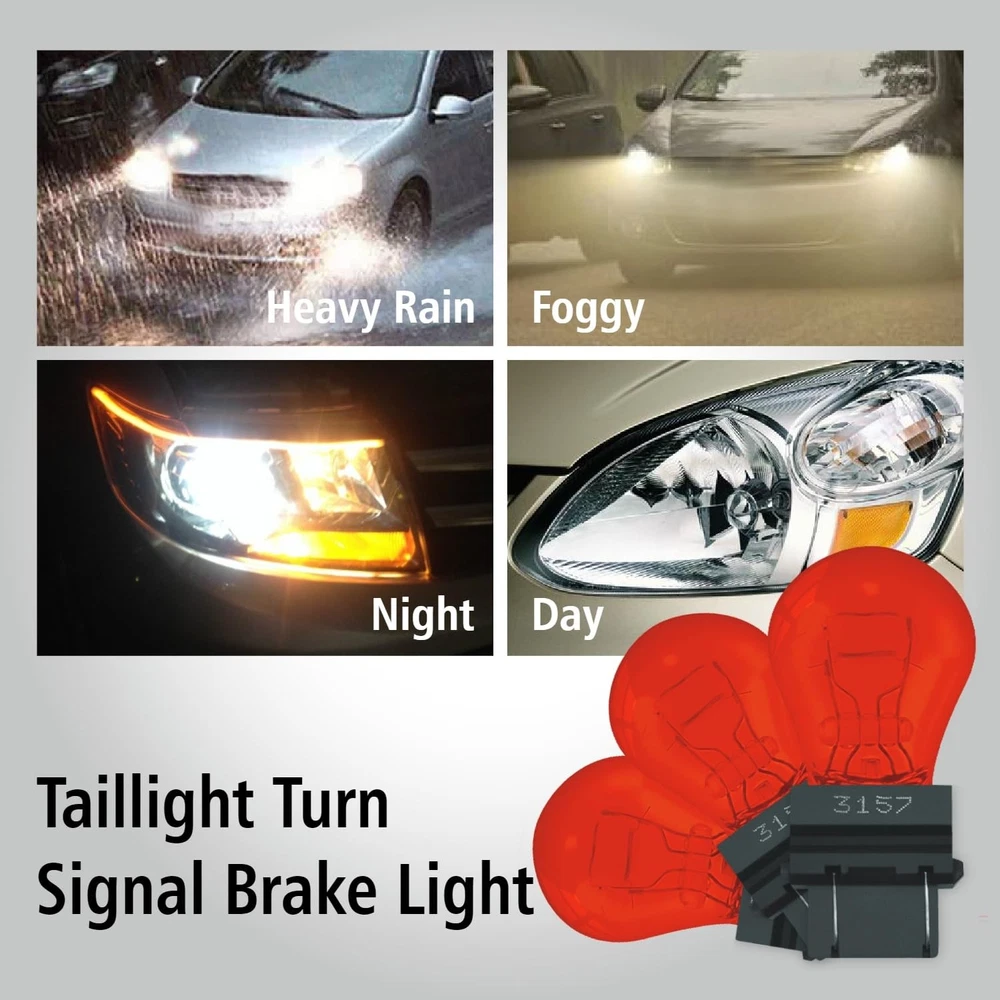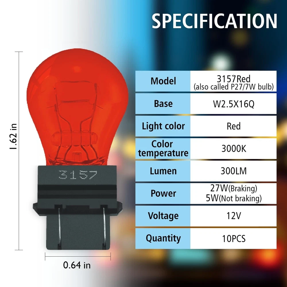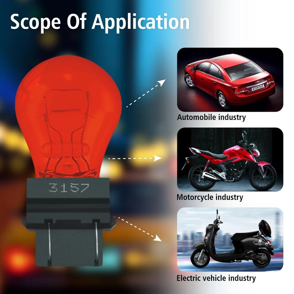best auto bulb Adequate packaging:offers a package of 10 3157 red premium bulbs for your replacement needs, which you can also share or keep as a spare. Ultra-long life:Our 3157 redbrake light bulbs are made of high quality materials, and the high precision manufacturing process makes our car light bulbs have a super long service life, allowing you to use them for a long time! Multi-functional applications:'s high quality 3157 red bulbs have a wide range of applications and can be used as signal bulbs, tail bulbs, side marker bulbs, brake bulbs and more! Fine Appearance:The well-designed 3157 red bulb has an attractive appearance and durable characteristics, allowing you to forget about maintenance and drive your car better! gentle reminder:Please confirm your car model before purchase, 3157 red car light bulb is suitable for specific car models, confirm your car is suitable or not!