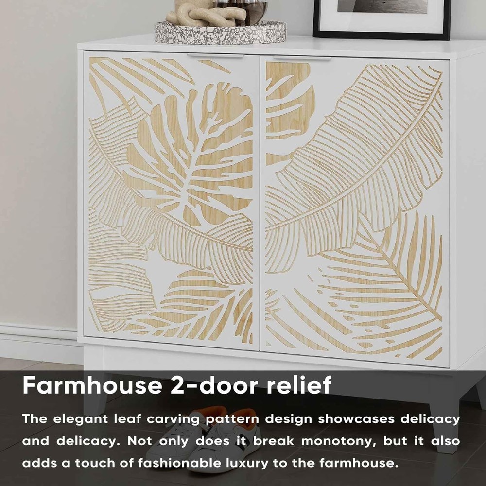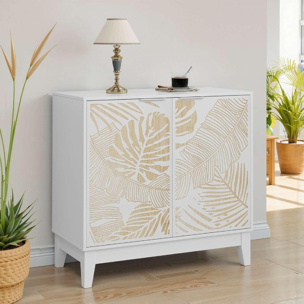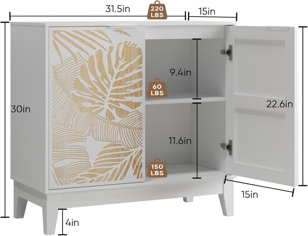 Product Description About this item ELEGANT LEAF CARVING DESIGN: The white sideboard features a stunning tropical leaf pattern carved on the cabinet doors, creating a stylish contrast between white finish and natural wood tones - perfect for adding a fashionable yet farmhouse touch to any room décor VERSATILE STORAGE SOLUTION: This 31.5"L x 15"W x 30"H buffet cabinet offers ample storage space with adjustable interior shelves at 3 different heights, allowing you to organize dishes, glassware, dining essentials, or decorative items efficiently QUALITY CONSTRUCTION: Crafted from premium waterproof MDF board with solid wood legs, this sideboard supports up to 220 lbs total weight capacity, ensuring long-lasting performance while being easy to clean and maintain MULTI-FUNCTIONAL FURNITURE: Use as a kitchen storage cabinet, dining room buffet, TV console, coffee bar, entryway table, or bookshelf - its versatile design complements farmhouse, mid-century modern, and art deco interior styles USER-FRIENDLY DESIGN: Features exquisite metal handles for easy operation, 1.96" clearance underneath for robot vacuum access, and comes with labeled components and detailed instructions for straightforward assembly without specialized tools Specifications: -Main Color: White -Main Material: MDF -Use Case: Dining Room -Wood Type: Engineered Hardwood -Storage Features: Adjustable Shelves -Product Dimensions: Assembled Length (in.):31.50 Assembled Width (in.):14.96 Assembled Height (in.):29.92 -Product Weight (lbs.):43.12 -Assembly Required: Yes 1. The color of the actual product may differ from the image due to the lighting or the monitor’s display. 2. Manual measurement has been used; there may be some reasonable error. Package includes: 1 x Buffet Cabinet