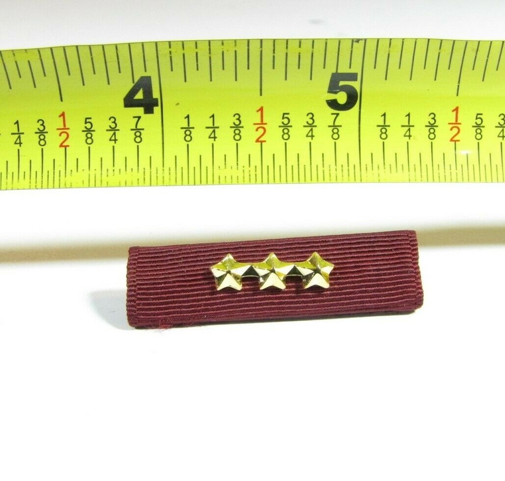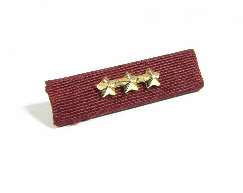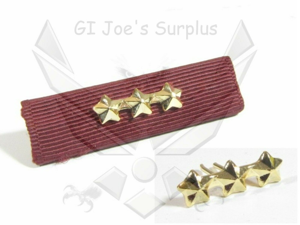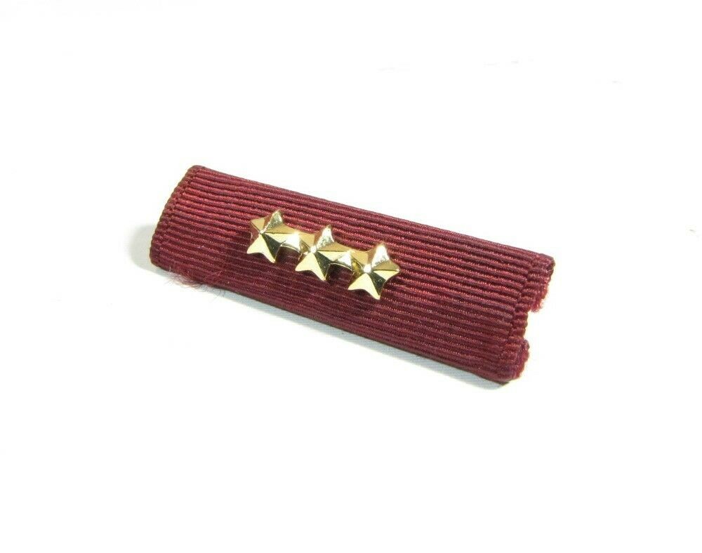 NOTE: Any photos showing military ribbons and/or additional devices, are only to show how the devices are worn and/or differences in sizes. This listing is ONLY for the device(s) listed, nothing else is included. You are are not getting any military ribbons, medals or additional items with this listing; only the device(s) shown/advertised. This listing is for a single, genuine, Vanguard, 3/16" 3-gold star, full-size military ribbon device attachment. This devices' 3 gold stars are attached on a bar for a cleaner display. These devices are new (without packaging), and are displayed to denote multiples of the same award/achievement on military ribbons and medals. Again, no medals, ribbons, or other items are included with this listing; only the star device. Please review the photos for the exact items you will be receiving and ask any questions PRIOR to purchase.
