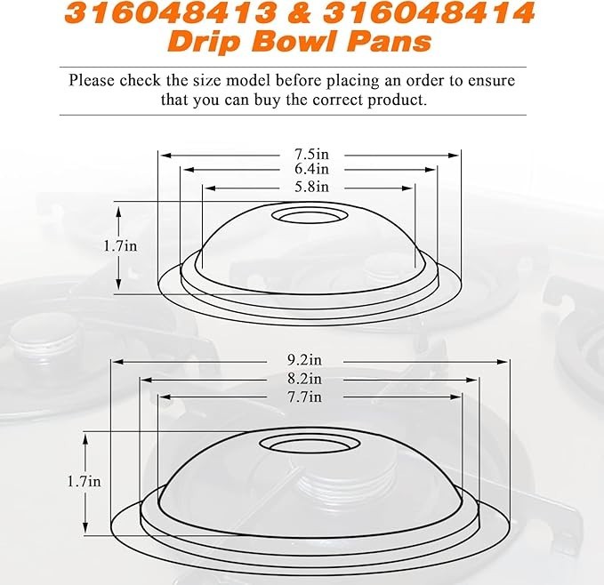 2 X 316048413 and 2 X 316048414 4 Pieces Set for Frigidaire Drip Stove Burn Pan We ship the same or next business day! Fast shipping! This part is for Electrolux OEM products. Electrolux owns AEG, Frigidaire, Anova, Westinghouse, and Zanussi. Some parts are also compatible with other brands such as GE or Whirlpool only if the model number matches. Please do not base your purchase solely on the photos or the brand name and the part type, as this may result in purchasing the wrong part model. Most parts look exactly the same, but the wrong part model will not fit or will be dysfunctional. This may result in damage to your appliance! You need to check compatibility with your appliance model number. Same day shipping: If you place your order Monday to Friday by 5:00 pm Eastern Time / 2:00 pm Pacific Time, we will ship that same business day. All weekend and holiday orders are shipped on the following business day. Our regular business days are Monday to Friday.