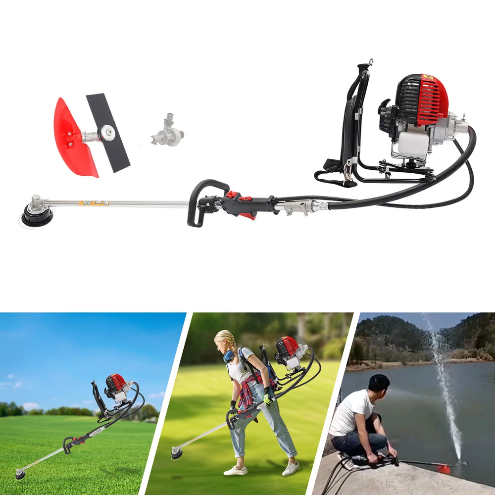 31CC 4-stroke Backpack Gas Garden Brush Cutter Grass Trimmer Lawn Mower+Pumping Backpack 4 Stroke Brush Cutter Tiller Grass Hedge Trimmer Lawn Mower Weed Wacker Description Are you looking for an efficient and durable backpack brush cutter? This product will win your favor! High-quality materials, high-power, and pumpable design for water can meet your daily needs for trimming and irrigating lawns. The lever and locking button make it easier and safer for you to operate, ensuring high working efficiency and security. This will be an ideal product for you! Key Features Sturdy and Durable : The high-quality aluminum, steel, nylon, and PP are strong and sturdy, resistant to corrosion and rust, making this item withstand high-strength use, ensuring sufficient durability. Strong Power : This product uses a sharp blade and a single-cylinder air-cooled four-stroke gasoline engine with a strong power of 750W to rotate the trimmer head at 8500rpm, making it efficient and high-quality complete lawn mowing work, delivering reliable results. Easy to Operate : The widened lever handle and hand-pull starter allow you to easily pull 1-3 times to start the machine. The extended and flexible rod can reduce usage restrictions. The throttle button can be used to adjust rotation speed, meeting your various needs. The throttle positioning button can increase the throttle by a maximum of 70% during extreme weather or when the engine is difficult to start due to heat, providing you with more convenience. Safe and Reliable : Multiple heat dissipation holes and the air-cooling model are designed for the timely discharging of heat, protecting the machine from breakdown. The safety lock of the throttle valve can avoid accidental contact with the throttle valve to cause sudden engine acceleration, so you press the safety lock to pinch the throttle valve for acceleration, greatly improving the safety of use. Considerate Design : The shoulder straps and backrest are filled with sponge to make them softer and more comfortable, reducing fatigue during prolonged use. The ergonomic grip makes your operation smoother and more labor-saving, providing you with more convenience. The air filter can effectively filter impurities and reduce damage to the machine, and the built-in silencer can effectively reduce noise and bring you a quieter operating environment. 2 in 1 Design : This product can not only be used for lawn mowing, but also for timely irrigation of your garden by replacing it with the water pump without the need to purchase additional irrigation tools, making lawn maintenance easier. Strong Stability : The various parts of the product are tightly connected, and the transmission is stable, greatly reducing the vibration problem during use. The three springs on the bottom bracket can reduce vibration and form a stable triangular support, ensuring a more stable operation. Cost-saving : The high-quality pump-film carburetor allows fuel to fully burn and convert into kinetic energy, greatly improving performance and saving your costs. Horizontal pumping design eliminates the need for water diversion, and you just need to directly put it into the water source and start the engine fuel door to pump water. Easy to Carry and Store : The compact size of 12.99*12.59*16.53 inches, detachable, and backpack design allows you to easily take it anywhere and store the product. Effortless to Assemble : The simple construction, complete accessories, and clear English instructions help you achieve a quick and easy assembly, and you just need to make sure all parts are properly and tightly nested. Details Baffle and Goggle : The baffle can prevent weeds from splashing around, while the goggle can prevent them from entering the eyes, providing you with dual protection. Fuel Tank : The 27.5oz fuel tank effectively reduces frequent refueling and fully meets the needs of outdoor work. The semi-clear design also makes it easy for you to view surplus and add in a timely manner. Application It is suitable for weeding glass and pumping in parks, residential buildings, shopping malls, lawns, pastures, farmlands, etc. Specification Material: Aluminum, Steel, Nylon, PP Color: Red, Black Style: Modern Fuel: Gasoline Power: 750W Rotation Speed: 8500rpm Displacement: 31cc Oil Tank Volume: 80ml/3.38oz Fuel Tank Volume: 650ml/27.5oz Carburetor Type: Pump-film Type Engine Type: Single Cylinder Gasoline, Air-cooled, 4-Stroke Assembly Required: Yes Mount Type: Shoulder Carrying, Free Standing Flexible Shaft Length: 88cm/34.64in Rod Length: 153cm/60.23in Engine Size: 33*32*42cm/12.99*12.59*16.53in Engine + Pump: Gross Weight: 11kg/24.3 lbs Package Size: 32*30*40cm/12.6*11.8*15.7in Rod: Gross Weight: 4kg/8.8lb Package Size: 153*11*11cm/60*4.3*4.3in Package Included 1* Backpack Brush Cutter 2* English Instructions 1* Funnel 1* Goggles 2* Allen Keys All Accessories for Assembly Notes We send the engine and water pump, and rod separately to protect the product from damage during transportation. Please wait patiently for all parts to arrive. Please read the manual carefully and pay attention to the safety precautions inside. This product uses a four-stroke motor, so please use specialized four-stroke gasoline to avoid machine damage. Before starting the machine, please ensure sufficient fuel in the fuel tank. It is recommended to replace every 20 working hours. After starting, let it run at low speed for 3-5 minutes for sufficient preheating to better protect the engine. During preheating, please speed up properly to check whether the trimmer head is normal and whether there is abnormal noise, and please turn off the engine to check whether the shutdown switch function is good and effective. Please ensure the nylon rope extends 5-10cm. It may become shorter due to wear and tear after a period of use. You only need to lightly tap the trimmer head on the ground, and the nylon rope will automatically swing out and extend. You can repeatedly tap it several times 