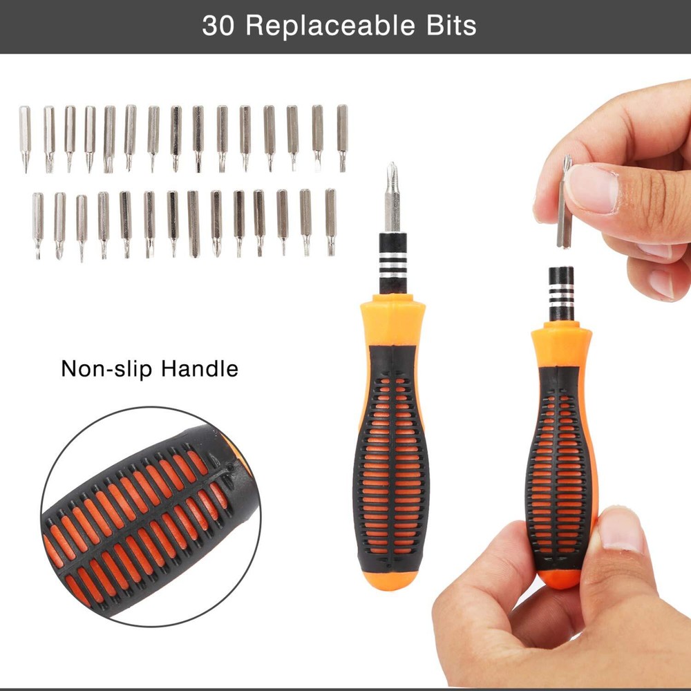 This screwdriver set is a game-changer! The magnetic tips make handling tiny screws effortless, and the non-slip grip ensures precision. With 30 high-quality bits, it covers everything from phones to game controllers—no more struggling with stripped screws. The chrome-vanadium steel feels sturdy and durable, and the compact case keeps everything organized. A must-have for DIY repairs!