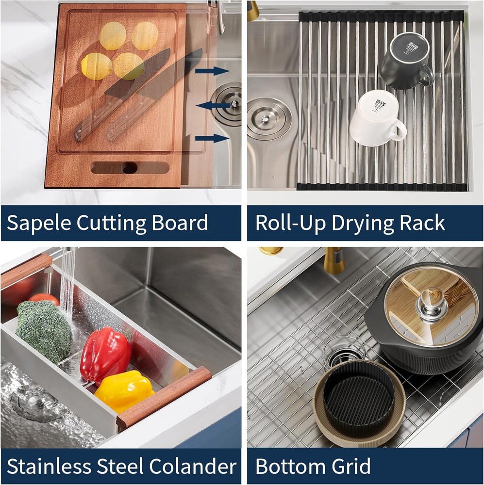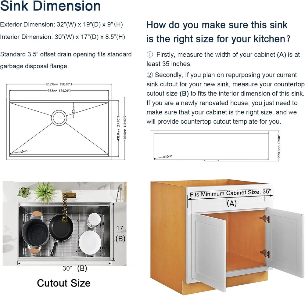 Save Counter Space & Keep Cleaning: 32 inch stainless steel workstation sink with integrated ledge allows you to slide accessories across the kitchen sink. It is equipped with various accessories to help you to wash, cutting and draining on the sink for meal prep easily and will not make counter dirty for saving your cleaning time Complete Water Draining & Easy to clean: The design of sloping bottom and X grooves make water flow into the drain immediately, no need to remove it by hand. 3.5 inch sink drain opening fits standard garbage disposal unit in the US. If you need to use with your garbage disposal, you need to buy a separate flange to fit. The rounded corners save you from having to worry about cleaning the residue from the corner sides High Quality: Made of top grade 304 thick panel stainless steel for superior dent, scratch and rust resistance. You could match it with your stainless steel appliances to tie your whole kitchen together Noise Defend: Heavy-duty sound guard undercoating on the bottom and thick sound-absorption rubber pad around the side are able to maximum noise reduction and reduce condensation Bonus Accessories: Package with 32" x 19" x 9" (fits the minimum cabinet size is 35 inch) stainless steel sink, cutting board, colander, roll up rack, mounting clips, basket strainer drain and bottom grid.