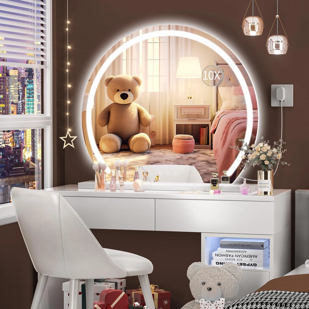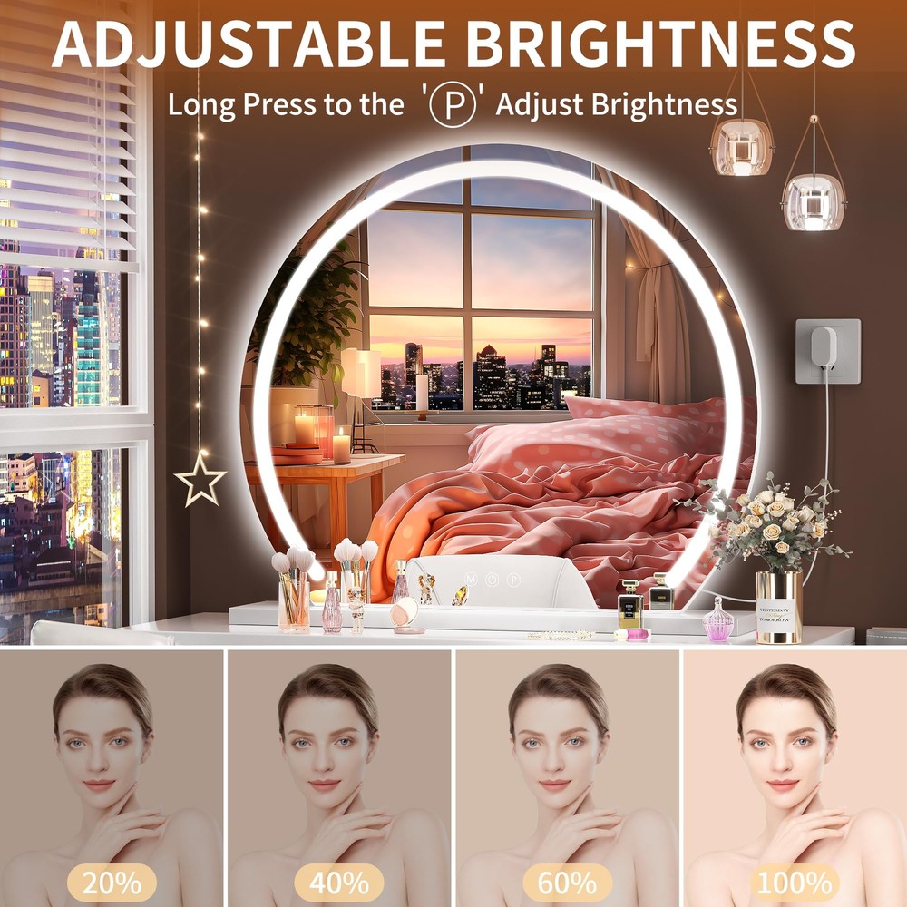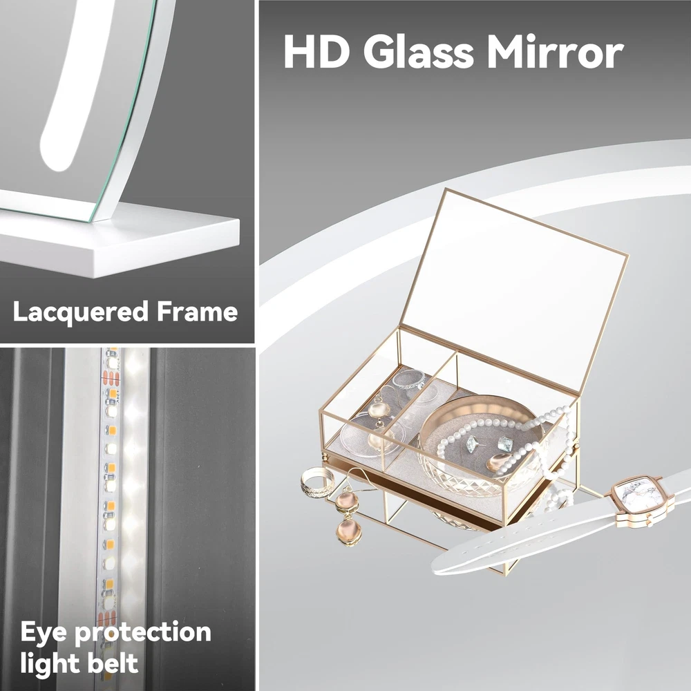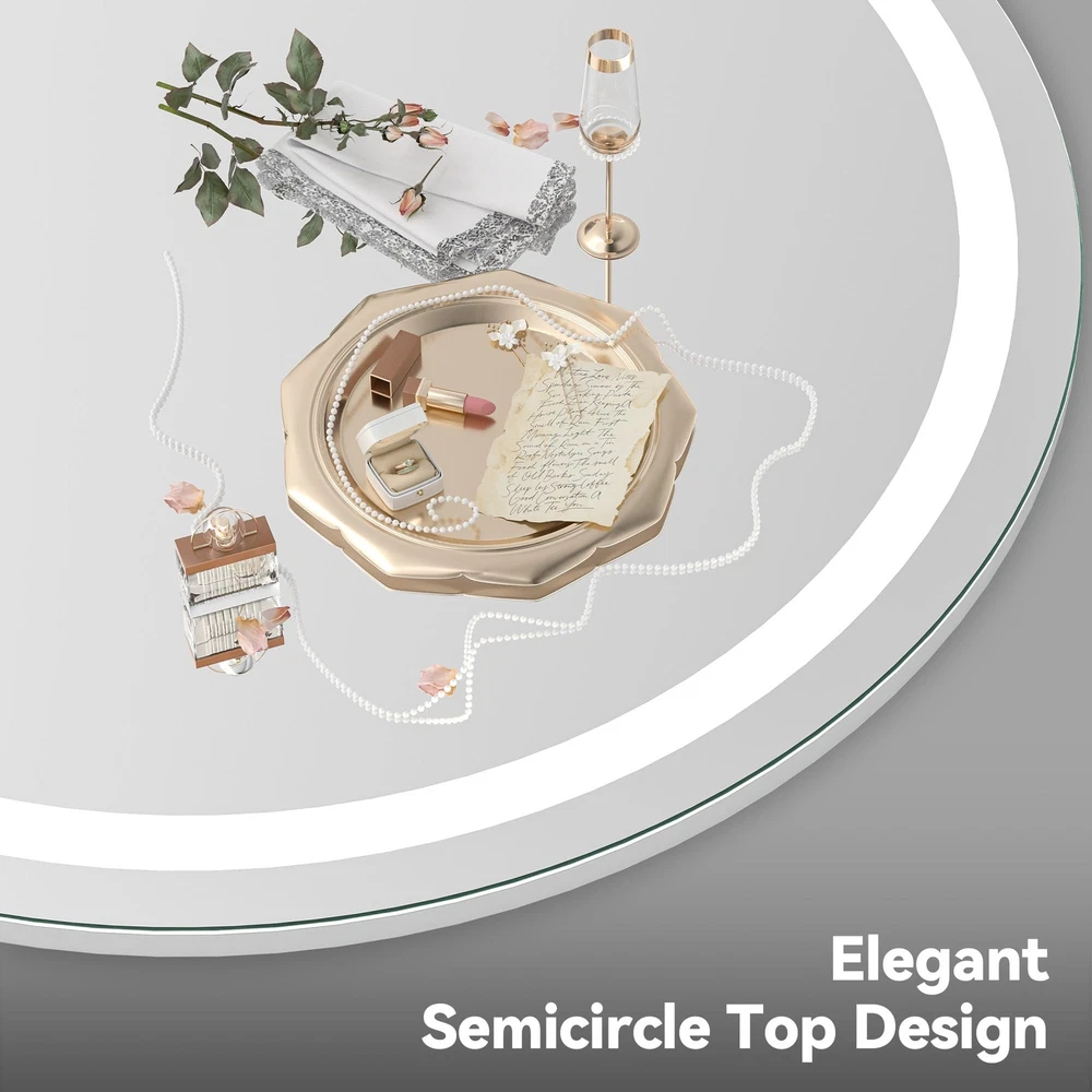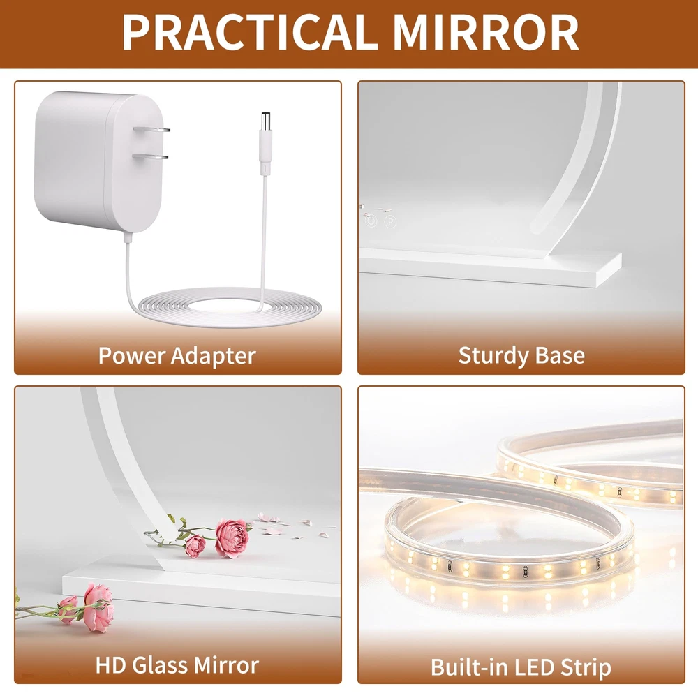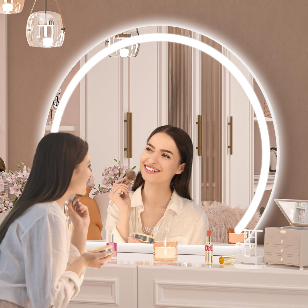 👍【Large Size & Stable Base】Big vanity mirror, 32" x 26" provide greater view when you make up. The mirror is made of a high-quality thickened iron frame and smooth base with multi-layer painting, it can be placed more firmly on the table or desktop, gloss is more durable and prevents leaving scratches on the desktop. 👍【3 Color Lighting Modes & Stepless Dimming】This lighted makeup mirror adopts an LED strip design, saves energy, and environmentally friendly. Provide bright but soft and natural light that will protect your eyes and be safe for home use. It has 3 color lights (warm light/daylight /cold light) and dimmable brightness that can meet your requirements, create flawless makeup for work/daily/dating/party, etc, and become your home multipurpose light at night. 👍【HD & Burst-proof Silver Glass】High-definition imaging explosion-proof silver mirror and glass, copper-free, environmentally friendly. Anti-fog function ensures real & clear reflection with no color cast and distortion, allow you to complete your beauty routine perfectly including makeup and daily personal care. 👍【Smart Touch Control】Quality guaranteed and longer Lifespan, 50,000 hours lifetimes and 100,000 times switch touch. By touching the button on the surface, you can turn the mirror on or off, and adjust the brightness of the LED light by long-press. 👍【Perfect Gift & Satisfaction Guarantee】This vanity mirror with lights is very suitable as a gift for girls who love beauty. Especially on birthdays, Valentine's Day, Mother's Day, Christmas, etc.