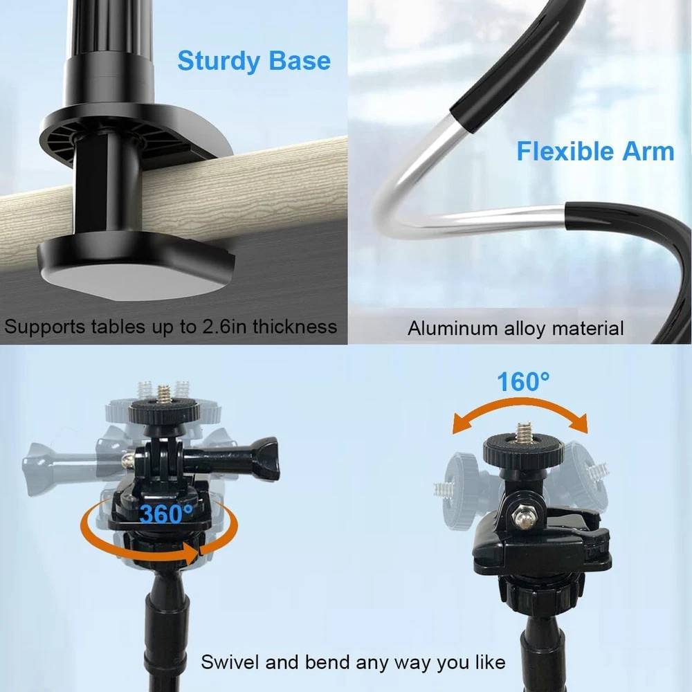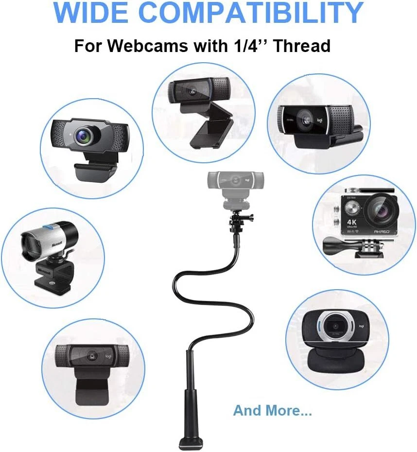 【Upgrade Thick Clamping Base】We have upgraded the clamp base. It is thicker and more durable. The clamping base is easy to be secured in place without the need to go overboard. Please place one hand over the clamp mount to move the goose-neck arm around. 【Adjustable Height and View】Up to the max 83cm / 32 inches. With gooseneck, makess it easier and flexible to operate and access different best height you want. 360-degree rotating ball joint on webcam Mount supports different best viewing angles. Please place one hand over the clamp mount to adjust the arm around.Please ensure that the desk using is steady with No wobble and it is very important to to minimize annoying bouncing while shooting and protects your valuable device from tipping over 【Universal Compatibility】 The camera mount stand fits all devices with a 1/4'' screw hole, like Webcam Brio 4K, C925e, C922x, C922, C930e, C930, C920, C615, action cameras, Gopros, Projectors, DSLRs, etc. 【Wide Application】The web cam stand with an adjustable clamp base can open maximum to 2.7"/7cm, allow you securely clamp on the desk, headboard, nightstand, end table, kitchen counter, sideboard, etc. Non-slip cushion protects your furniture from scratches. The clamp mount of the base is easy to be secured in place without the need to go overboard. If over-tightened, it may crack. This Webcam Stand Max load weight 0.7kg /1.5 lb; Not for heavy Camera and devices. The webcam will be more stable if you bend the tube as "S" or "Z"to clamp on the desk when using the webcam stand. If you have any problem, please contact us at any time. Product Description Webcam Stand - 32 Inch Flexible Long Arm Swivel Clamp Mount f Webcam and Gopro Hero Camera gooseneck camera mount Wide Compatibility Compatible with Webcam C920 C920S C922 C922x C925e C930 C93 BRIO, Other Webcams, Gopro camera, Arlo ultra, and Action camera with a 1/4" Screw Hole. Notice: 1. The clamp mount is easy to be secured in place without the need to go overboard. If over-tightened, it may crack. 2. Must place one hand over the clamp base to move the goose-neck arm around. 3. Try to bend the gooseneck arm into "S" shape which will reduce bounce and wobble to some extent. Professional Gooseneck Webcam Mount Stand Bring you a more convenient, comfortable and joyful life. Made of premium aluminum alloy and plastic material, strong and durable for daily use. It is a great option for webcam, card camera, etc. You can swivel and bend it as you like for the best shooting and recording angle and be confident it will rstay in position You can record the perfect and real-life with this webcam desk mount when in a family party, a seminar, online learning or hooting video, living stream, and etc. Flexible gooseneck Adjustable Clamp Base (Up to 3inch) Extra Aluminum alloy supportingt tube 360-degree rotation ball joint head Suitable for offices, families, stores, studios, and TV stations Long-lasting bendable arm Made of durable Aluminum Alloy material, provide a more stable and durable using experience. (Must place one hand over the clamp base to move the goose-neck arm around.) Adjustable Clamp Base (Up to 3inch) Allow you securely clamp it on the desk, end table, kitchen counter, bedside, headboard, nightstand, bed frame, etc. Non-slip sponge pads protect your furniture from scratches. The clamp mount is easy to be secured in place without the need to go overboard. If over-tightened, it may crack. (Must place one hand over the clamp base to move the goose-neck arm around.) Adjustable Arm Stand Up to the max 83cm / 32 inches. The Stiff Tube is strong enough to hold your webcam without shaking, let's enjoy our shooting time. (Must place one hand over the clamp base to move the goose-neck arm around.) 360°/160° Free Rotation The swivel ball-head provides 360-degree rotation for your webcam to get the best angle. The screw on the top also provides 160-degree rotation for your webcam. In a word, enjoy your shooting and recording time at any position you want. Long-lasting bendable arm Adjustable Clamp Base (Up to 3inch) Adjustable Arm Stand 360°/160° Free Rotation Gopro Monitor Mount - 32 Inch Flexible Jaw Long Arm Swivel Clamp Clip Mount Holder Stand