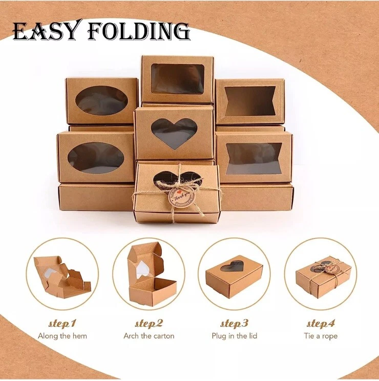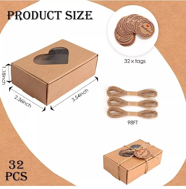 About this item Suitable for Most Shapes of Homemade Soaps:Soap boxes after folded size: 3.54x2.36x1.2 inch, it's the perfect size for Homemade Candy's, Cookies, Chocolates, or Soap bars Package Including:32 pack soap packaging boxes whit 4 different shapes window, 8 of each different shape clear window box,32 tags and 98 feet jute twines.These are sufficient quantity for packaging your handmade soaps to meeting your small business or give gifts to your friends, classmates, teachers, neighbors and children during the holidays. Quality Kraft Paper Boxes: Soap gift boxes are made of quality kraft paper, reliable and safe to use, making your gift look more delicate; With smooth knife lines and clear creases, easy to fold, no glue or scissors are needed, bringing you convenience. Easy to Store & Fold:These gift boxes come in unfolded shape , easy for store,which can be folded and applied whenever you need, no space consumption. Wide Application:The gift box for soap bars is not only suitable for handmade soap packing , but also for candy, cookies, chocolates, cosmetic samples, etc., and you can use it as a small gift packaging for your guests at your wedding, birthday party, and so on.