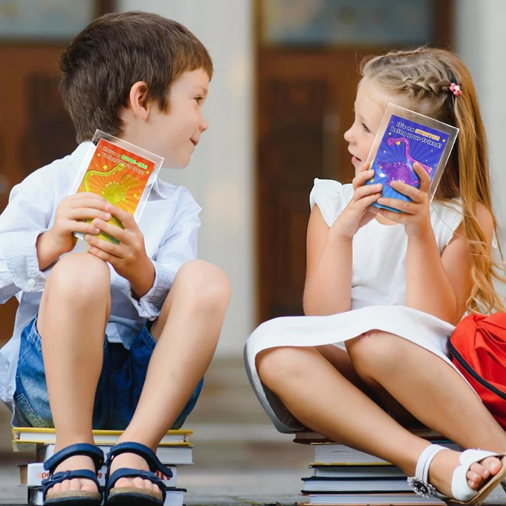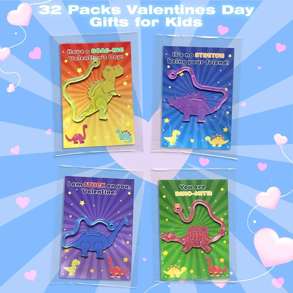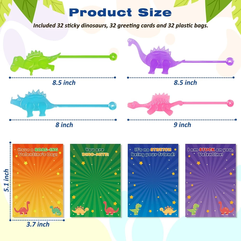 32 Packs Sticky Dinosaurs Valentines Day Gifts for Kids School Classroom Glow in The Dark Dinosaur Toys Sticky Hands Valentines Cards for Kids Class Exchange Toddler Valentines Day Gift Boys Girls Product Details School type: Elementary School Item dimensions L x W x H: 4 x 4 x 2 inches Product Dimensions: 4 x 4 x 2 inches Item Weight: 11.7 ounces Country of Origin: China Manufacturer recommended age: 3 years and up Manufacturer: poycuna 32 Packs Valentines Day Gifts for Kids ClassroomSuper value kids valentines gifts set, include 32 glowing dinosaur toys in various shapes and colors, 32 valentines day cards for kids, 32-35 plastic bags. Each card has a special punchline of greeting words, great valentine exchange gifts for kids! Glow In Dark Sticky Dinosaurs ToysOur dinosaur valentines toys for kids boys girls are made of quality TPR materials, can stretch very long, have beautiful colors, and glow in the dark. Children will enjoy sticking them to ceilings, walls, windows, tables, and almost any surface. Unique Design Valentines Gift CardsThese valentines cards for kids classroom include 4 different patterns, 32 pieces in total. Both of the patterns and Valentine's Day greetings on the card are meticulously designed. Children can write down what they want to express to increase friendship with their friends and classmates on the back. Perfect for Kids Class ExchangeChildren should learn to express gratitude and love to classmates, teachers and family. Exchange glowing dinosaurs and beautiful cards can be a hit on Valentines Day for both boys and girls. Great valentines day gifts for kids classroom! 100% Satisfaction GuaranteedProvide lifetime free return, free replacement, 24 hours prompt respond. If you are not satisfied with our products or have any problems, please feel free to contact with us, we will solve that ASAP. 32 PACKS VALENTINE’S DAY GIFTS FOR KIDS CLASS Our Glowing Sticky Dinosaur Toys Valentine Gift Set provides fun and entertainment for your kids! It’s a great gift option for kids’ school classroom prizes, gift exchange. These mini dinosaur bulks would glow fluorescent green in dark, super eye-catching to boys and girls, great dinosaur party favors, Valentines goodie bag stuffers. These cute sticky dinosaurs come in various shapes and colors, made of TPR materials, can glow in dark after absorb lights. Each sticky dinosaur was individual packaged. Throw the dinosaur toys out and stick it to the wall is a incredibly interesting entertainment!