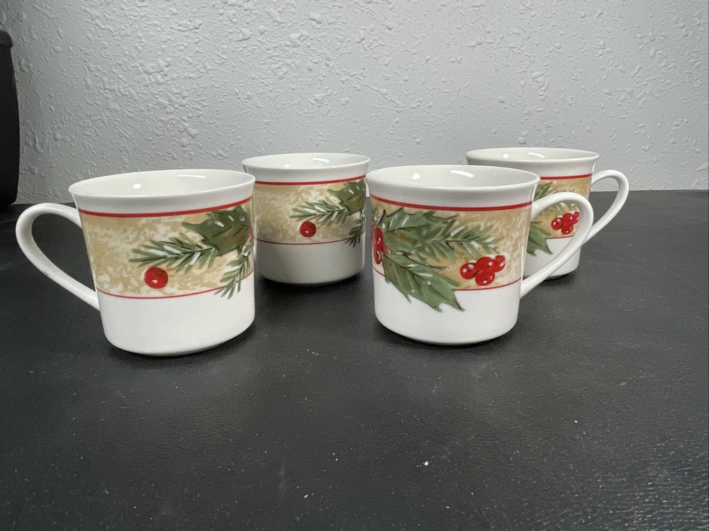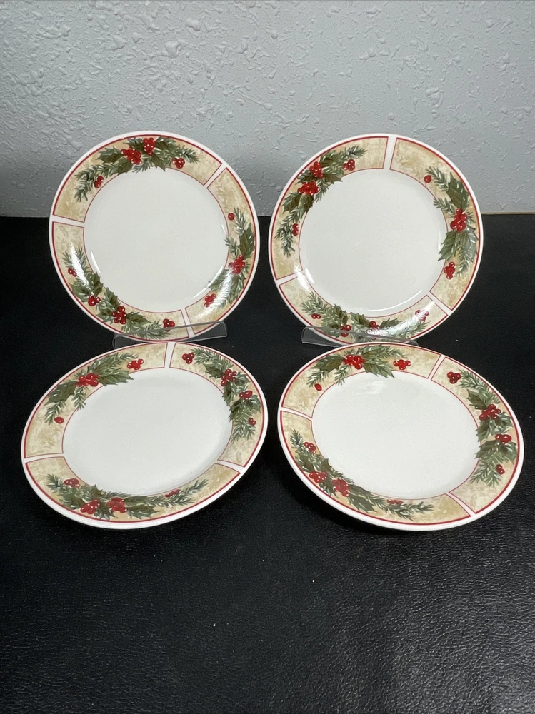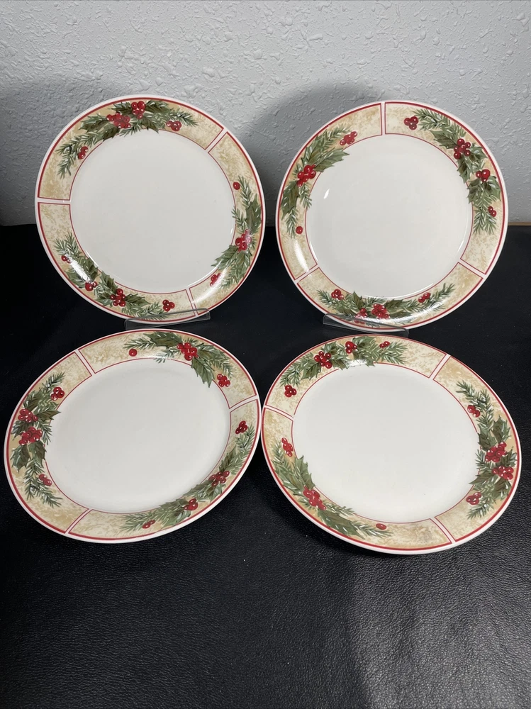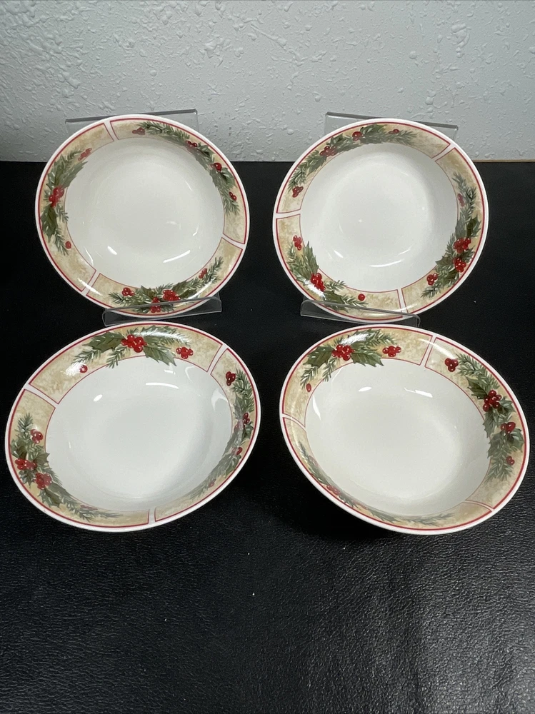 This is a 32-piece dinnerware set from Gibson, perfect for Christmas occasions. The set includes dinner plates, dessert plates, bowls, cups, knives, forks, and spoons, all featuring a Christmas mistletoe pattern with holly berries. The set is made of stoneware and comes with 16oz tumblers. It is designed for four place settings and is manufactured in China. We have 3 sets and of the piece that we have looked at show very little wear, utensil marks.