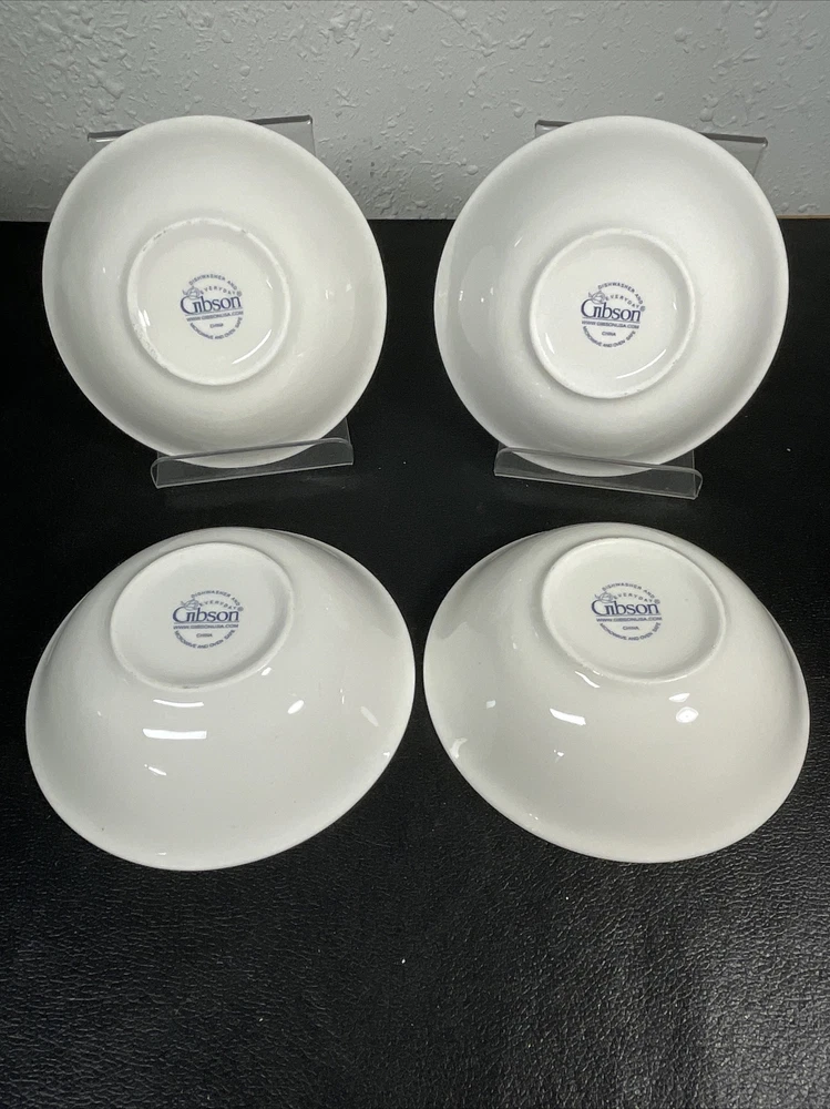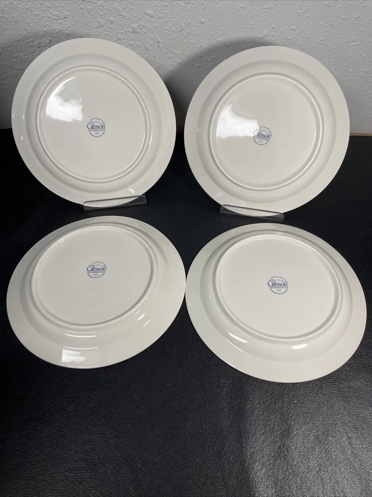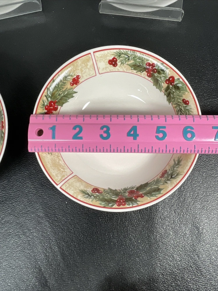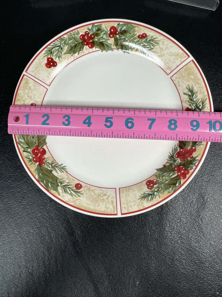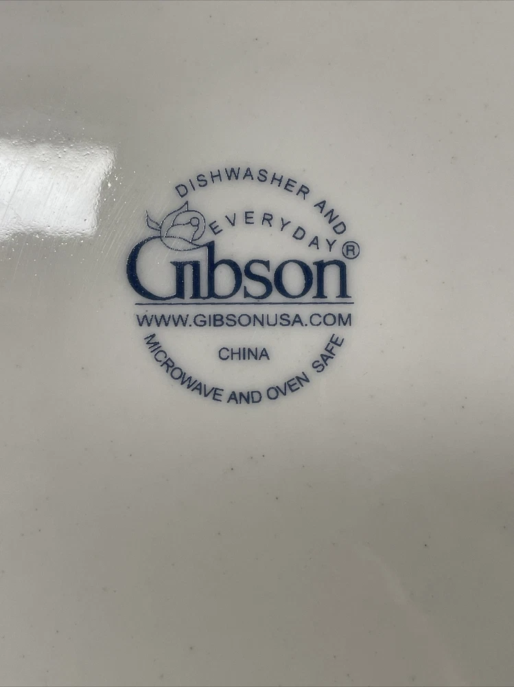 This is a 32-piece dinnerware set from Gibson, perfect for Christmas occasions. The set includes dinner plates, dessert plates, bowls, cups, knives, forks, and spoons, all featuring a Christmas mistletoe pattern with holly berries. The set is made of stoneware and comes with 16oz tumblers. It is designed for four place settings and is manufactured in China. We have 3 sets and of the piece that we have looked at show very little wear, utensil marks.