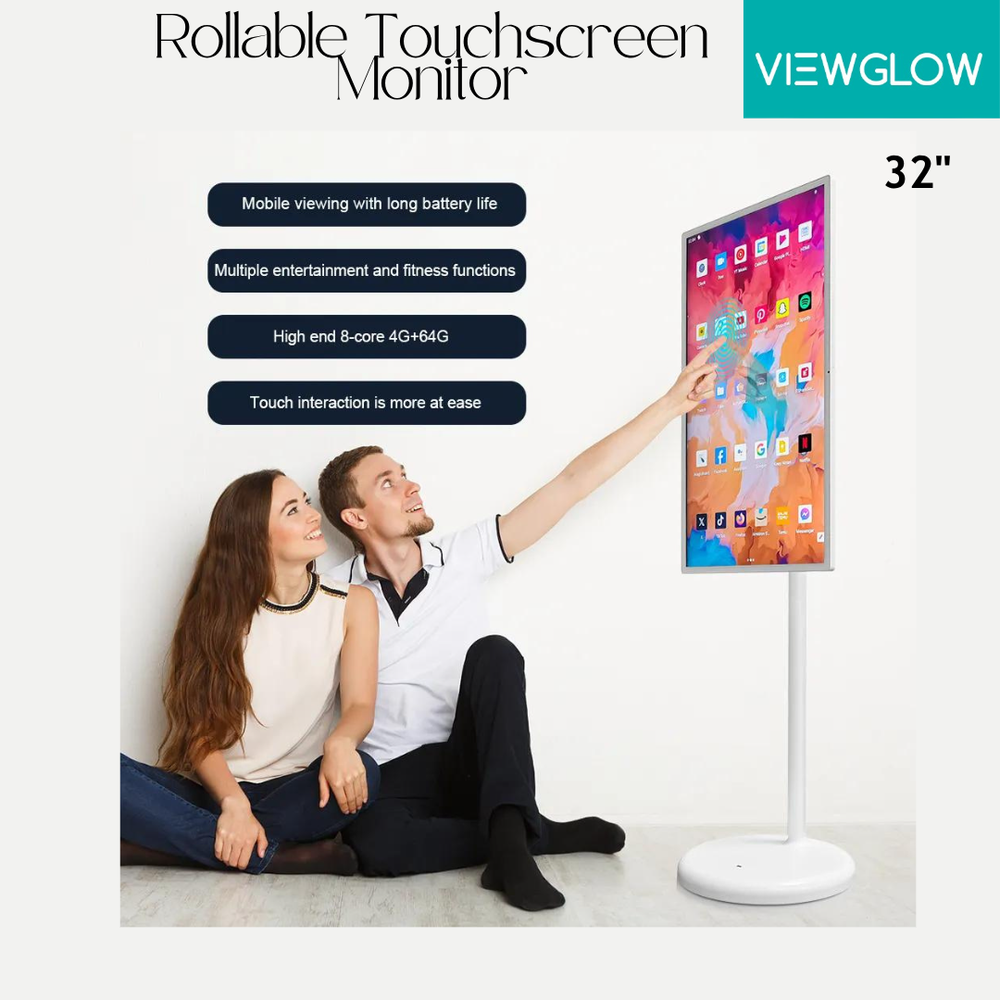 The VIEWGLOW 32" Rollable Smart Monitor is a versatile and portable display solution, perfect for daily use. Its compact design and adjustable height/tilt make it ideal for multitasking, video conferencing, and streaming. The touch screen and remote control offer effortless navigation, while the rechargeable battery provides up to 15 days of standby time. Whether you're working, learning, or relaxing, this monitor seamlessly integrates into your daily routine, offering convenience, flexibility, and high-quality visuals. Its rollable design makes it easy to take anywhere, making it perfect for on-the-go productivity and entertainment. Use it to stream videos, TV, and more! VIEWGLOW 32" Rollable Smart Monitor Features: - 32-inch FHD IPS touch screen - Adjustable height and tilt - Remote control included - Portable design - Glides on wheels Specifications: - Screen Size: 32 inches - Resolution: 1920 x 1080 - Touch Panel: 10-point capacitive - Screen Ratio: 16:9 - Brightness: 250-300cd/m² - Colour Gamut: 16.7M, 100% sRGB - Refresh Rate: 60Hz Connectivity: - Wi-Fi: 802.11 a/b/g/n/ac 2.4G+5G - Bluetooth: Support Version 5.0 Audio: - Speaker System: Built-in 80.5Wx2 - Microphone: Noise Reduction MIC 6050 Power: - Rechargeable Battery: 14400mAh Lithium-ion 19.2.4Wh - Adapter: 18V/3A Dimensions & Weight: - Dimensions (H x W x D): 57.08 x 28.74 x 16.92 inches - Weight: 33.06 lbs