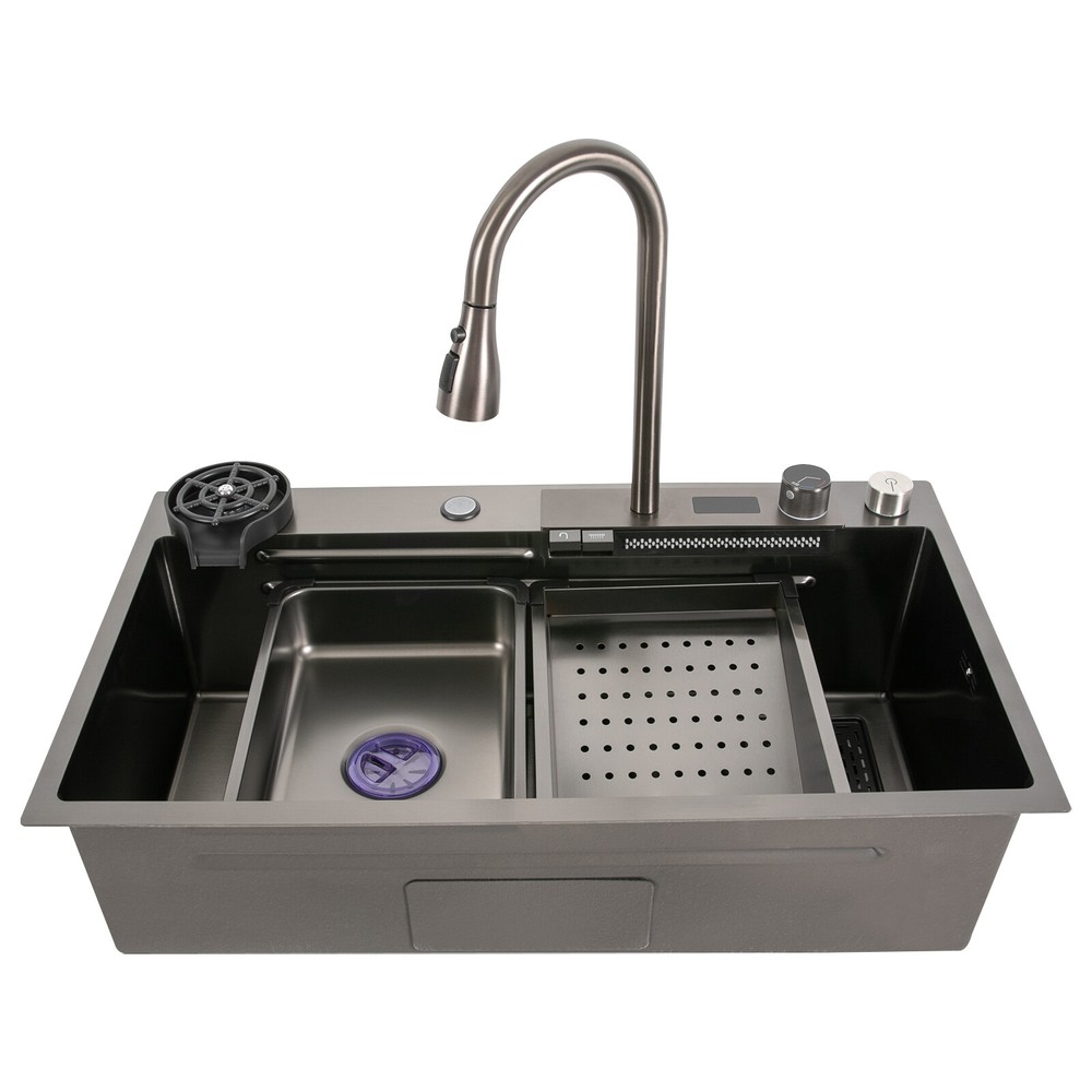Description This 201 stainless steel sink adopts a nano-electroplating process, with exquisite workmanship, which is wear-resistant and corrosion-resistant. Its enlarged and deepened sink not only alleviates splashing problems but also increases space utilization for washing large quantities of cookware. It can not only be used as a traditional sink but also can hold a cutting board for chopping vegetables and meat. With it, you can enjoy a more convenient and healthier life. Key Features Build to Last: The premium 201 stainless steel, as well as the exquisite nano-electroplating process, make this product wear-resistant, heat-resistant, corrosion-resistant, and not easy to rust and deform, ensuring a long service life. Large Sink Size: It is large (31.5*18.1*7.9 inches) and can accommodate a large number of plates, dishes, and pots at once. Moreover, it prevents splashing when washing fruits and vegetables. Washing Assistant: The 360° pull-out faucet, three water dispensing modes, and the waterfall spout make the product a wide range of cleaning and more convenient to use. The smart temperature display allows you to easily monitor water temperature and improve the safety of use, and the hydroelectric design doesn't require an external power supply, which is energy-saving and efficient. Humanized Design: The anti-condensation coating prevents condensation in the sink and thus prevents moisture in the kitchen cabinets, and sound-deadening pads reduce noise. Additionally, the right-drain design effectively increases the utilization of cabinet space underneath the sink. Multi-functional: The double-rail design of this sink helps you achieve efficient cooking. It converts into a work platform with the flexibility to place the mobile cutting board and draining basket without taking up countertop space, which greatly saves your workspace and makes it easier and more efficient for you to wash vegetables and dishes. Quick Drainage: It has deflector slots at the bottom for good drainage, effectively preventing water from accumulating inside. It comes with a convenient knob, removable strainer, and a large-diameter drain that allows large amounts of water to drain quickly while preventing food debris from clogging the pipes. Easy Installation: The simple structure and complete set of mounting accessories allow for fast and accurate installation. In addition, different mounting methods can meet your different needs. Easy to Clean: The smooth surface and round corner allow you to easily clean it without leaving dead corners of dirt accumulation. Ideal Gift: This product is stylish and high-quality and can be used as an ideal housewarming, birthday, and holiday gift for parents, friends, and loved ones. Good Customer Service: We stand behind all our guests and look forward to assisting you with your purchase. It is our pleasure to answer your confusion and questions. The end of the story between us is not "we sell and you buy". Details High-pressure Cup Washer: With it, you can operate with one hand, cleaning cups faster and more convenient, while freeing your hands. Water Purification Faucet: The product comes with a separate water purification faucet, and you can connect it to a water purifier (not included) for clean water. Narrow Edge: This design saves space and meets a variety of installation methods. Drain Pipe: It can be bent freely to suit the installation position, reducing restrictions on use. Arcs Shape: The rounded and smooth edges not only add to the aesthetics of the product but also improve the safety of use. Application This product can be widely used in homes, restaurants, laundry rooms, basements, bars, kitchens, food trucks, dessert shops, coffee shops, hotels, garages, gardens, pet shops, etc. for cleaning tableware, vegetables, fruits, pets, etc. Specification Color: Black Style: Modern Shape: Rectangular Material: 201 Stainless Steel Process: Nano-electroplating Assembly Required: Yes Cold Water Pipe Length: 60cm/ 23.62 in Hot Water Pipe Length: 60cm/ 23.62 in Downpipe Length: 60cm/ 23.62 in Faucet Height: 40cm/ 15.7in Sink Size: 80*46*20 cm/ 31.5*18.1*7.9 in Gross Weight: 13kg/ 28.66 lbs Package Size: 86*53*28 cm/ 33.86*20.87*11.02 in Package Included 1* Sink 1* Digital Pull-out Faucet 1* Cutting Board All Accessories for Installation Notes Please note that the main water outlet switch needs to be turned off after each use. Please do not let soft iron, hard or rusty objects contact with the sink for a long time. Please do not wash items in the sink with strong acids and bases. Please clean the sink after each use and wipe it dry. Please allow the slight color difference caused by the shooting light and the 1-3 cm error due to manual measurement, and make sure you do not mind before ordering.