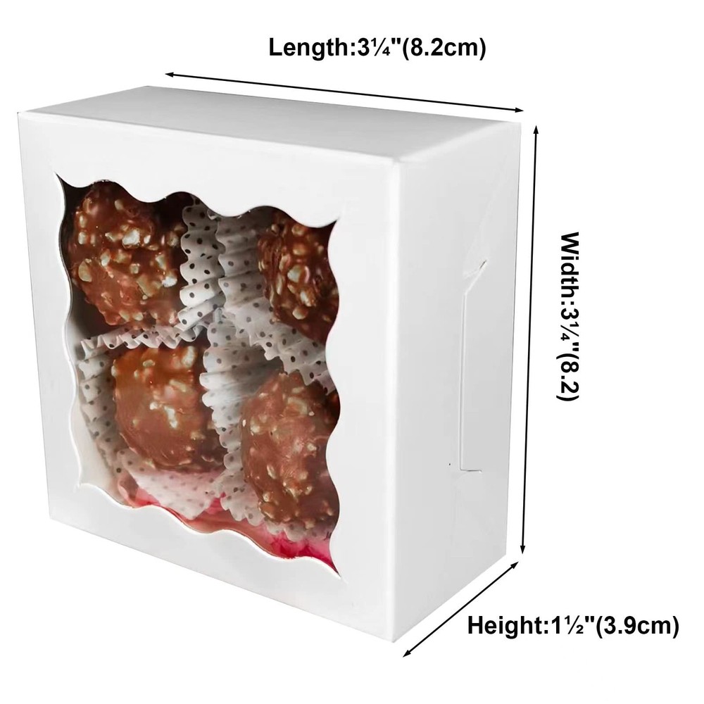 Truffle Boxes Chocolate Boxes 【Warm Tips】We sell box only, not include the inside truffle or any other foods 【Design】: Truffle box party favors Window transparent design, perfect for showing off your truffle or other delicious food, it looks more pretty and elegant 【Application Occasion】: Birthday party,wedding receptions, Christmas celebrations, graduation party favors or other occasions. 【Quantity & Premium Quality】Include: 50PCS truffle gift boxes, very easy to assemble, very sturdy and attractive, which makes your foods for a nice presentation and more elegant for your customers. 【Finished Size】3 1/4 x 3 1/4 x 1 1/2 Inches ( 8.2 x 8.2 x 3.9 CM) These window transparent Truffle containers are perfect for Truffle or any other small candy fit the size, depending on the size and packaging style