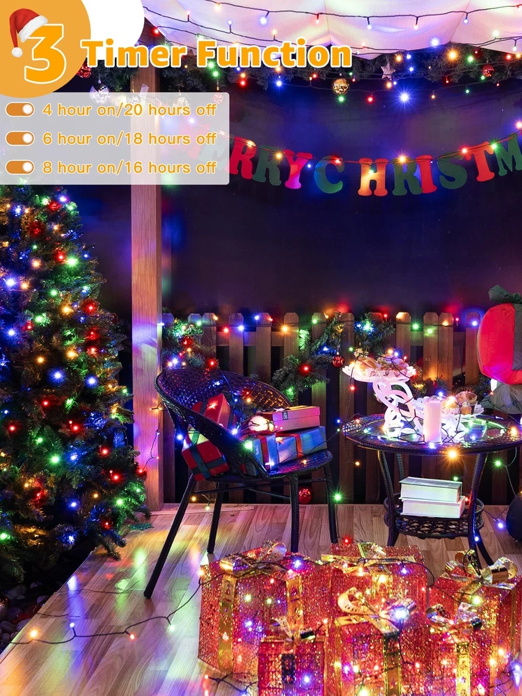 Extra Long and Bright Christmas Lights: The LED outdoor Christmas lights are 1000 LED 328 FT in length and emit a colorful glow that will create a holiday atmosphere in your space 8 Lighting Modes: The Christmas lights for tree has 8 lighting modes; (Steady ON, In Wave, Sequential, SLO-GLO, Chasing Flash, Fade, Twinkle Flash, Combination) Timer Memory Function: The LED Christmas lights features 3 timer function; 4 hrs on & 20 hrs off; 6 hrs on & 18 hrs off; 8 hrs on & 16 hrs off; The memory mode will save the previous settings 4 Dimmable Ways for Widely Use: The outside Christmas lights have 4 brightness adjustments range from 25%, 50%, 75%, 100% to choose Waterproof and UL Certification: The multicolor Christmas lights are certified by UL588; With IP44 waterproof rating; the lights remaining bright even during extreme weather