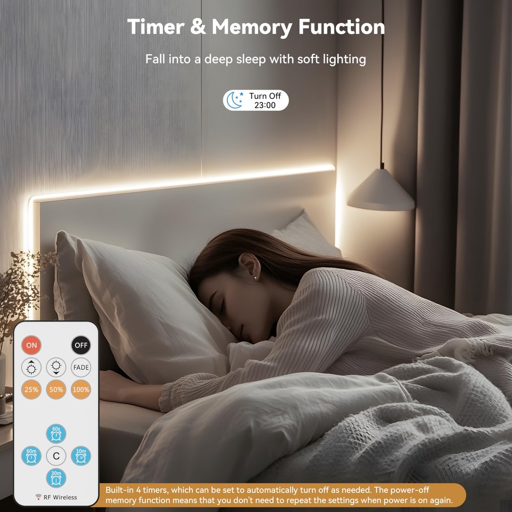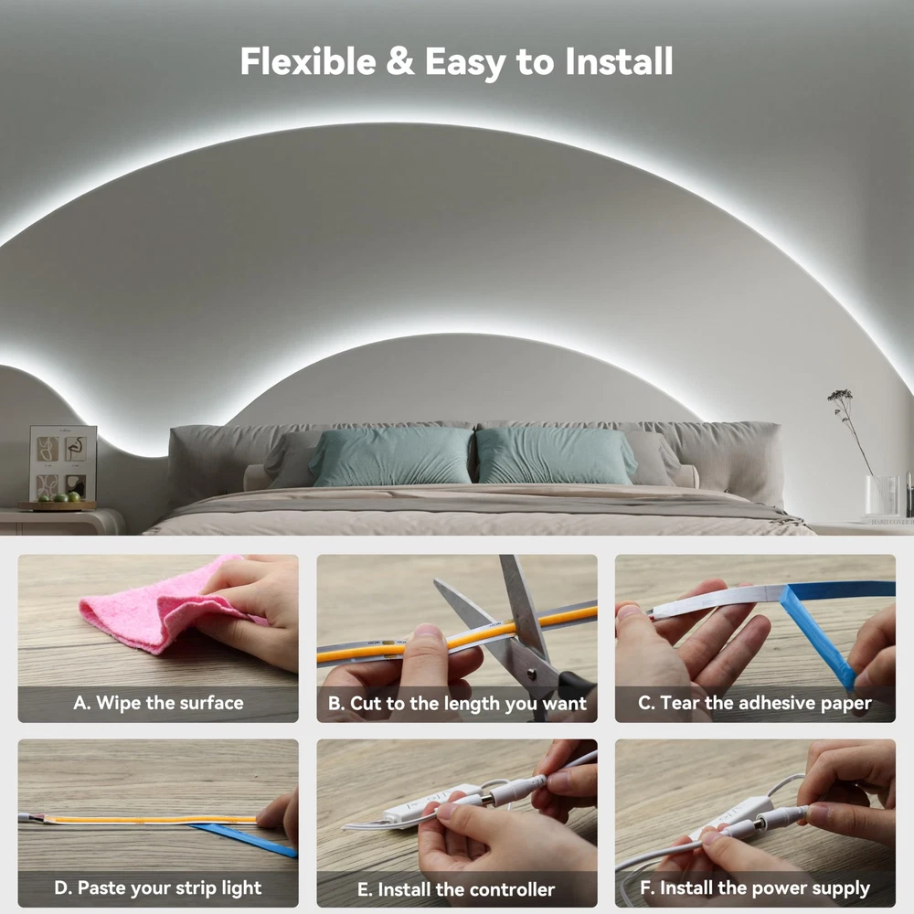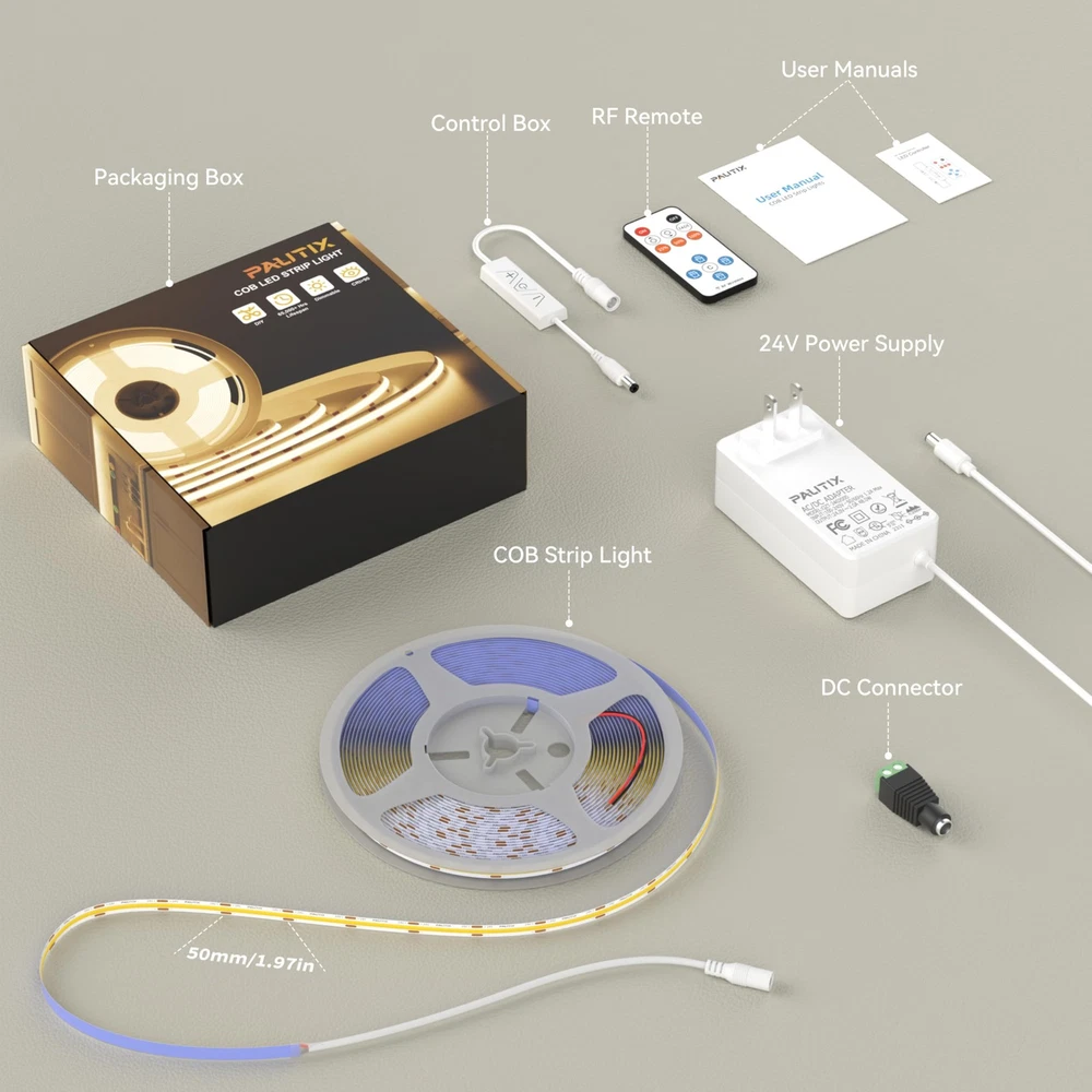 COB LED Strip Light 32.8ft,Engineering Level UL Listed Daylight White 6000K,CRI93+ Super Bright High Lumen,Dimmable 24V Flexible LED Tape Light with RF Remote,for Home&Office Decor DIY Lighting Super Bright & Long: Never heard of COB LED strip lights? Compared to SMD LED strips, COB (Chip On Board) LED Lights have multiple chips on the PCB (Printed Circuit Board), resulting in a super even lighting performance with no dark spots! With 4800 high-quality LEDs and a 6000K color temperature, you'll enjoy incredibly bright lighting and improved color quality.The ultra-long continuous length of 32.8 feet/10 meters can satisfy you to decorate large spaces! Dimmable & Multifunctional: The RF remote control with 10 dimming levels allows you to easily dim the strip light! 3 preset brightness levels (25%, 50%, 100%) can help you quickly set the brightness of the strip light. 4 timing functions (60s, 10m, 30m, 60m) can make the strip light to turn off at the set time. It even has a memory function. When the strip light is turned off and on again, the previous settings will be restored and continue, no need to repeat the settings! Flexible, Easy to DIY: Cutting can be done every 50mm/1.97in along the middle of the copper sheet metal. The cut strip lights can be reconnected by using 8mm connectors or soldering (connectors sold separately). The ultra-thin PCB board close to 1.3mm/0.05in makes the COB strip light very flexible. You can bend it and even DIY more shapes. Super sticky double-sided adhesive backing tape makes installation more firm! UL Listed, Safe and Durable: The working voltage of the strip light is 24V low voltage, very safe to touch! They are UL listed and made of lead-free materials, reliable quality and harmless to human health. With double-layer pure copper PCB board, the strip light has better conductivity and heat dissipation and is not even easy to crack, with a service life of more than 65,000 hours! The color rendering index is as high as 93+, and the color reproduction is more realistic! Widely Use: These COB LED strip lights can be used to replace traditional SMD LED strip lights, providing higher brightness lighting! 6000K daylight white COB LED strip light is ideal for high-end business clubs, under cabinets, vanity mirrors, dressing tables, closets, bunk bed lights, bookshelves, wine racks, stairs, TV backlights and other places where dry/clean/smooth is required DIY lighting decoration Packaging and After-sales: The package contains: 1 X 32.8ft/10m 24V COB LED strip light 6000K daylight white; 1 X RF remote/controller; 1 X DC24V 2A 48W power supply; 1 × DC female connector; 1 × user manual. provides a 6-year warranty service for each customer. Please contact promptly if you encounter any issues while using the product and will provide you with professional guidance and satisfactory solutions! Tips: The red & black wires at the end of the strip can be cut off if you don't need to connect more strips. The red & black wire at the end of the strip is convenient for you to connect the DC connector included in the package so that you can power at both ends when you add longer strips in the kit! The 48W power supply in the kit is just enough for the strip light in the kit use. You must replace it with a higher output 24V power supply if the total length of the strip light exceeds 32.8ft.