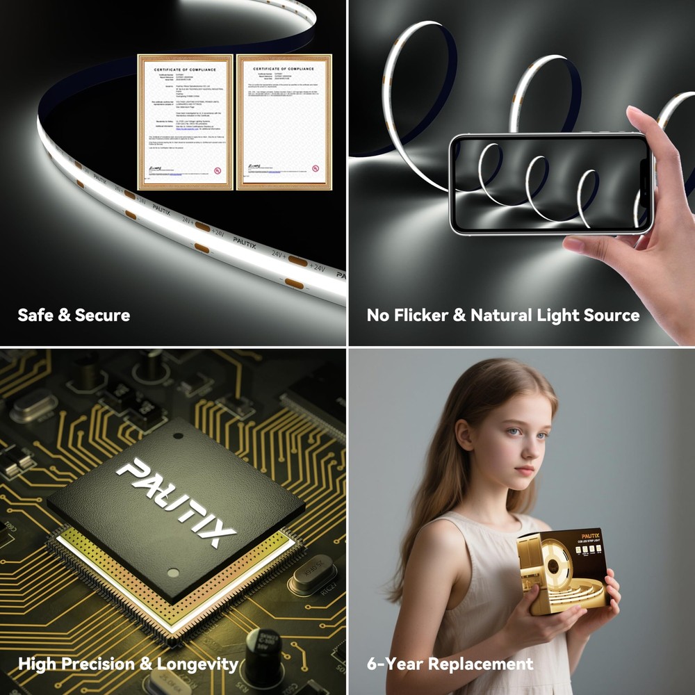 1. This COB LED strip light is a game-changer! The 6000K daylight white is crisp and bright, with no dark spots thanks to the advanced COB technology. It’s super easy to install, dimmable with the RF remote, and perfect for home or office lighting. The high CRI93+ makes colors pop, and the UL listing ensures safety. Love how flexible and long it is—great for DIY projects!