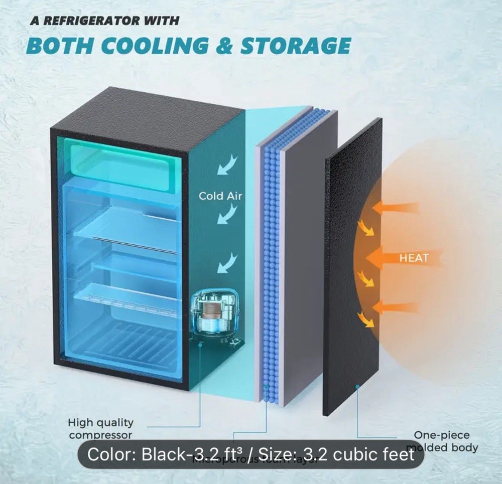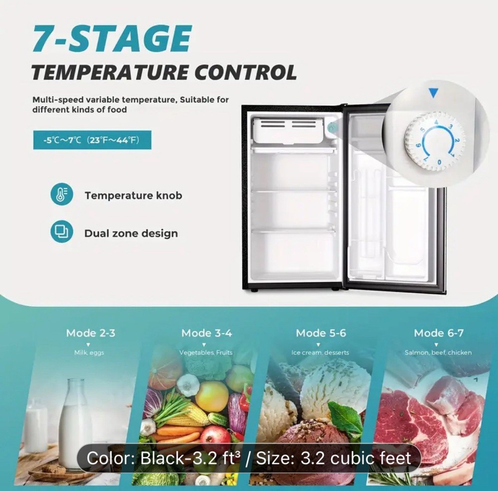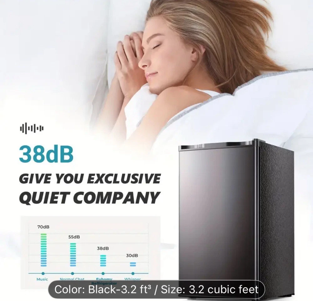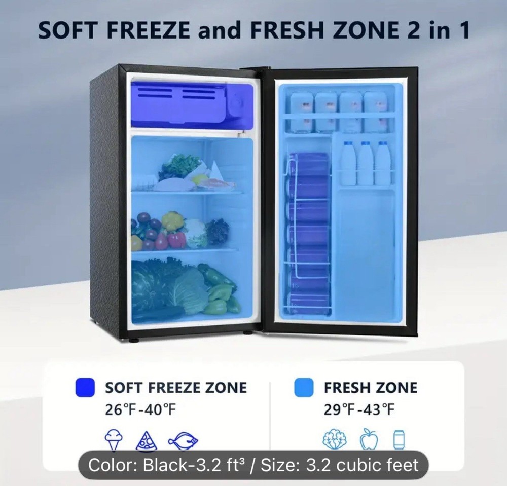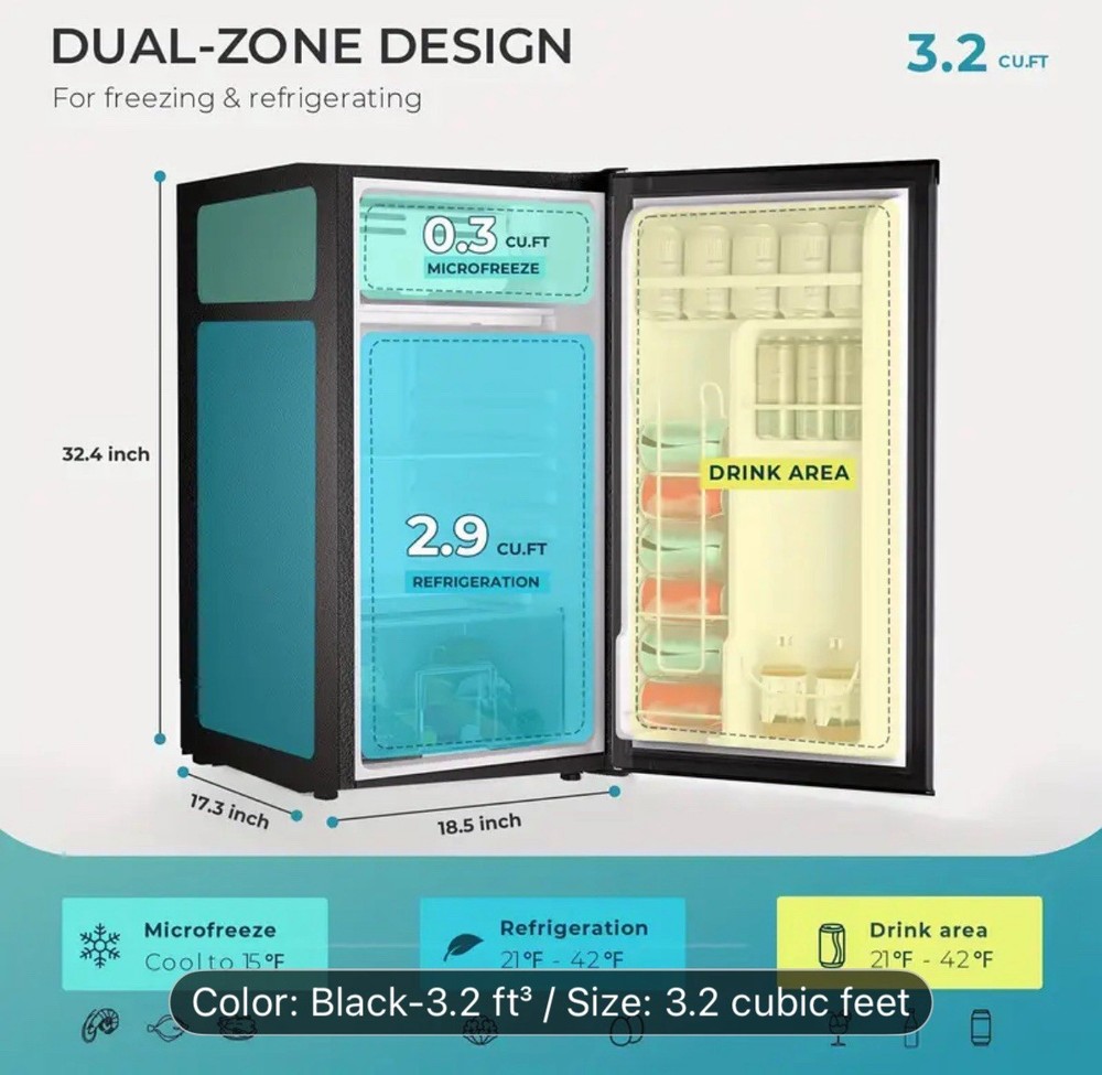 The product is a compact 3.2 cubic foot single door mini fridge with a freezer, ideal for home storage. It features three shelves, a less than 20 inch wide opening, and a capacity of 1-5 cubic feet. This freestanding refrigerator has a sleek black design, measuring 32.4 inches in height and 18.5 inches in width. Its compact size makes it a practical choice for small spaces or as a supplemental refrigerator for additional storage needs.