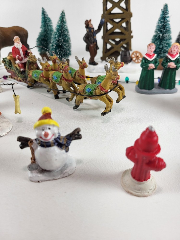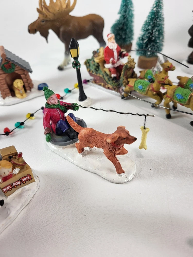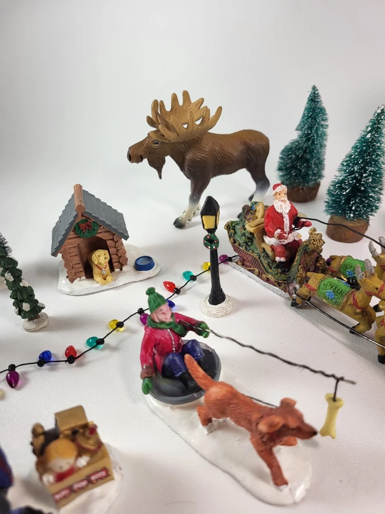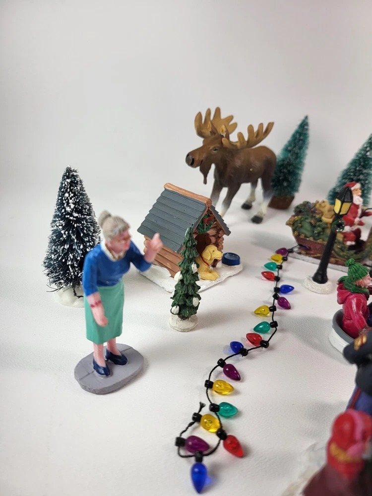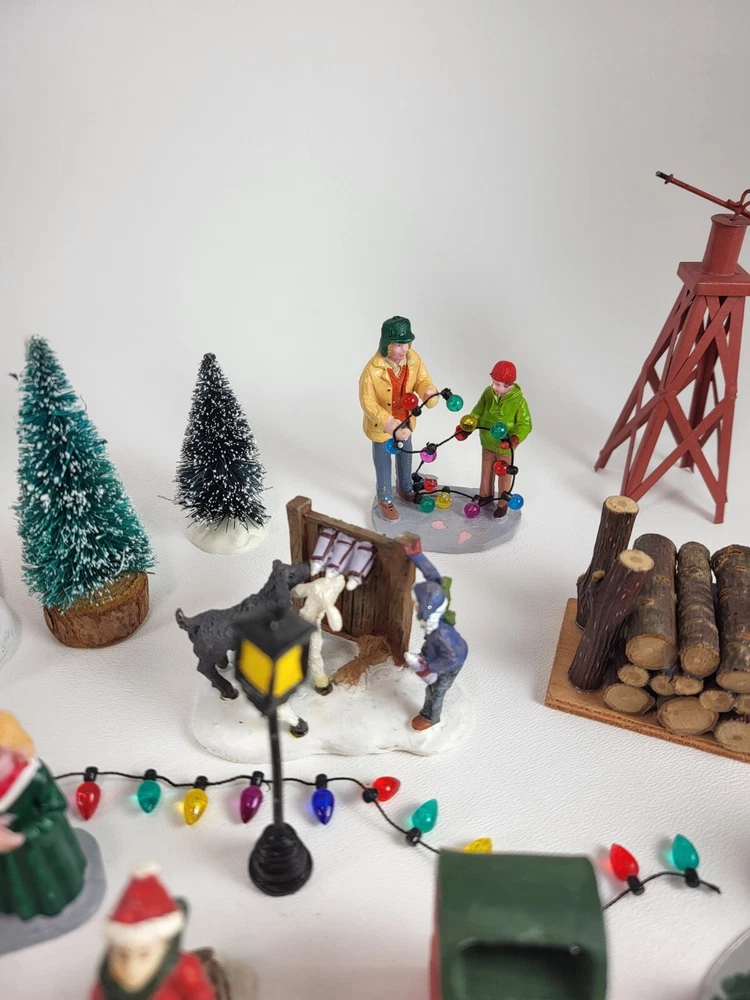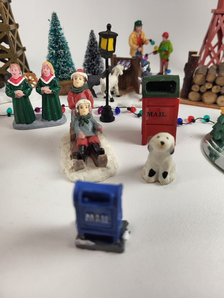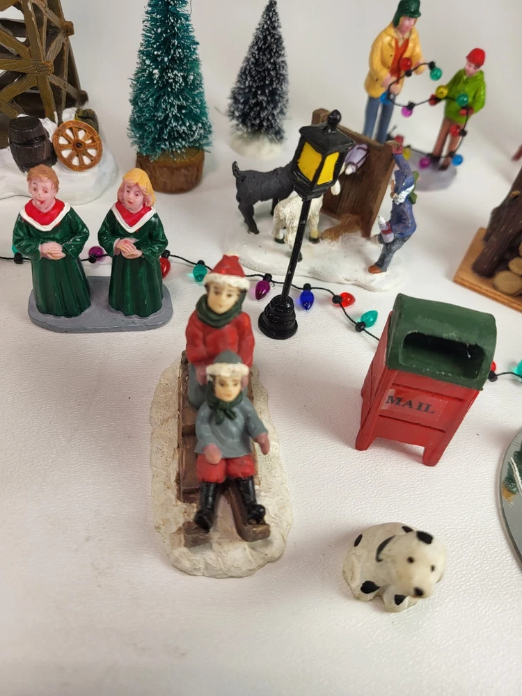 The product is a xlarge lot of 32 assorted pieces for a Christmas village display. The pieces include various village people, trees, a mailbox, a dog, Santa Claus, and an ice ring etc. This collection is ideal for creating a festive and lively Christmas village scene.